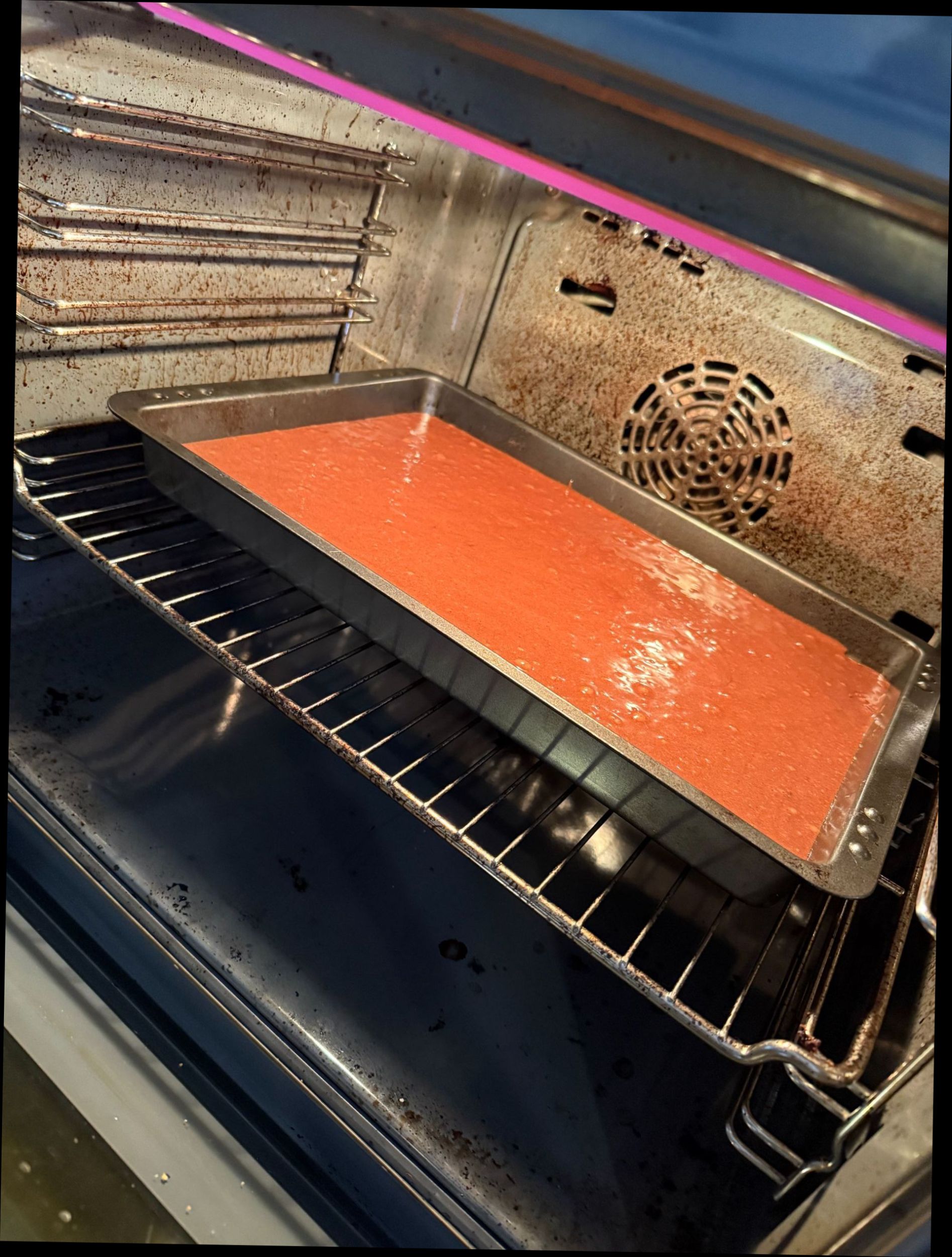 Ein Backblech mit Backpapier auslegen. Den Backofen auf 180 Grad Ober-/Unterhitze vorheizen. Teig auf ein viereckiges Blech verteilen.