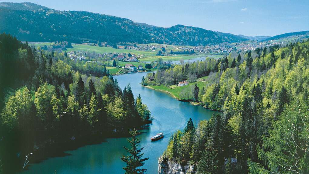 La Chaux-de-Fonds, Neuenburg / Saint-Ursanne, Jura. Die gemütliche Ausfahrt in den Jura führt an den Grenzfluss Doubs. Direkt am Ufer mundet im Maison Monsieur das feine Mittagessen ganz besonders. Die Schönheit des Doubs und des alten Städtchens Saint-Ursanne zieht Besucher in den Bann.