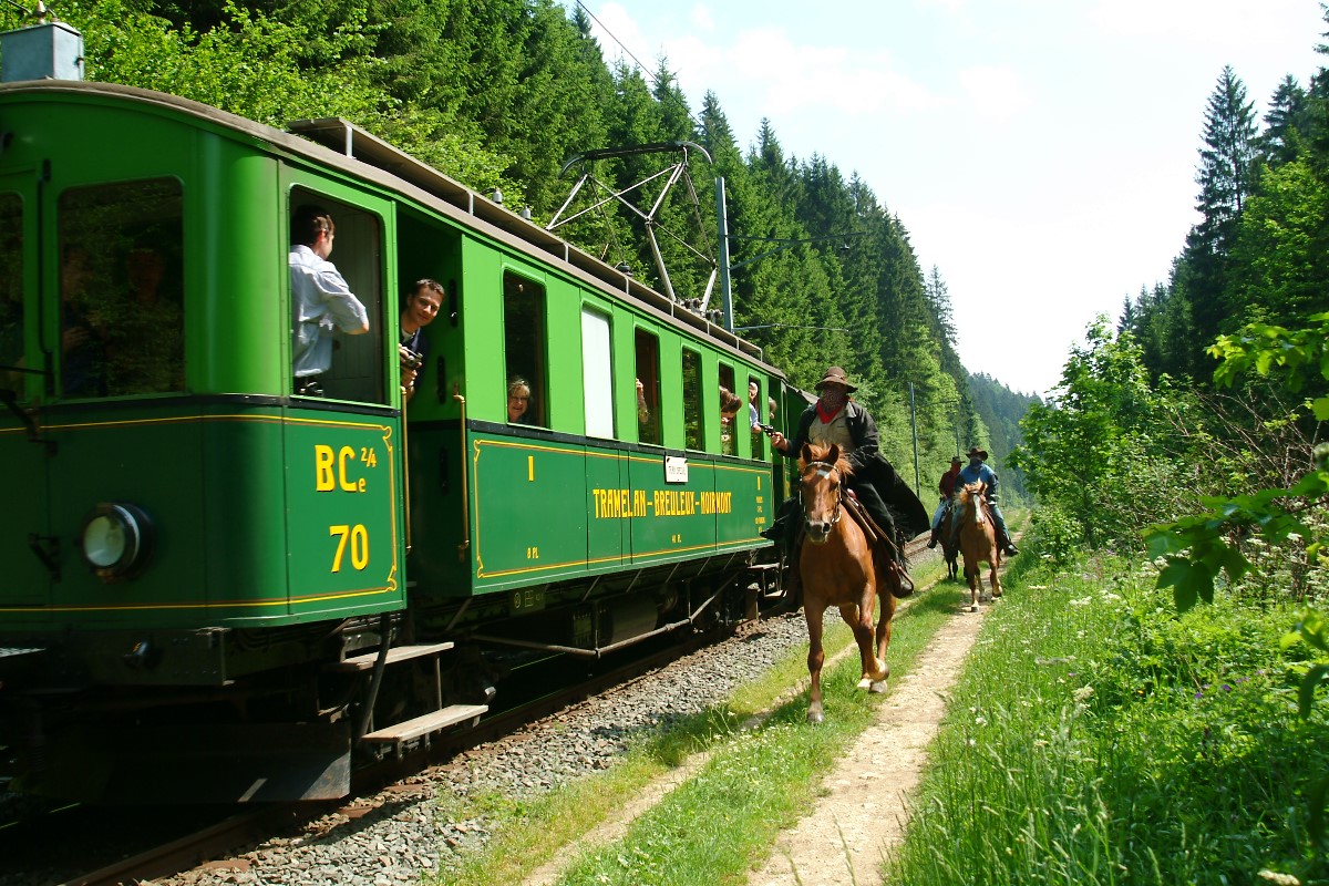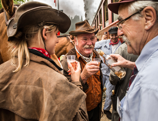 Freiberge, Jura. Gemütlich tuckert der Nostalgiezug durch den Jura. Doch plötzlich: Überfall! Berittene Banditen tauchen auf und sorgen für Wildwest-Action. Nachdem die Geisel befreit ist und die Aufregung vorüber, kann beim Barbecue herzhaft zugegriffen werden.