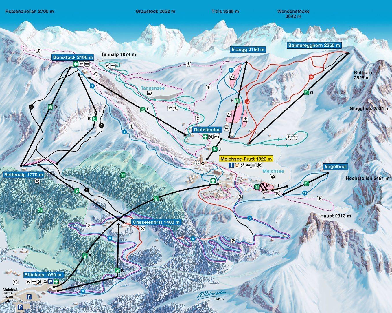 Das Wintersportgebiet Melchsee-Frutt ist autofrei und erstreckt sich von 1080m bis auf 2255m. Das Hochtal mit seinen sonnigen Winterwanderwegen und Loipen wird flankiert von zwei Skigebieten: Das Balmeregghorn und Erzegg. Hier befinden sich breite und sonnige Pisten sowie der Freestylepark fruttpark.ch. Steilere Pisten führen vom Bonistock über mehr als 1000 Höhenmeter hinunter zur Stöckalp. Auch Schlittler kommen auf der 8 km langen Piste nach Stöckalp auf ihre Kosten.