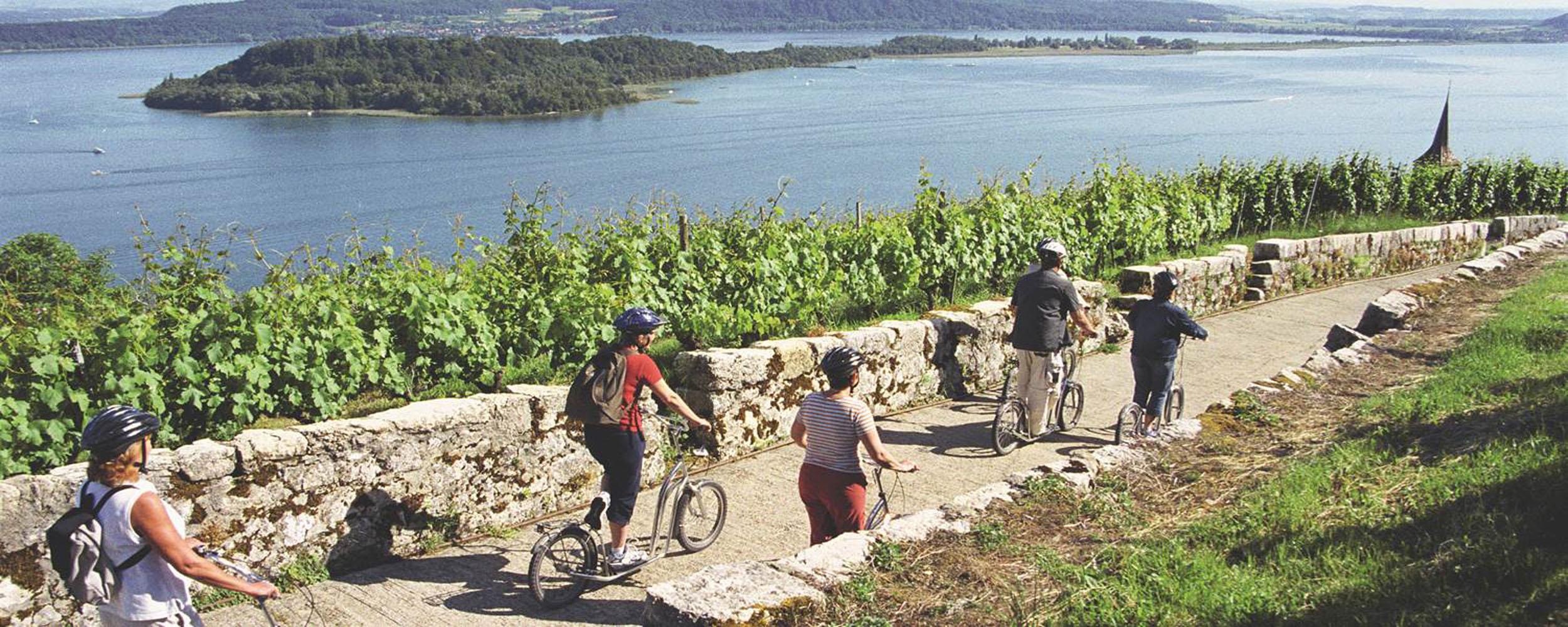 Ein rasanter Spass mit dem Trottinett durch die Rebberge, mit wunderbarem Blick auf den Bielersee und die Alpen. Abgerundet wird das Erlebnis mit einem Apéro beim lokalen Winzer und einem köstlichen Mittagessen.