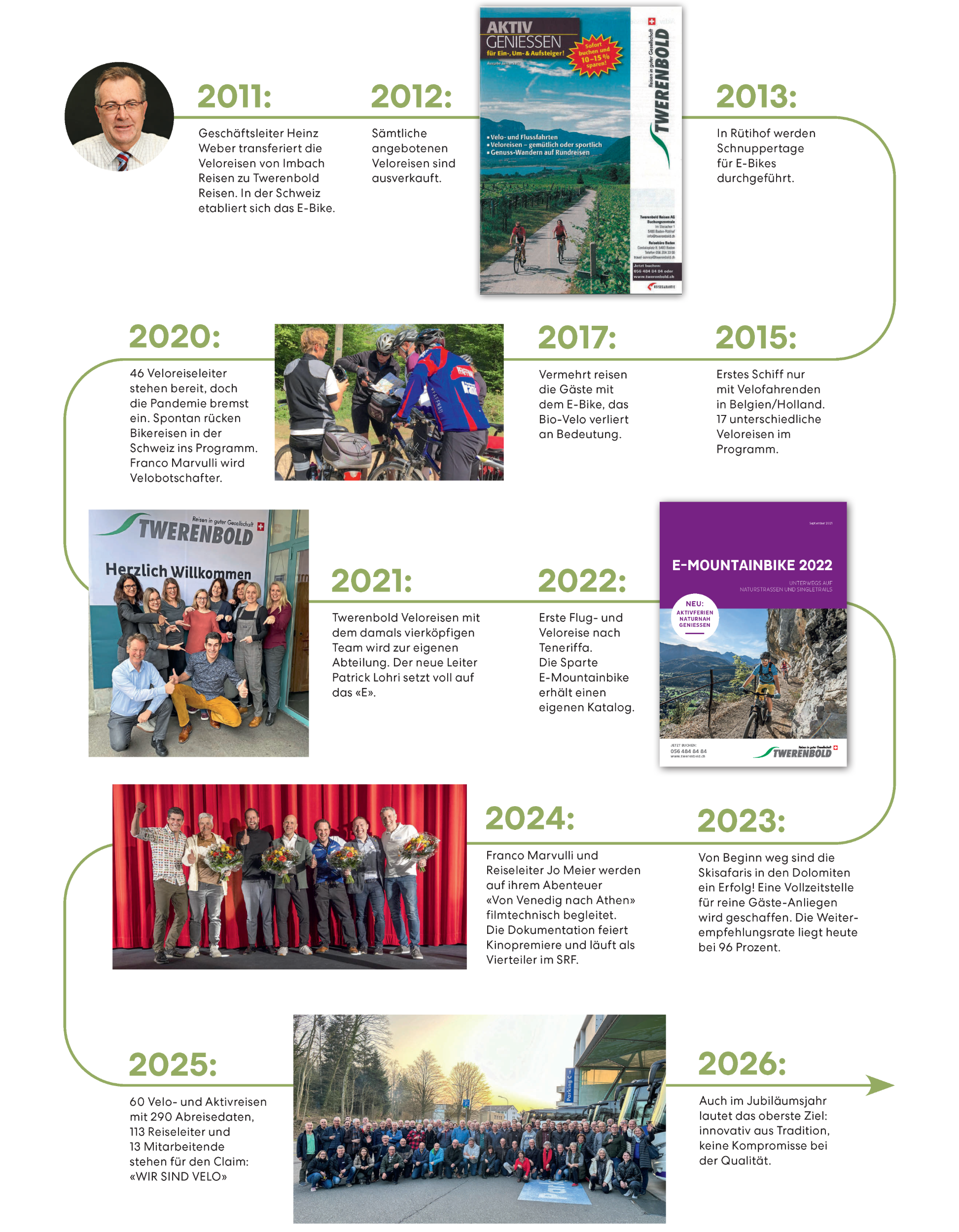 Während 28 Jahren leitete Heinz Weber als Geschäftsführer erfolgreich die Geschicke von Twerenbold. 2017 trat er zurück – oder wie er damals selbst augenzwinkernd erklärte: «zur Seite» – denn er ist im Twerenbold-Universum bis heute in diversen Funktionen anzutreffen, unter anderem auch als Velo-Reiseleiter.