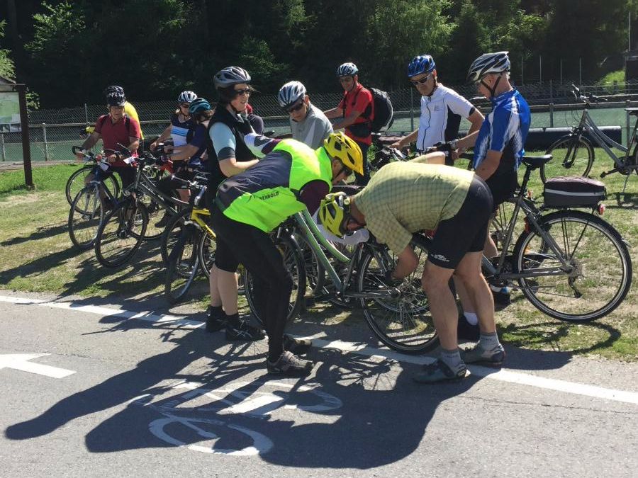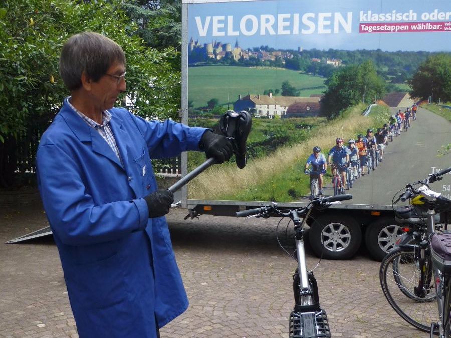 Bevor wir die erste Etappe in Angriff nehmen, stellen wir die Mieträder auf die einzelnen Velofahrer ein. Für die Flyer-Fahrer gibt es eine Kurz-Instruktion. Am zweiten Tag kontrolliert Reiseleiter Hanspeter während der Fahrt, ob Höhe des Sattels und der Lenkstange stimmen. Mein Tourenvelo und ich haben den Test prompt nicht bestanden: ich könne glatt als Easy Rider durchgehen, viel zu hoch sei der Lenker, meint Hanspeter. Zum Glück steht da noch ein Reserverad im Veloanhänger. Welch ein Luxus! So starte ich ab dem Folgetag mit einem Countrybike und kann nun viel besser auf- und absteigen.