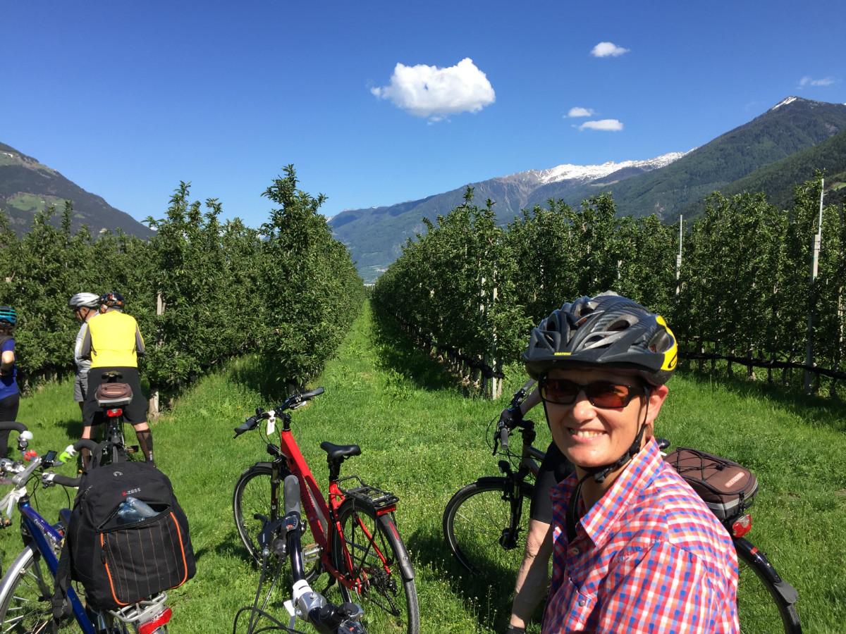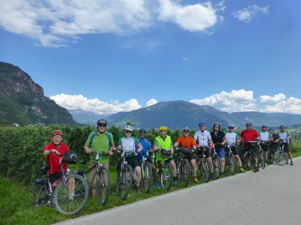 Unsere Reiseleiter Joe und Hanspeter begrüssen jeden Teilnehmer persönlich und stellen sich am Mikrofon kurz vor. Das schätze ich sehr. So kommt es mir bald vor, als würde ich die zwei schon lange kennen. Während der Fahrt verteilen sie uns ein Velotrikot, welches wir von der Firma Twerenbold als Geschenk erhalten. Bei unserer Ankunft im Südtirol stösst der dritte Reiseleiter dazu: Der einheimische Romed weiss sehr viel aus der Region zu berichten; sei es über Landwirtschaft, Politik oder über die turbulenten Zeiten der vergangenen Jahrhunderte.