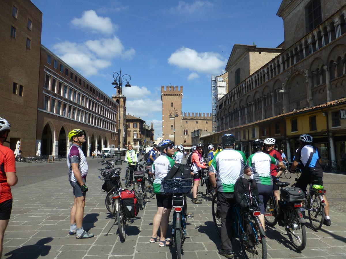 In Meran herrscht mediterranes Wetter: 30 Grad blinkt es auf einer Anzeige! Wir parkieren die Velos bei der Therme. Dort holt uns eine Stadtführerin ab, um uns die reizende Kleinstadt näher zu bringen. Dem einen oder anderen wird es dann doch etwas zu kopflastig und er oder sie taucht in der flanierenden Menge unter, um die Stadt auf eigene Faust zu erkunden. Im Vorfeld hatte ich schon viel Schönes von der Velostadt Ferrara gehört, dessen Stadtkern zum UNESCO-Welterbe zählt. Mit einer Stadtführerin erkundeten wir am 5. Tag die Altstadt per Velo. Die sehr belesene Führerin war in ihrem Element und erzählte vor allem von der Herrscherfamilie Este vom 14.-16. Jahrhundert.