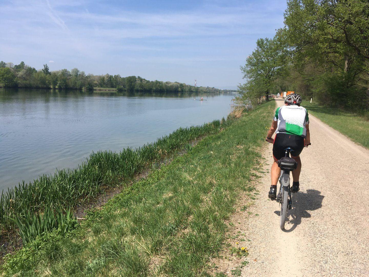 Die Route führt entlang dem kleinen Kanal de Hunigue bis zur grossen Abzweigung des Rhein-Rhône Kanals. Von hier kann man auf dem Wasserweg bis ans Mittelmeer gelangen. Weiter geht die Fahrt durch die Auenwälder nördlich bis zum Kaffeehalt auf deutscher Seite in Neuenburg am Rhein. Für einen Kaffeehalt bietet sich das Städtchen ideal an. Vor der Brücke geht’s wieder in den Auenwald. Hier entlang dem Grand Canal d’Alsace wurde viel in die Renaturierung investiert. Riesige Becken wurden ausgehoben, um dem Fluss bei Hochwasser wieder mehr Platz zu geben und auch um die Schifffahrt sicherer zu machen. Vor Breisach am Rhein, in Sichtweite des Schiffsanlegers, hat es direkt am Radweg ein Restaurant mit grosser Terrasse, auch im Städtchen gäbe es genügend Restaurants für die Mittagspause. Von hier radeln wir wieder über die Brücke nach Frankreich. Ein längeres Stück der Route führt hier über eine mässig befahrene Landstrasse. Bald sind wir am Ziel im Hotel Europe in Horbourg-Wihr. Heute haben wir das Elsass als Region des Wassers und der Landwirtschaft erlebt. Die Strecke war nur flach. Das Hotel verfügt über ein Hallenbad und Sauna und eine Rasenfläche mit Liegestühlen, die zum Ausruhen nach dem Tag im Sattel einladen.