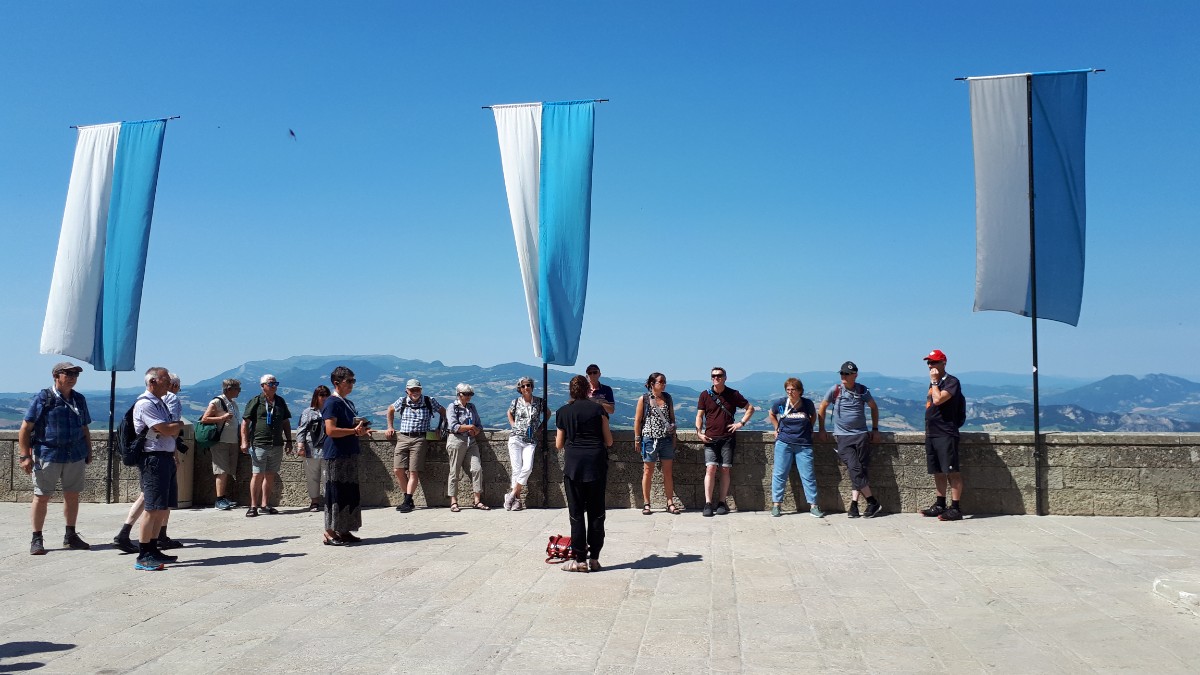 Am Tag 3 erwartete uns die Reiseführerin in San Marino, der ältesten bestehenden Republik der Welt. Wir hatten gut Zeit die stattlichen, historischen Bauten, wunderschöne kleine Gassen und die eindrückliche Weitsicht zu bewundern. Im Laufe des Nachmittags besuchten wir den Weinbaubetrieb der Familie Tondini. Mit viel Liebe bewirtschaftet die Familie ihre Bio-Reben. Den feinen Wein durften wir degustieren und natürlich auch kaufen. Dazu wurden wir mit verschiedenen selbstgemachten Köstlichkeiten verwöhnt. Und wieder brachte uns Martin vom Hotel zur Stadt zu einem feinen Nachtessen. Der Name des Restaurants Ca’de Ven (casa del vino) machte ihm alle Ehre, waren doch die Wände nicht mit Büchergestellen, sondern mit Weingestellen bedeckt – und wieder zurück zur Hotelbar.