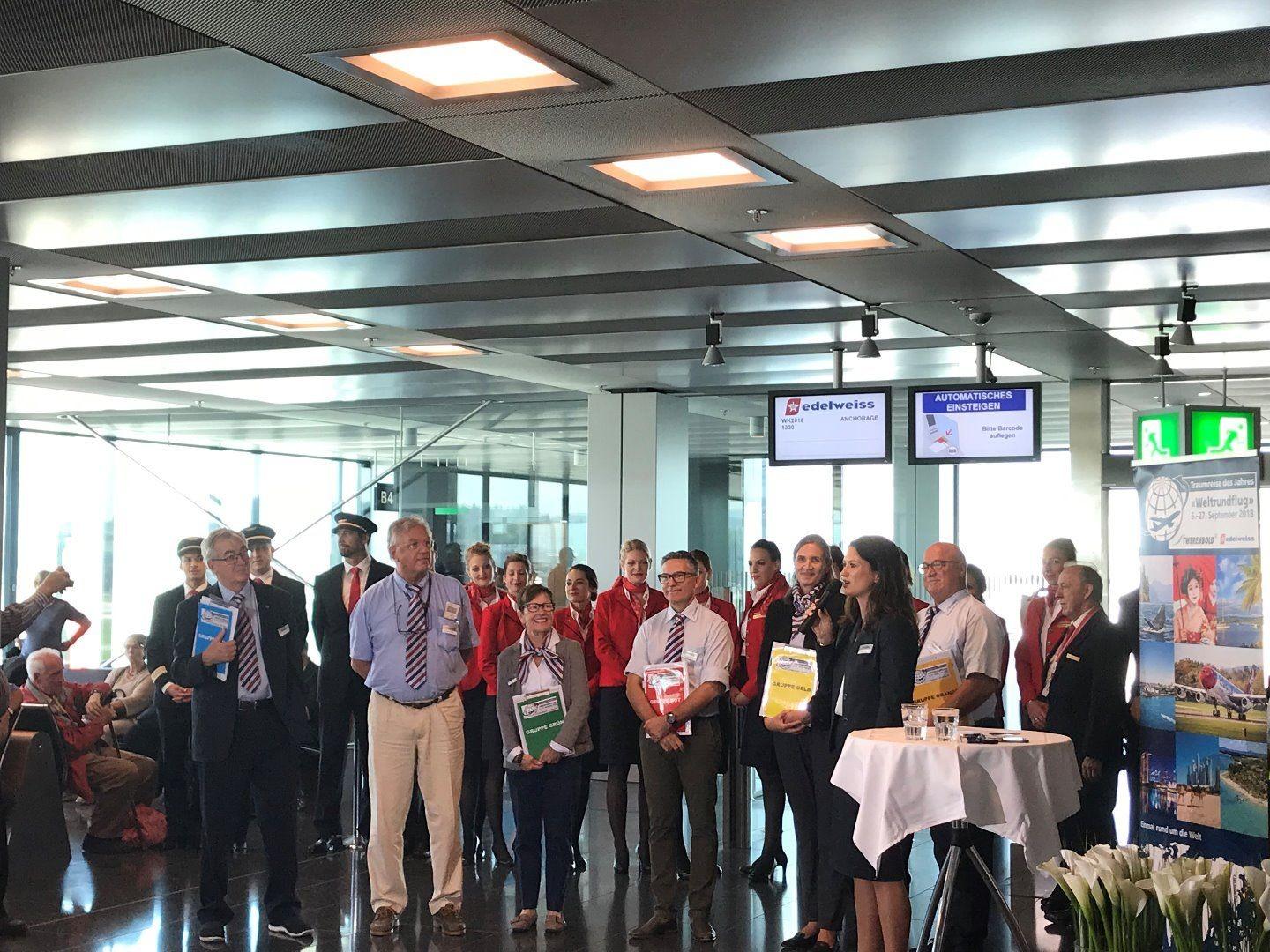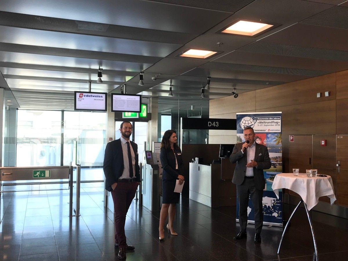 Endlich ist es soweit: Das Warten aller Beteiligten hat ein Ende und der Weltrundflug hebt ab. Alle sind bereit und die Vorfreude ist gross. Beim grossartigen Abflugs-Event am Flughafen Zürich wurden unsere Weltreisenden verabschiedet! Das Abenteuer fängt an...
