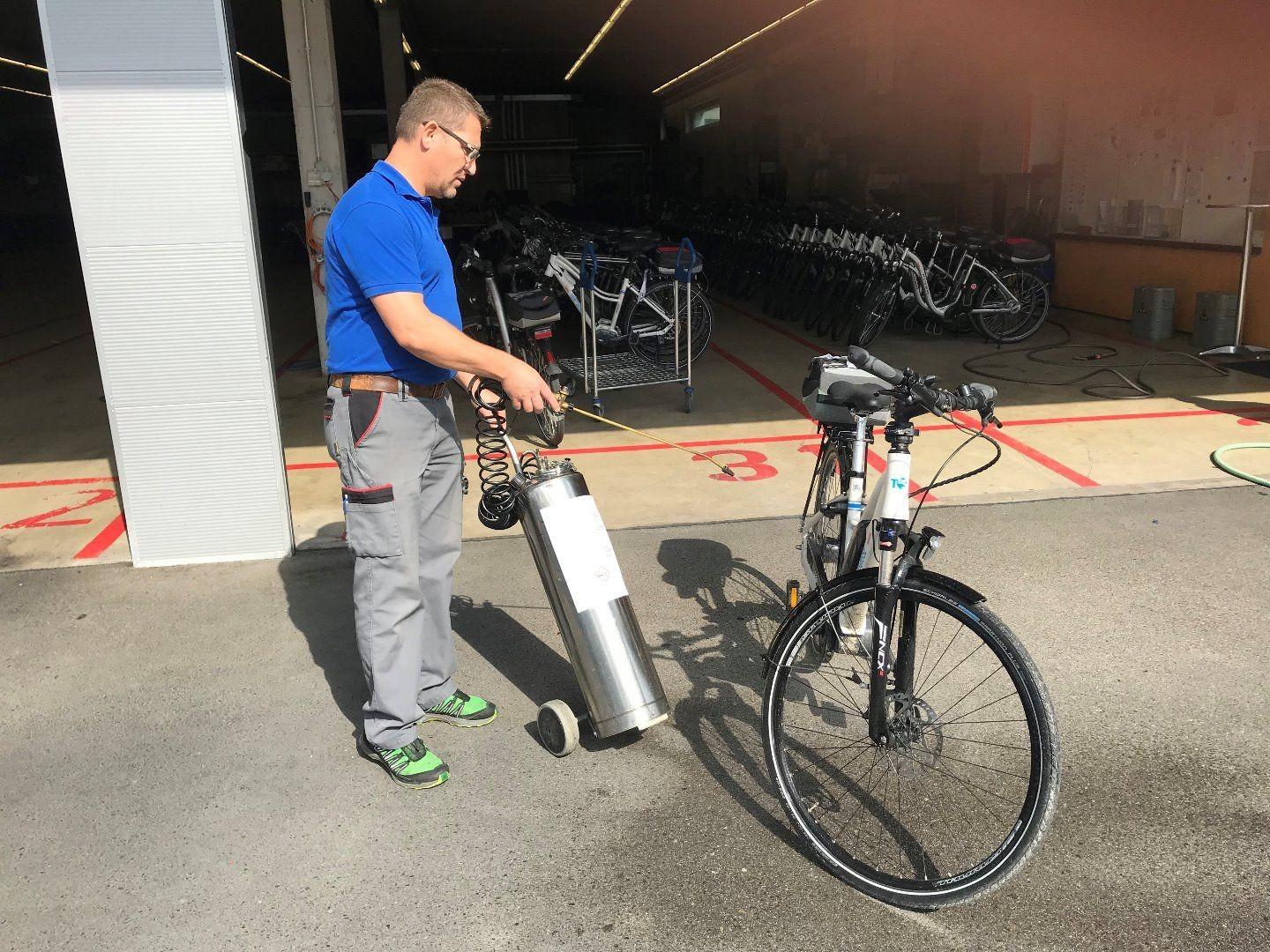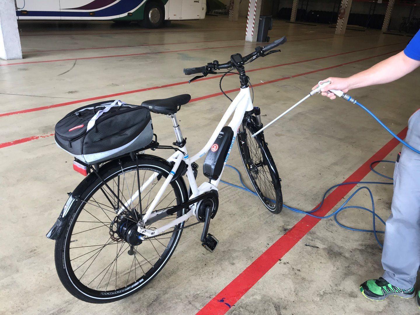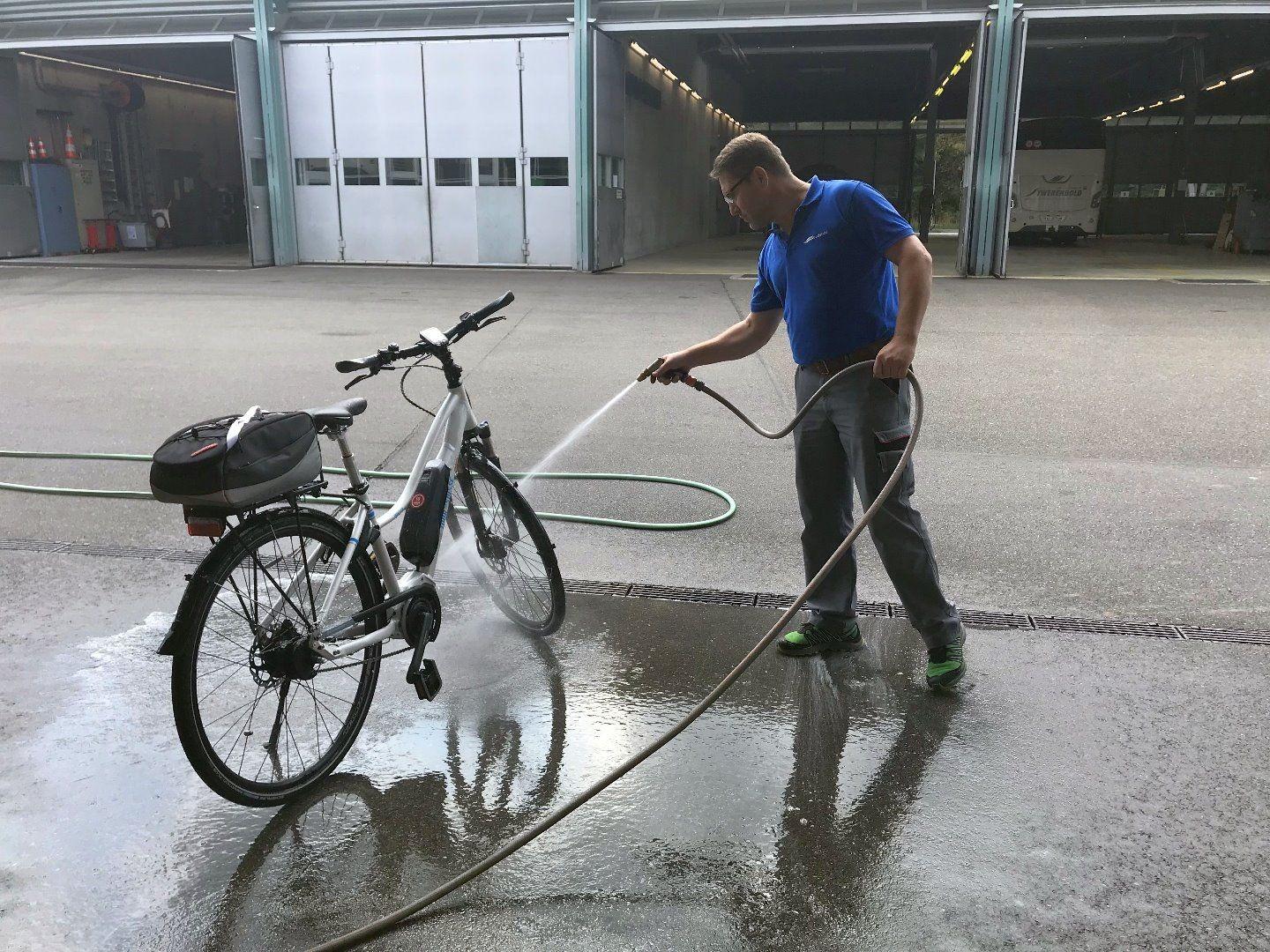 Damit die Velos beim Start der nächsten Reise wieder wie neu glänzen, werden sie nun noch gründlich gereinigt. Als erstes werden sie mit wenig Druck berieselt. Danach mit dem Hochdruckreiniger gründlich gereinigt und anschliessend getrocknet. Die Velos werden nach der Wartung und Reinigung bereits wieder nach Reise einsortiert und bereitgestellt, damit sie dann rechtzeitig vor Abreise wieder verladen werden können.