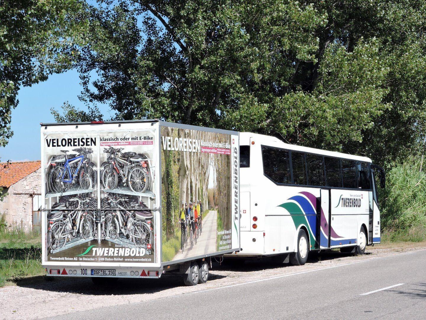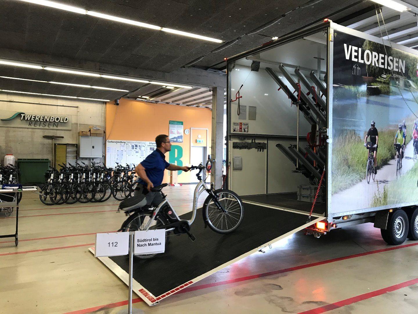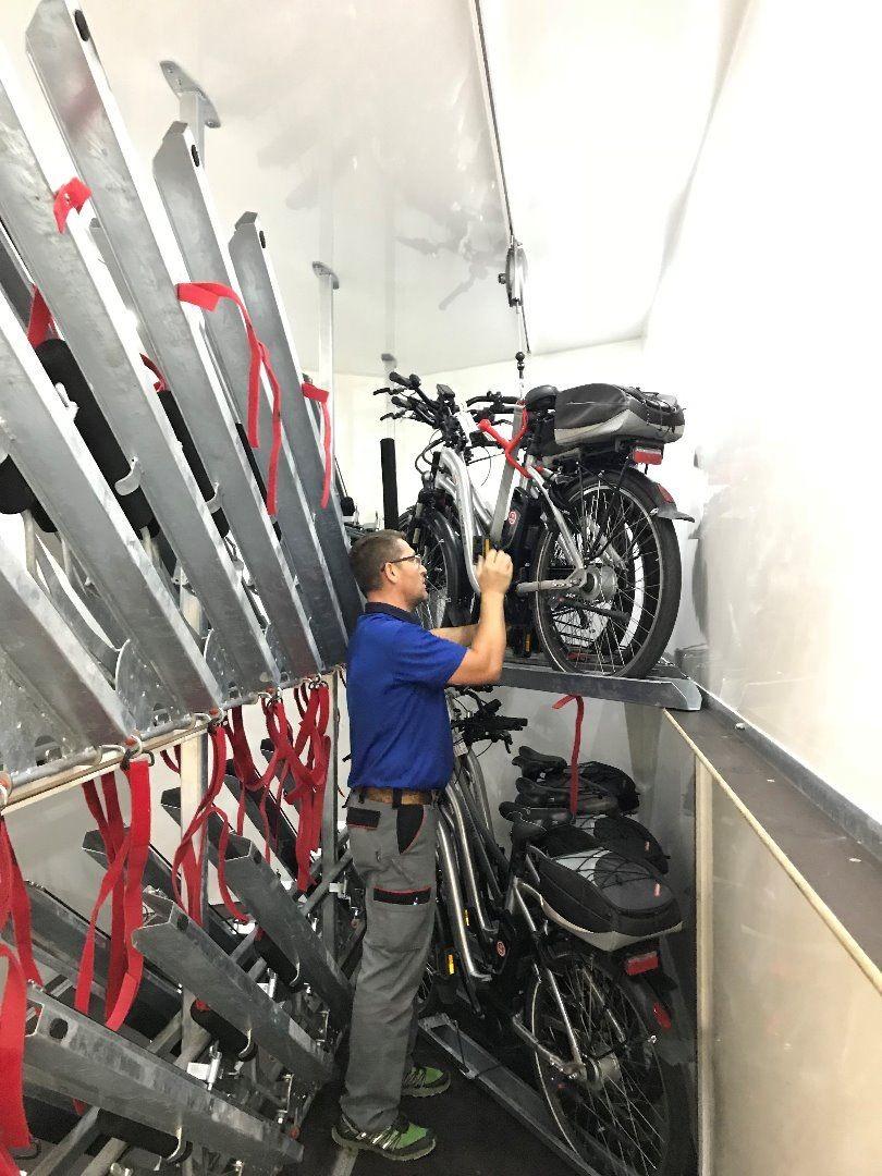 Kurz vor Abreise werden die Velos dann sorgfältig in die entsprechenden Anhänger verladen. Dabei muss nochmals kontrolliert werden, dass für jede Reise die richtigen Velos und vor allem auch in der bestellten Grössen verladen werden. Um Transportschäden zu vermeiden, müssen alle Velos exakt verladen und gut befestigt werden.