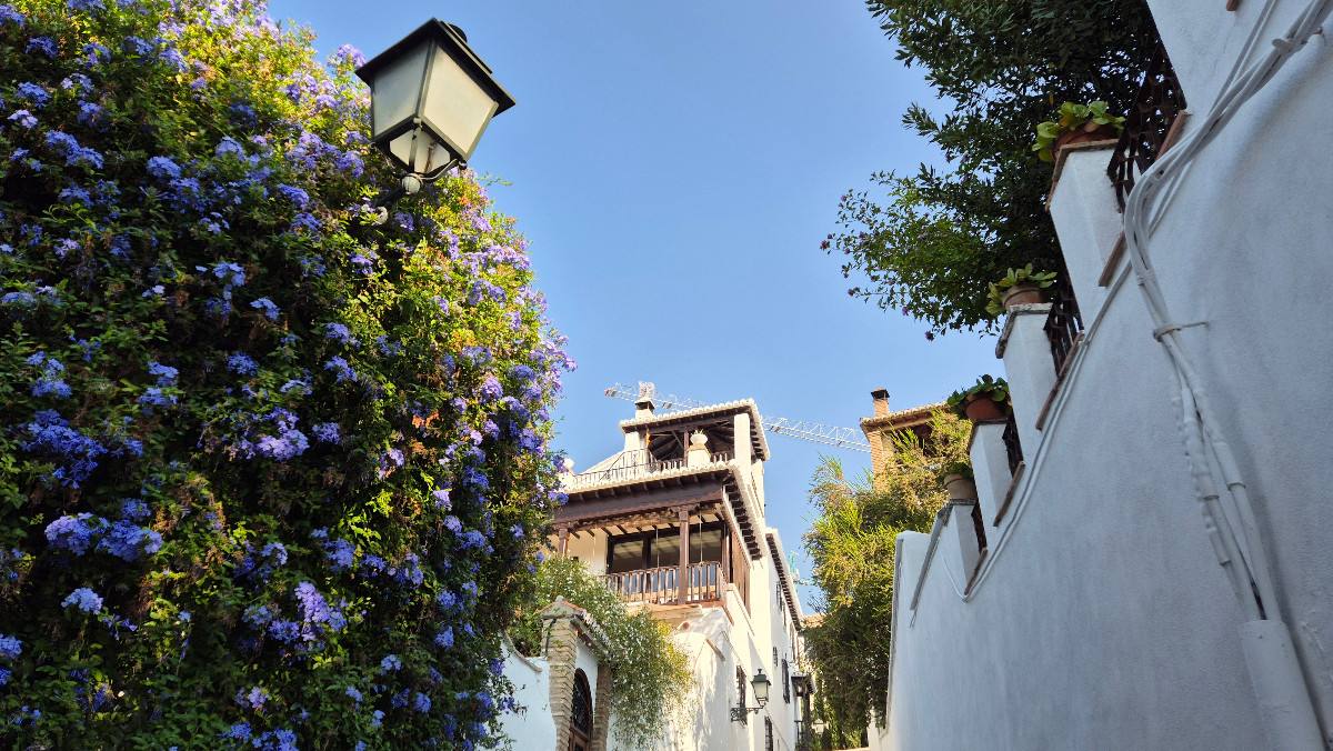 Martin holt uns mit dem Bus ab, und wir fahren ins Stadtviertel Albaicín. Unser Reiseleiter Pedro führt uns durch die malerischen Gassen des ältesten Stadtteils von Granada. Es gibt viel zu entdecken: Häuser, die mit kunstvollen Keramiktellern dekoriert sind, hübsche Balkone, duftende Blumen und detailreich geschnitzte Haustüren. Mit seiner angenehmen Stimme erzählt Pedro viele informative Geschichten und Anekdoten.