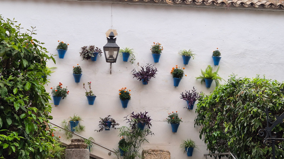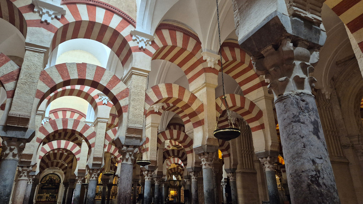 Während einer Stadtführung erfahren wir mehr über die Geschichte Córdobas und entdecken einige wunderschöne Innenhöfe, die mit blauen Blumentöpfen geschmückt sind. Danach besuchen wir die Mezquita-Catedral. Die ehemalige Moschee, die heute eine Kirche ist, fasziniert mit ihren rot-weiss gestreiften Bögen. Die Halle scheint endlos, Bogen um Bogen welche sich in weitere Bögen verlaufen. Unsere Stadtführerin María erklärt, dass der Kirchturm um das damalige Minarett herum gebaut wurde, welches man noch immer erkennen kann.