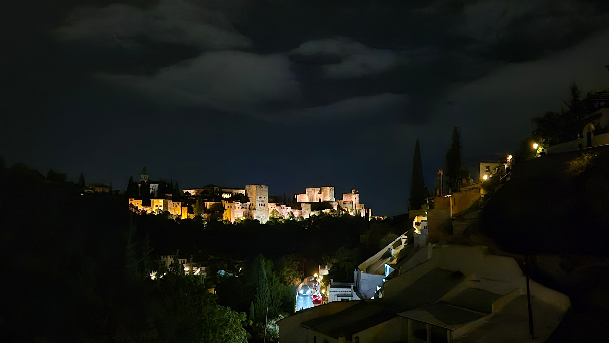 Bevor wir ins Hotel zurückkehren, gehen wir noch ein Stück höher hinauf und geniessen einen atemberaubenden Blick auf die nächtlich beleuchtete Alhambra – ein gelungener Abschluss!
