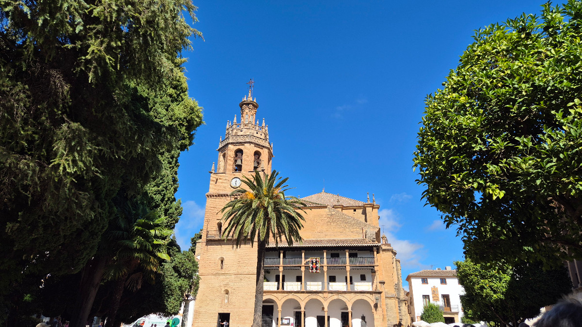 Unser nächster Stopp ist die Kirche Santa María la Mayor. Von aussen verleiht die Palme vor der Kirche ihr ein tropisches Flair, und im Inneren sind wir beeindruckt von den opulenten Dekorationen und dem grossen Kronleuchter. Jesús nimmt uns auch mit auf das Dach, von wo aus wir nach 72 Stufen die Aussicht über die Dächer der weissen Häuser Rondas geniessen können.