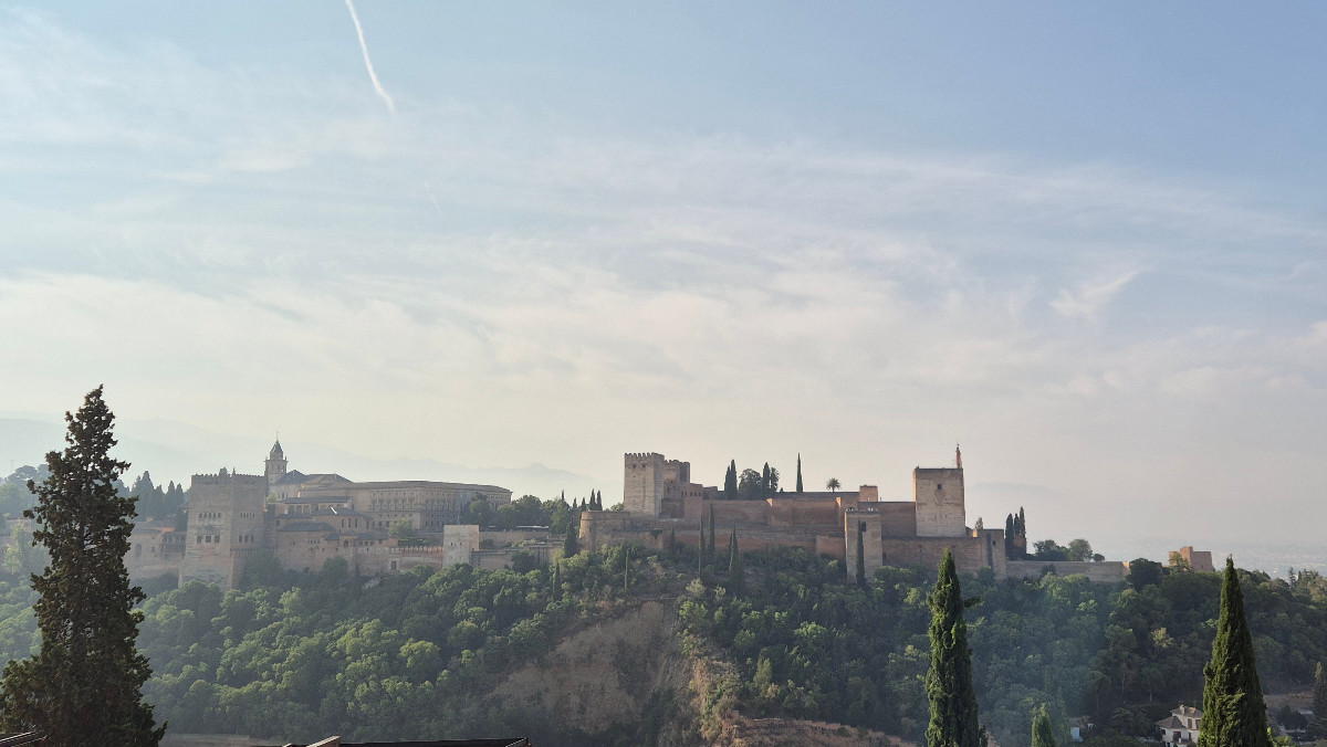 Auf einer Aussichtsplattform geniessen wir einen atemberaubenden Blick auf die Alhambra, die majestätisch auf dem gegenüberliegenden Hügel thront – eine Sehenswürdigkeit, die wir heute Nachmittag besuchen werden.