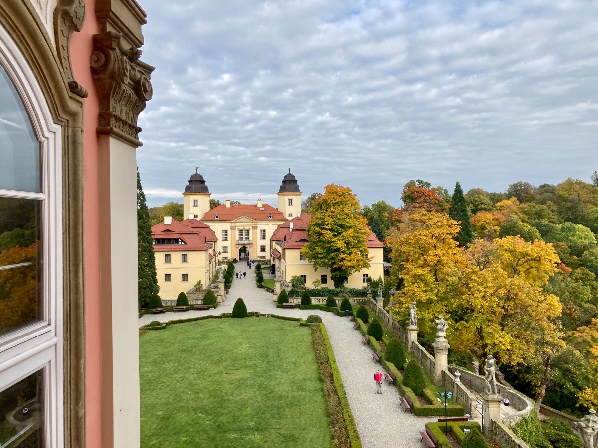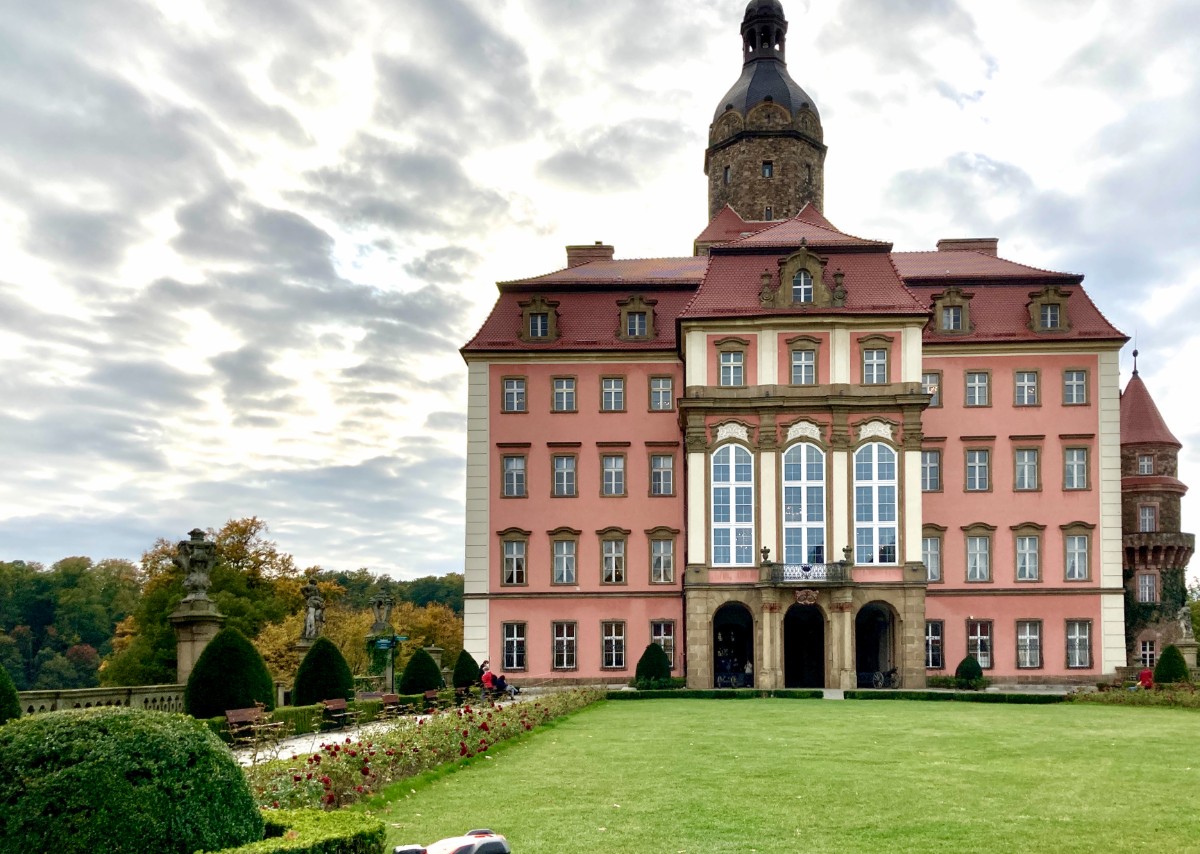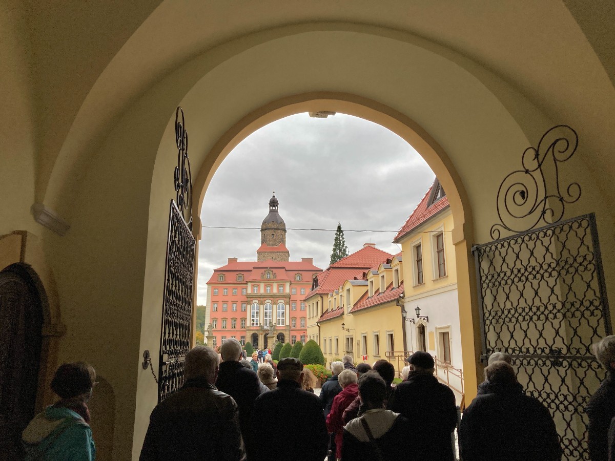 Die originelle Gaststätte mit der freundlichen Bedienung neben der Kirche entschädigt uns etwas für das abrupte Konzertende. Unsere Besichtigungstour geht weiter westlich nach Walbrzych (Waldenburg), zur Burg Fürstenstein. Durch einen riesigen Park im herbstlichen Blätterkleid, gelangen wir zu den herrschaftlichen Gebäuden. Durch die prägnanten Eingangstürme spazieren wir zum Schloss oder Burg Fürstenstein. Mit Audiogeräten eingedeckt, kann jeder das Schloss bequem in seinem persönlichen Tempo erkunden. Die einen sind schon durch die langen Korridore und Säle gerannt, da stehen die anderen noch beim ersten Objekt und horchen andächtig den entsprechenden Erklärungen. So wundert es nicht, dass wir nach dem Rundgang auf einen einzelnen Reisegast warten müssen, der noch ganz gedankenversunken im Schloss verweilt. Wir sind froh, als er heil auftaucht und sich nicht in einem dunklen Verlies der Burg verirrt hat.