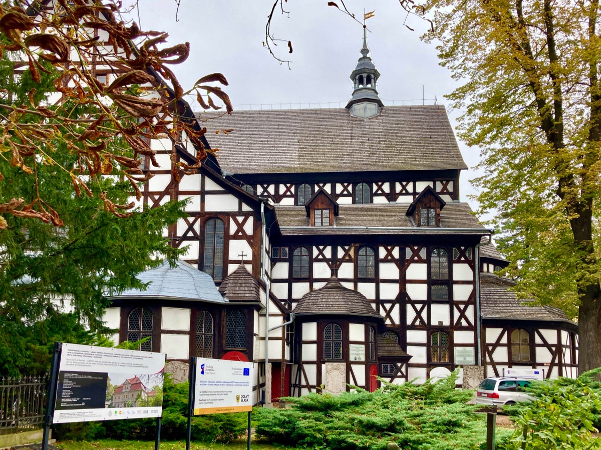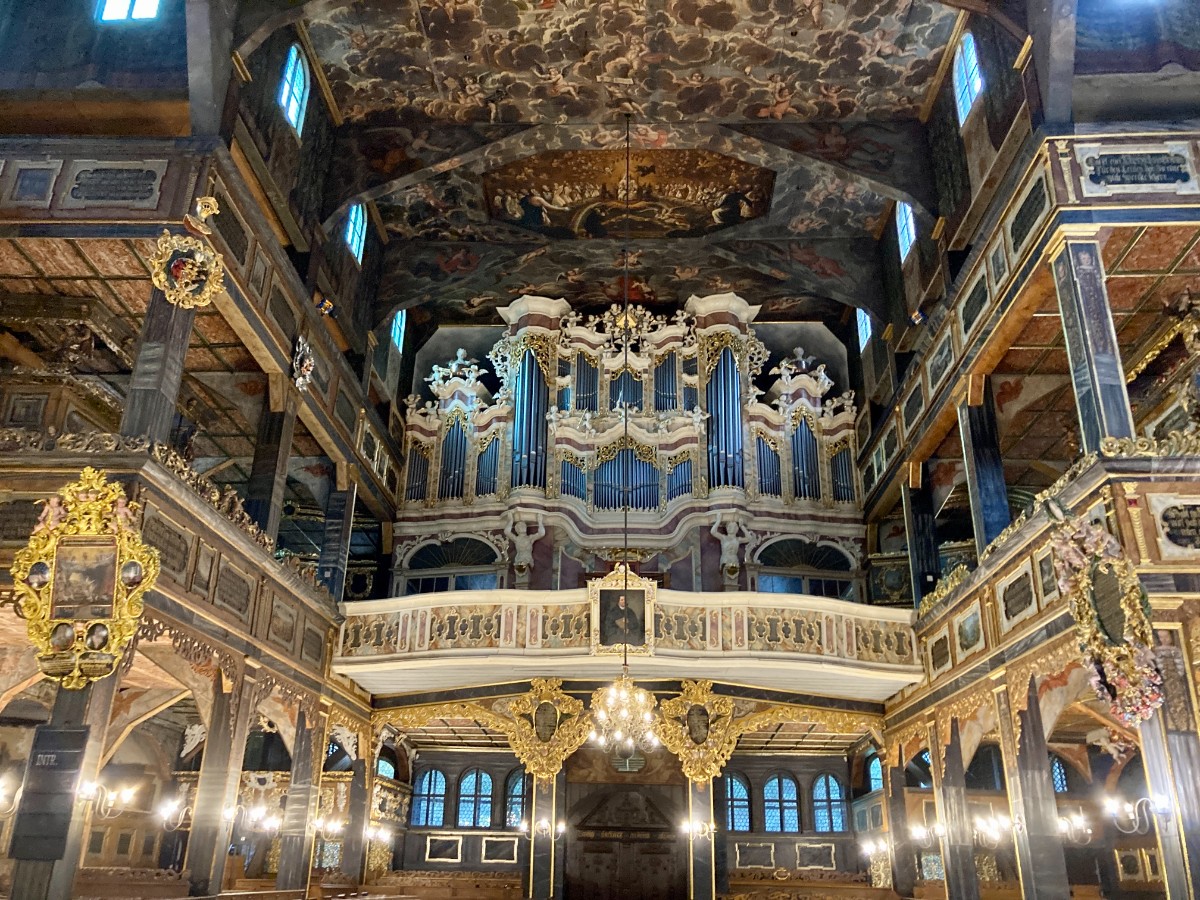 Um 10 Uhr machen wir uns auf den Weg nach Schweidnitz, das westlich von Breslau liegt. Während der Fahrt bringt uns unsere heutige Reiseleiterin Kristina die Region Schlesien etwas näher. Stolz erzählt sie von den zahlreichen Bodenschätzen und dem fruchtbaren, topfebenen Kulturland. In rund einer Stunde erreichen wir die Friedenskirche in Schweidnitz. Sie ist die grösste Fachwerkkirche Europas. Das etwas bescheidene Äussere täuscht über den Innenausbau der Kirche: es erschlägt mich fast, als wir in das prunkvolle Kirchenschiff eintreten. Unbestrittener Blickpunkt ist neben den vielen aus Holz gefertigten Skulpturen, die gigantische Orgel. Der junge Musiker stellt sich kurz vor und beginnt mit dem angekündigten «kleinen» Orgelkonzert. Was er aus diesen grossen und kleinen Orgelpfeiffen lockt! – Sanfte, aufbrausende, lange und kurze Töne – beeindruckend! Er spielt nicht auf der Orgel, er spielt MIT der Orgel. Mit nicht nur konventionellen Stücken, sondern auch mit ganz modernen Passagen begeistert er uns. Leider beendet er das Konzert bereits nach 20 Minuten, was uns alle etwas enttäuscht.