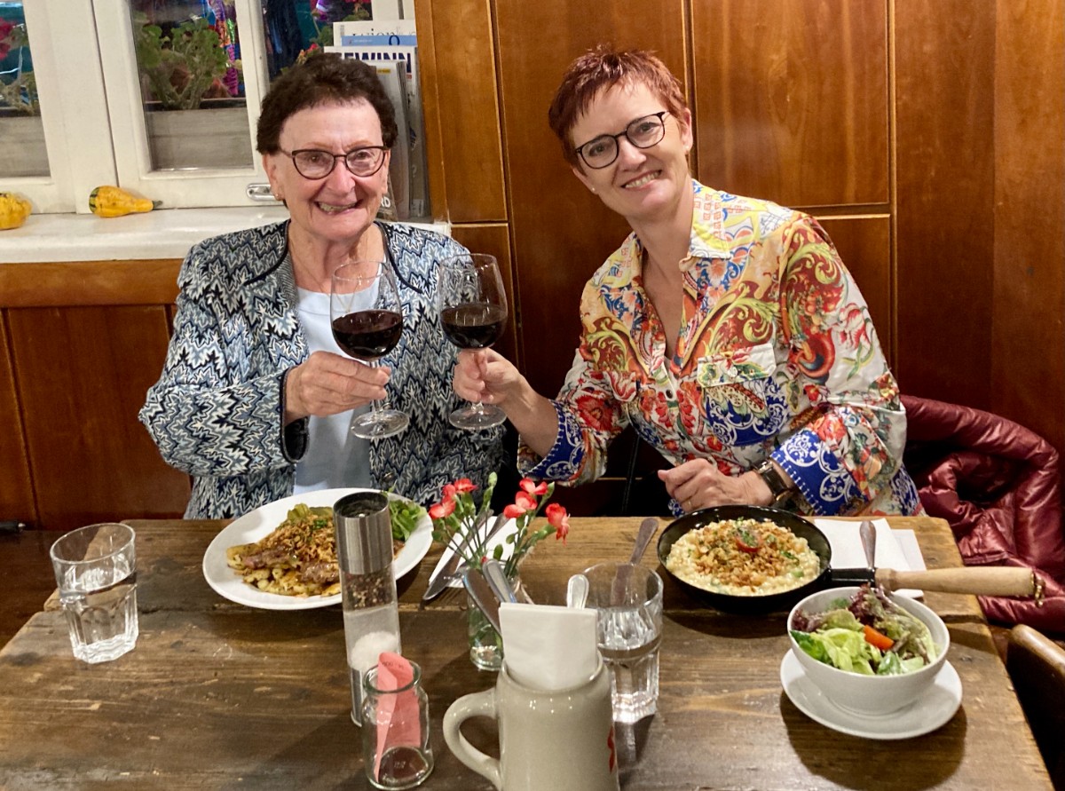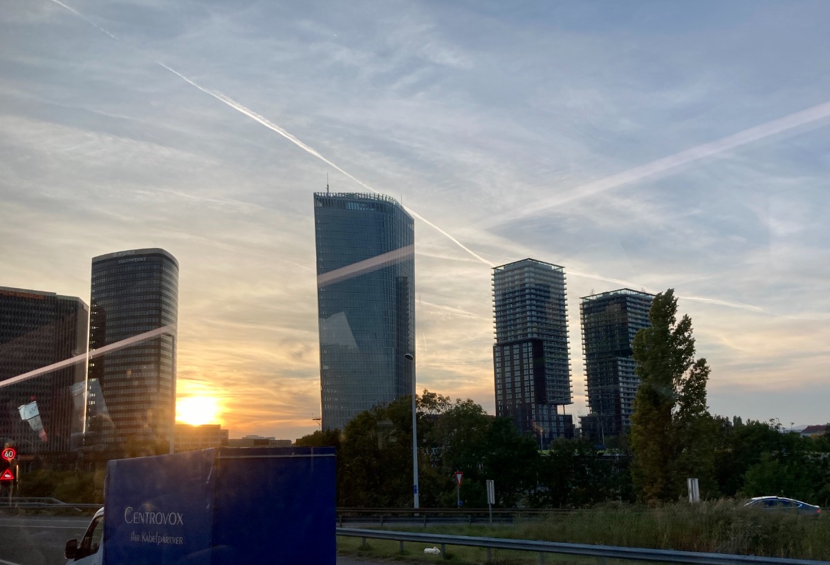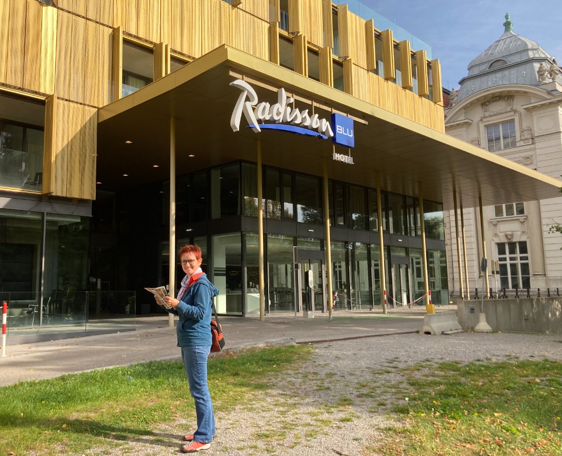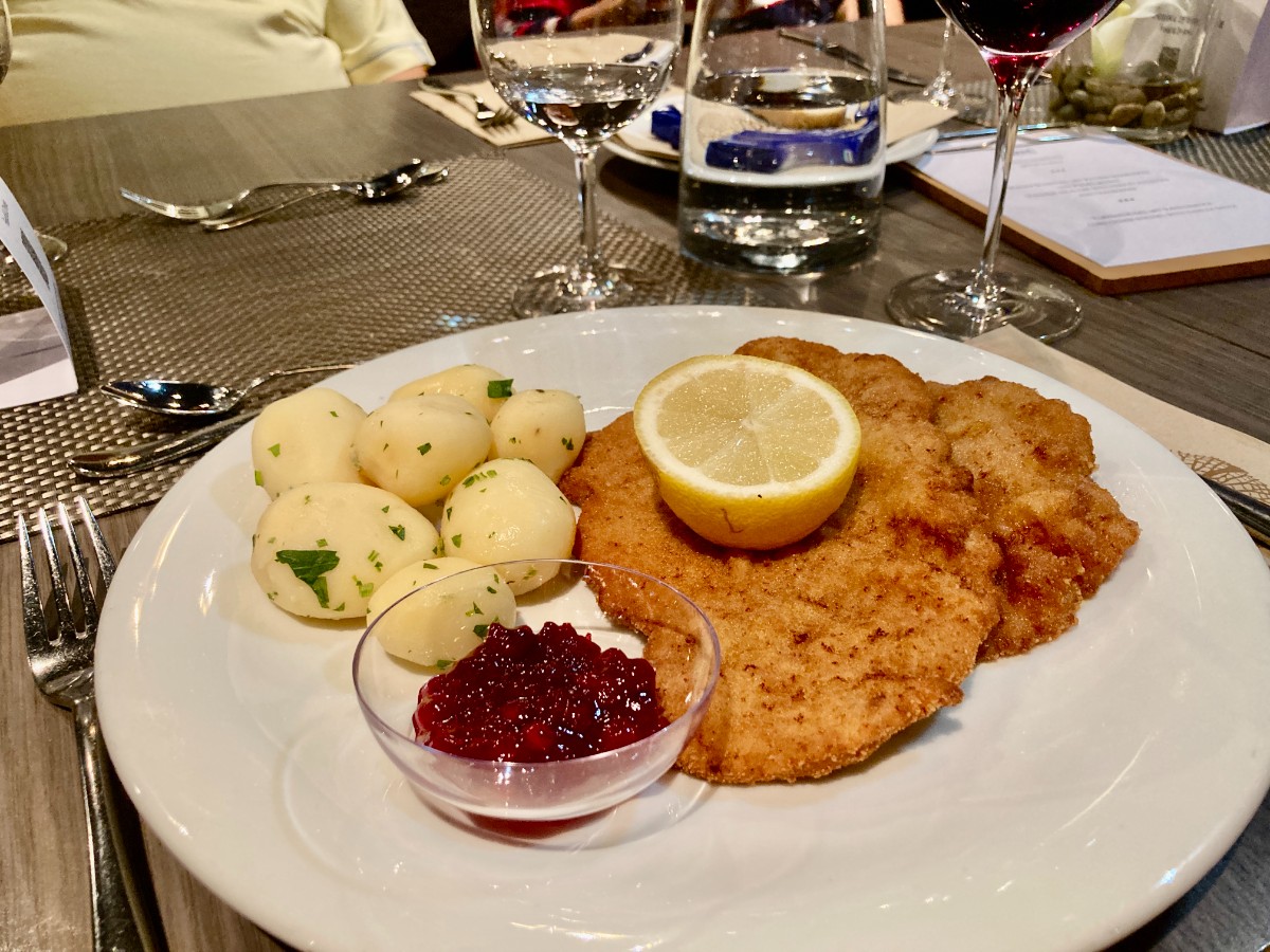 Auf der Weiterfahrt wird es wieder ruhig im Bus, ein Schläfchen in Ehren … spätestens um 17 Uhr sind aber alle wieder wach: Servus Wien! Welch’ atemberaubende Skyline! Es geht nochmals eine ganze Stunde, bis wir durch ganz Wien zu unserem Hotel in den Südwesten der Stadt kommen – Feierabendverkehr halt. Wolkenkratzer in aussergewöhnlichen Formen und Farben bringen uns ins Staunen und machen die Anreise abwechslungsreich und kurzweilig. Strahlende Gesichter gibt es beim Nachtessen, als wir wieder einmal richtig bedient werden und uns nicht selbst am Buffet bedienen müssen. Wozu brauchen wir ein Buffet, wenn es Wiener Schnitzel und zum Dessert Topfenstrudel gibt?
