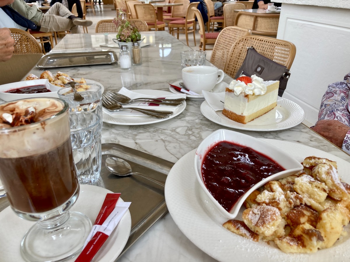 Nach der Stadtrundfahrt bringt uns Michi wieder zum Hotel. Die Gäste ruhen sich aus oder nutzen die ideale Lage am Stadtrand, um dem barocken Schloss Schönbrunn einen Besuch abzustatten. Die ehemalige Sommerresidenz der Habsburger gehört zum Weltkulturerbe der UNESCO. Das Gelände bietet einen wunderschönen Park in dem sich auch der Wiener Zoo befindet. Hoch über dem Park steht, die Gloriette, ein Denkmal, das die Macht und Größe der Habsburger darstellen sollte und für unsere Mini-Gruppe das erklärte Ziel für heute Nachmittag ist. Das Café Gloriette hat ein köstliches Angebot an Kaffeevariationen und Mehlspeise-Kreationen. «Nicht zu viel essen!» hat uns Michi noch auf den Weg gegeben, denn heute soll es ein frühes Nachtessen geben, bevor wir zur Oper gehen ... aber was soll’s, lieber Michi, wir sind in Wien. Wien ohne Kaiserschmarrn, ist doch wie die Schweiz ohne Käse ...