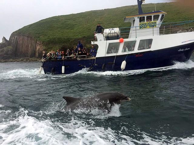Kurz vor Mittag besteigen wir am Hafen von Dingle das Boot, das für uns reserviert worden ist. Wir sind gespannt, ob uns der legendäre Delfin «Funghi» die Ehre erweisen wird – und tatsächlich, schon nach rund zwanzig Minuten ist die Aufregung gross: «Da, da, da ...! Wo? – Da!!!» Welch ein Spektakel, wie Funghi ganz nah am Boot vorbei schwimmt. Er macht zwar keine Luftsprünge wie wir, aber man hat doch den Eindruck, dass er sich über unseren Besuch freut! Die Rückfahrt nahe an den prächtigen, majestätischen Sandsteinfelsen entlang beeindruckt uns ebenfalls. Individuell machen wir in einem der zahlreichen kleinen Restaurants unsere Mittagsrast. Den Kaffee gibt es etwas später im legendären Tork-Hotel in Killarney und schon bald sind wir in Cork, wo unsere heutige Reise endet. Wir haben heute während der Fahrt viel über die Geschichte Irlands und Nordirlands erfahren, ich begreife nun die heutige politische Lage endlich etwas besser.