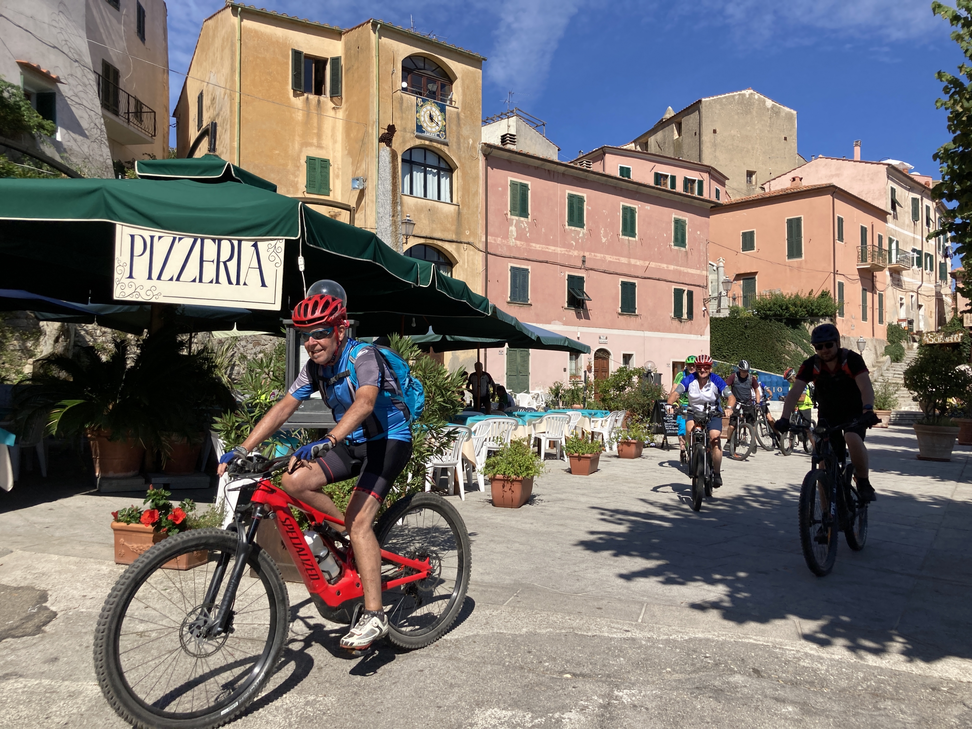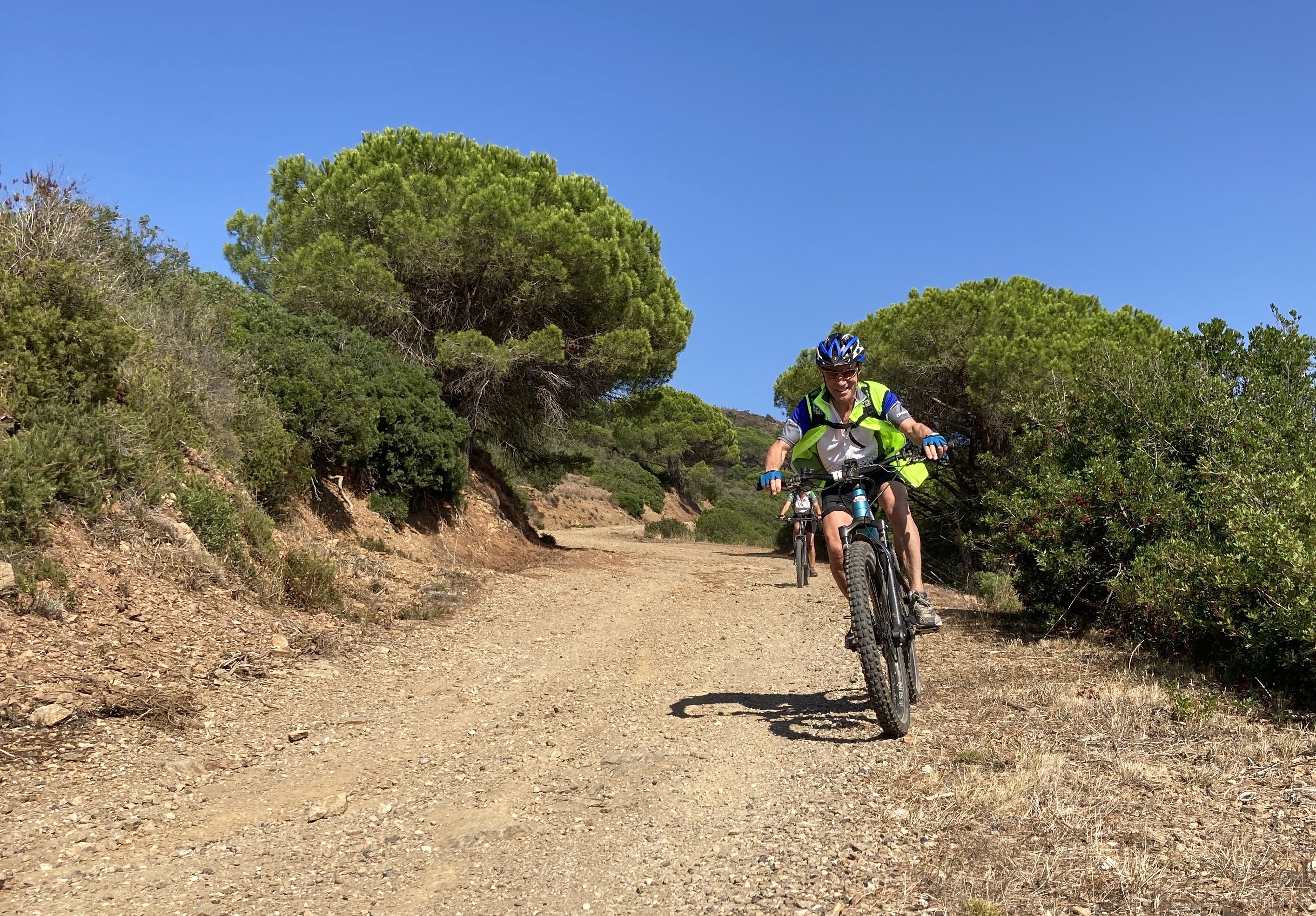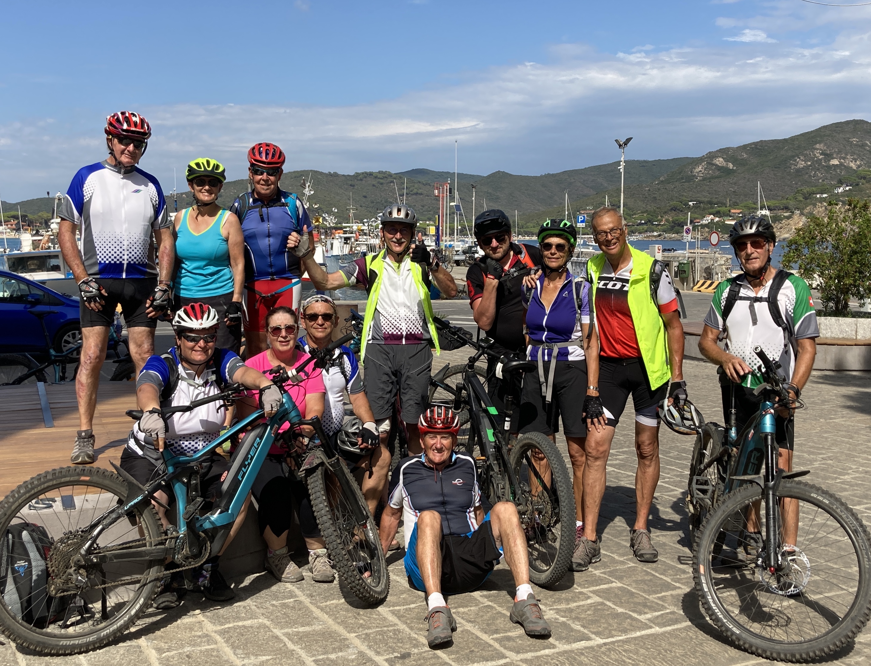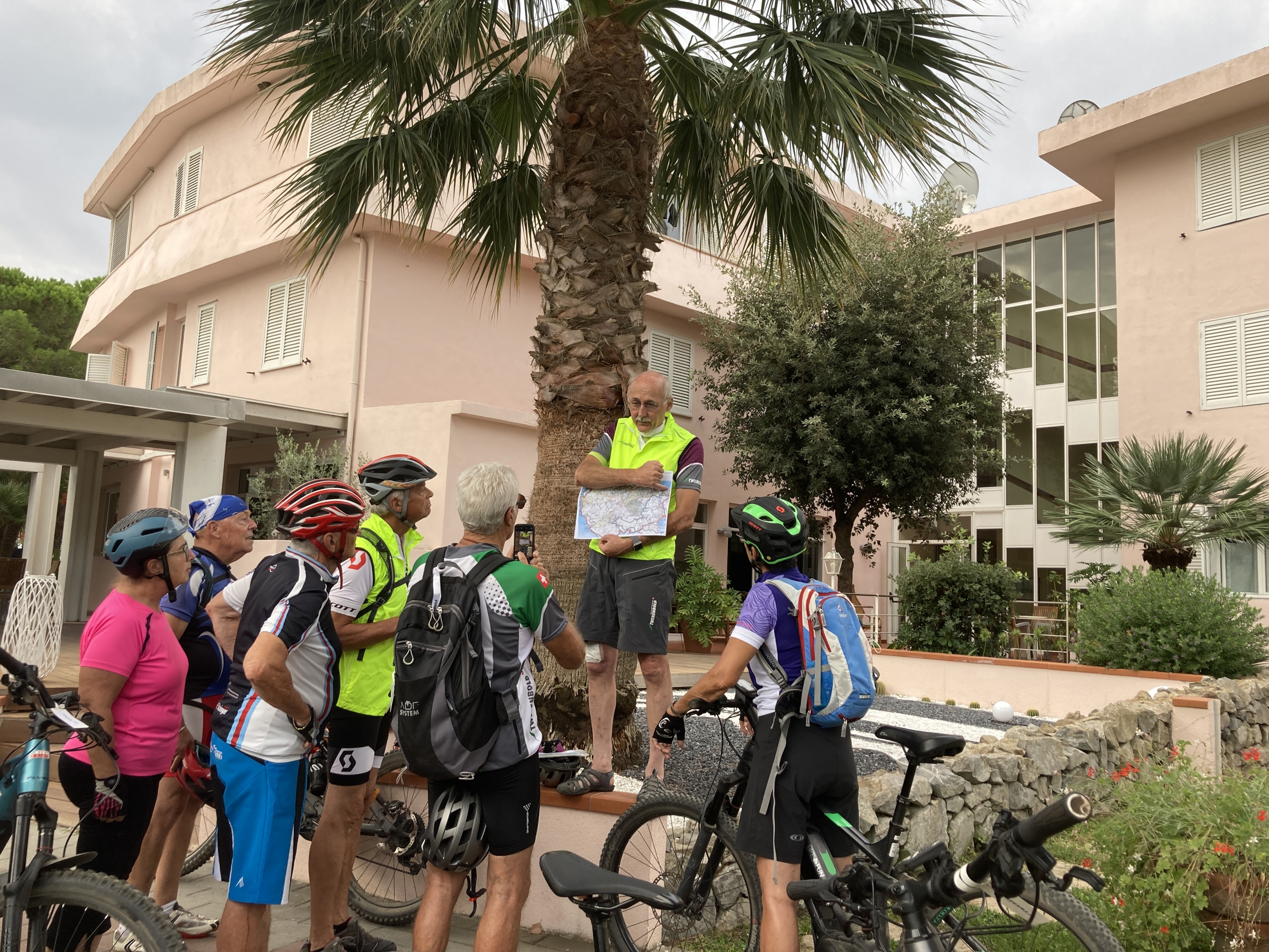 Wir starten direkt vom Hotel in Marina di Campo. Wie versprochen, ist die heutige Route gemässigt und wir fahren Richtung Monte Perone auf 630 m. Es ist einfach sensationell mit einem E-Mountainbike zu fahren: vollgefedert und mit neuster Technik versehen ist der Fahrkomfort auch im unwegsamen Gebiet genial. Die breiten Reifen mit dem groben Profil erleichtern uns die Fahrt auf Geröll, Sand oder Kies enorm. Im typisch italienischen Dörfchen Poggia machen wir eine Kaffeepause, die andere Gruppe ist bereits dort, bricht aber kurze Zeit später auf. Die herrliche Aussicht auf das Mittelmeer verführt zum Fotos machen. Heute soll es kein Mittagessen unterwegs geben, denn am Nachmittag ist bei fast 30 Grad Lufttemperatur Baden angesagt. Wir fahren also hoch motiviert durch trockene, steinige Bachbeete – so motiviert, dass es wieder zu einem üblen Sturz kommt; aber rassig werden die Blessuren verarztet und weiter geht es durch riesige Pinien- und Kieferwälder, die uns wunderbaren Schatten spenden. Konzentration ist also bis am Schluss in La Pila resp. bis zum Hotel angesagt. Dort werden die Bikes umgehend in den Anhänger verladen. Bald ist die sportliche Bande in alle Ecken verstreut; die einen suchen einen Platz am Meer, die anderen tummeln sich um den Hotel-Pool. Am Abend ist individuelles Nachtessen angesagt. So kann man die vielseitige Hotelküche ausprobieren oder im Städtchen ein Restaurant aufsuchen. Entsprechende Tipps erhalten wir von unserem Gourmet Heinz.