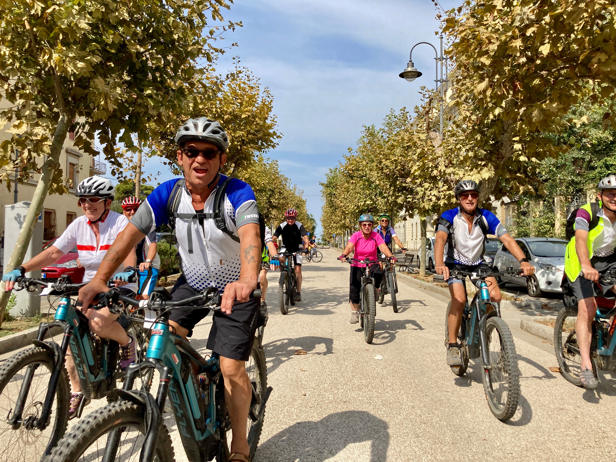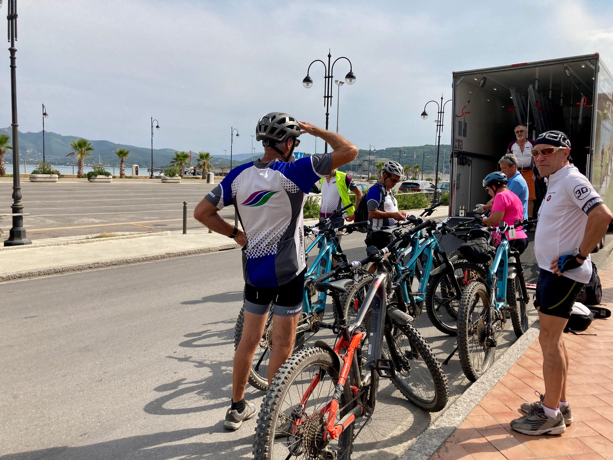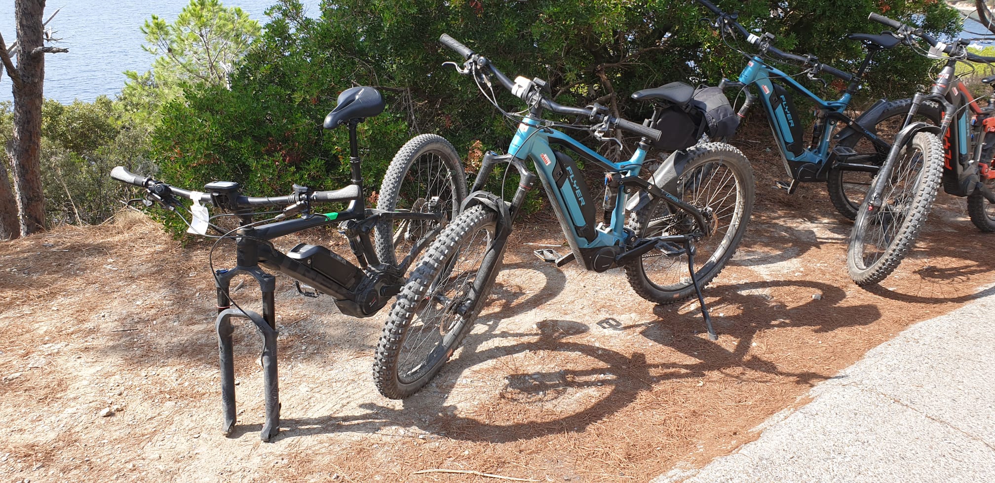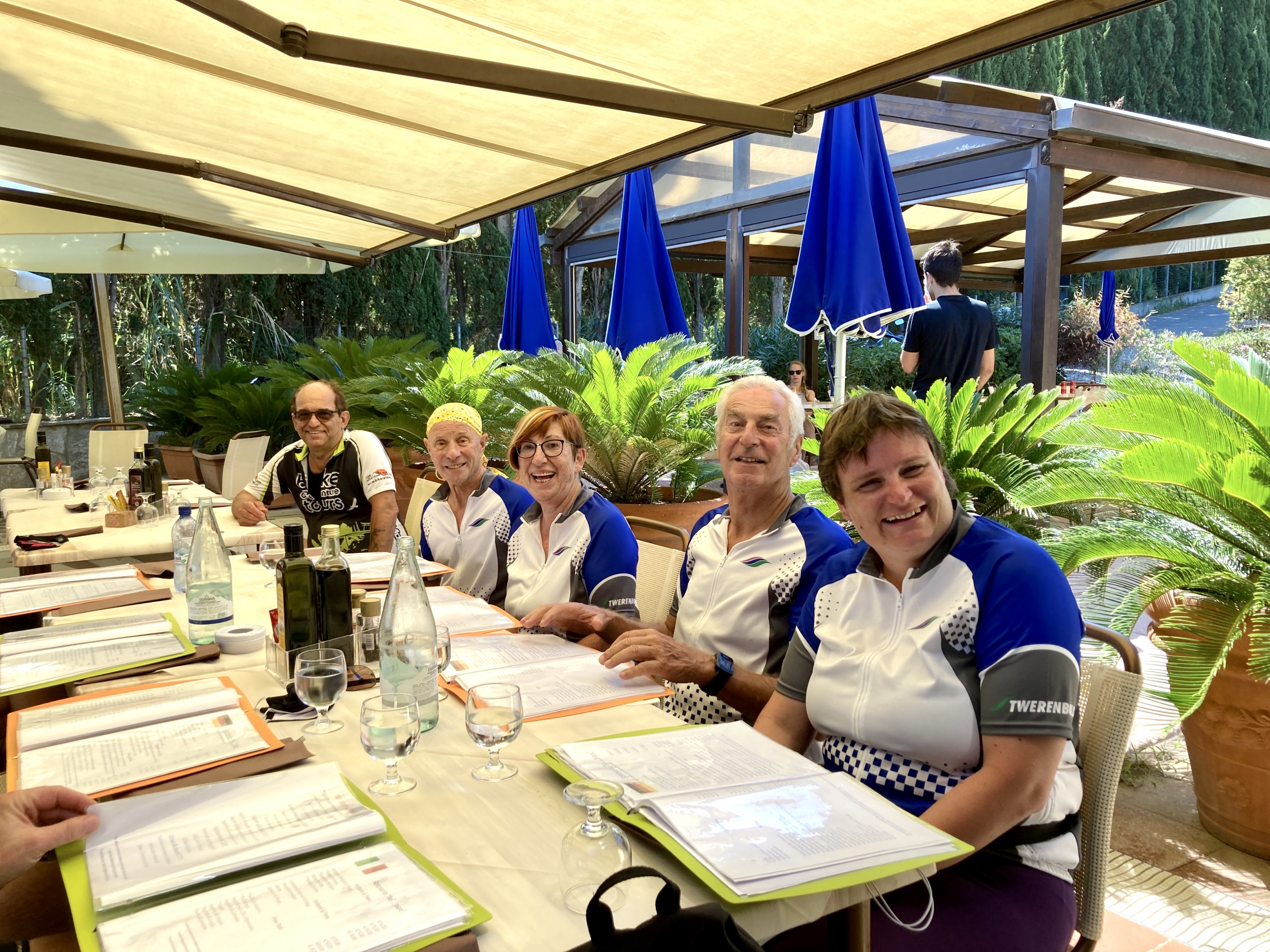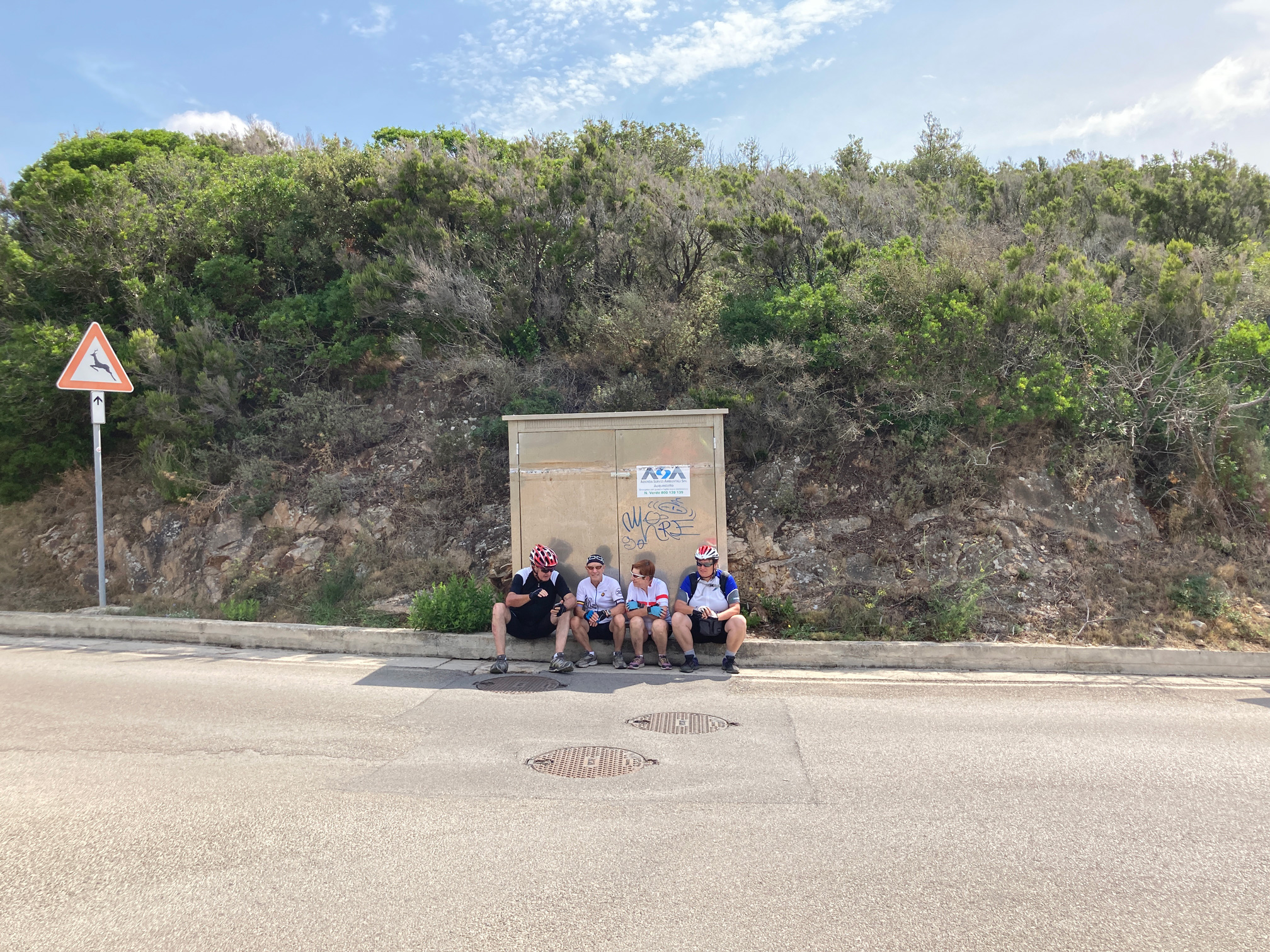 Wir starten direkt vom Hotel in Marina di Campo. Wie versprochen, ist die heutige Route gemässigt und wir fahren Richtung Monte Perone auf 630 m. Es ist einfach sensationell mit einem E-Mountainbike zu fahren: vollgefedert und mit neuster Technik versehen ist der Fahrkomfort auch im unwegsamen Gebiet genial. Die breiten Reifen mit dem groben Profil erleichtern uns die Fahrt auf Geröll, Sand oder Kies enorm. Im typisch italienischen Dörfchen Poggia machen wir eine Kaffeepause, die andere Gruppe ist bereits dort, bricht aber kurze Zeit später auf. Die herrliche Aussicht auf das Mittelmeer verführt zum Fotos machen. Heute soll es kein Mittagessen unterwegs geben, denn am Nachmittag ist bei fast 30 Grad Lufttemperatur Baden angesagt. Wir fahren also hoch motiviert durch trockene, steinige Bachbeete – so motiviert, dass es wieder zu einem üblen Sturz kommt; aber rassig werden die Blessuren verarztet und weiter geht es durch riesige Pinien- und Kieferwälder, die uns wunderbaren Schatten spenden. Konzentration ist also bis am Schluss in La Pila resp. bis zum Hotel angesagt. Dort werden die Bikes umgehend in den Anhänger verladen. Bald ist die sportliche Bande in alle Ecken verstreut; die einen suchen einen Platz am Meer, die anderen tummeln sich um den Hotel-Pool. Am Abend ist individuelles Nachtessen angesagt. So kann man die vielseitige Hotelküche ausprobieren oder im Städtchen ein Restaurant aufsuchen. Entsprechende Tipps erhalten wir von unserem Gourmet Heinz.