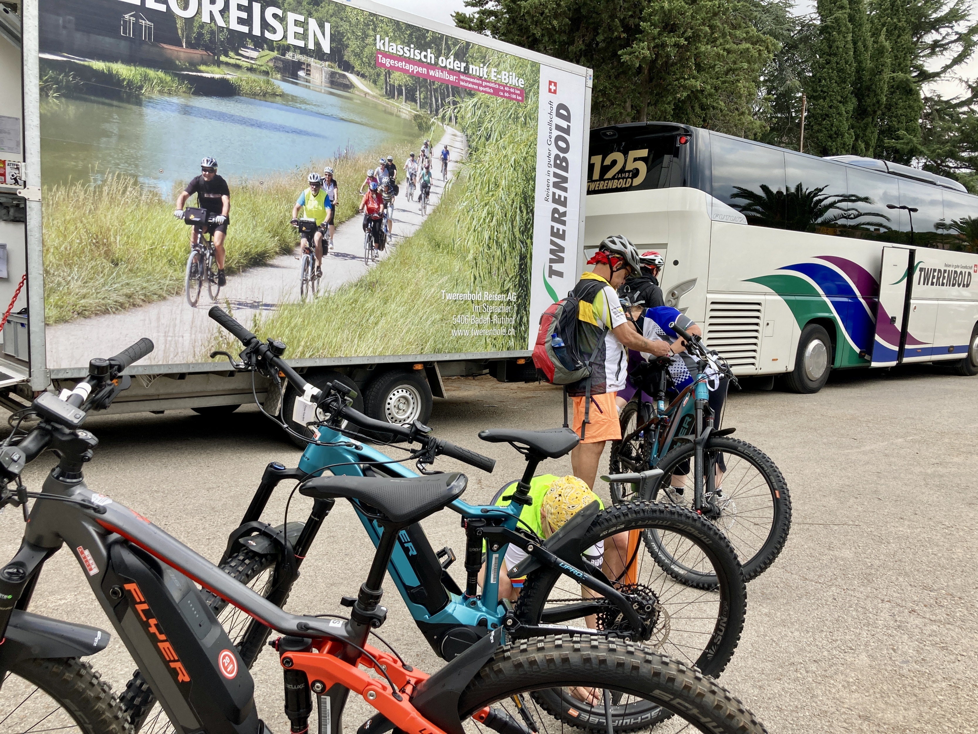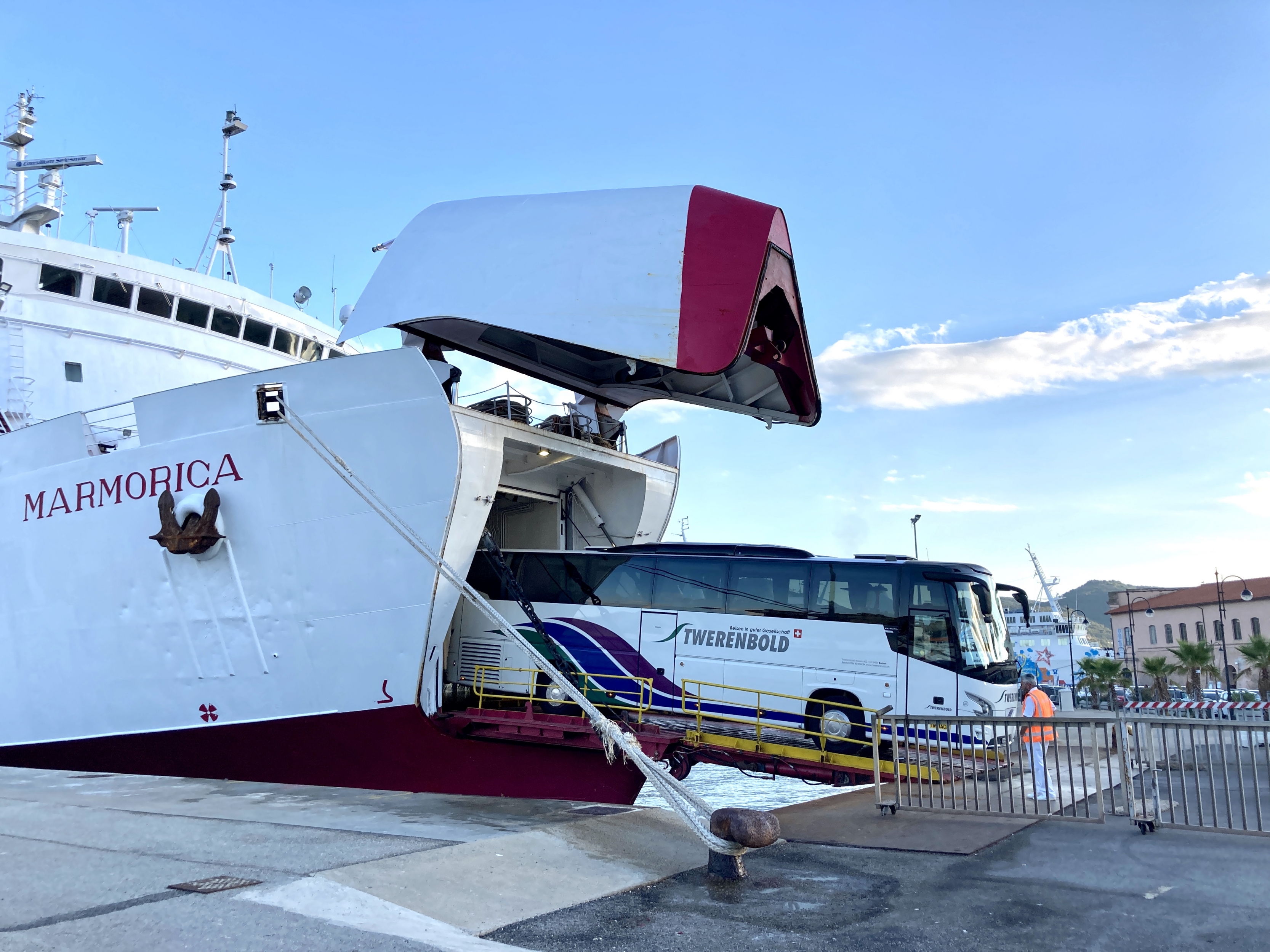 Früh um 6 Uhr erhalten wir unser Frühstück, ab 6.45 Uhr wird der Bus beladen und pünktlich um 7 Uhr fahren wir ab nach Portoferraio. Wir sind gespannt, ob der Veloanhänger auch wirklich noch im Hafen steht – und – sind erleichtert, dass wir also komplett auf die Fähre gehen können, wo wir nach einer stündigen Fahrt um 9 Uhr in Piombino eintreffen. In Fidenza haben wir die Möglichkeit, einheimische landwirtschaftliche Produkte wie Olivenöl, Schinken und Käse einzukaufen – aber vor allem gibt es hier eine Auswahl an Köstlichkeiten zum Mittagessen. In Bellinzona müssen wir uns schon von den ersten Kollegen verabschieden. Ja, es ist einfach so – während einer Woche lernt man sich näher kennen und erlebt viel Neues und Spannendes zusammen. So tut der Abschied immer etwas weh. Mit den Kontaktdaten in der Tasche fällt der Abschied dann doch nicht so schwer und ich bin guter Dinge, dass ich viele der Gäste irgendwo und irgendwann wiedersehen werde. In diesem Sinne – «ARRIVEDERCI et rimanete in buona salute!»