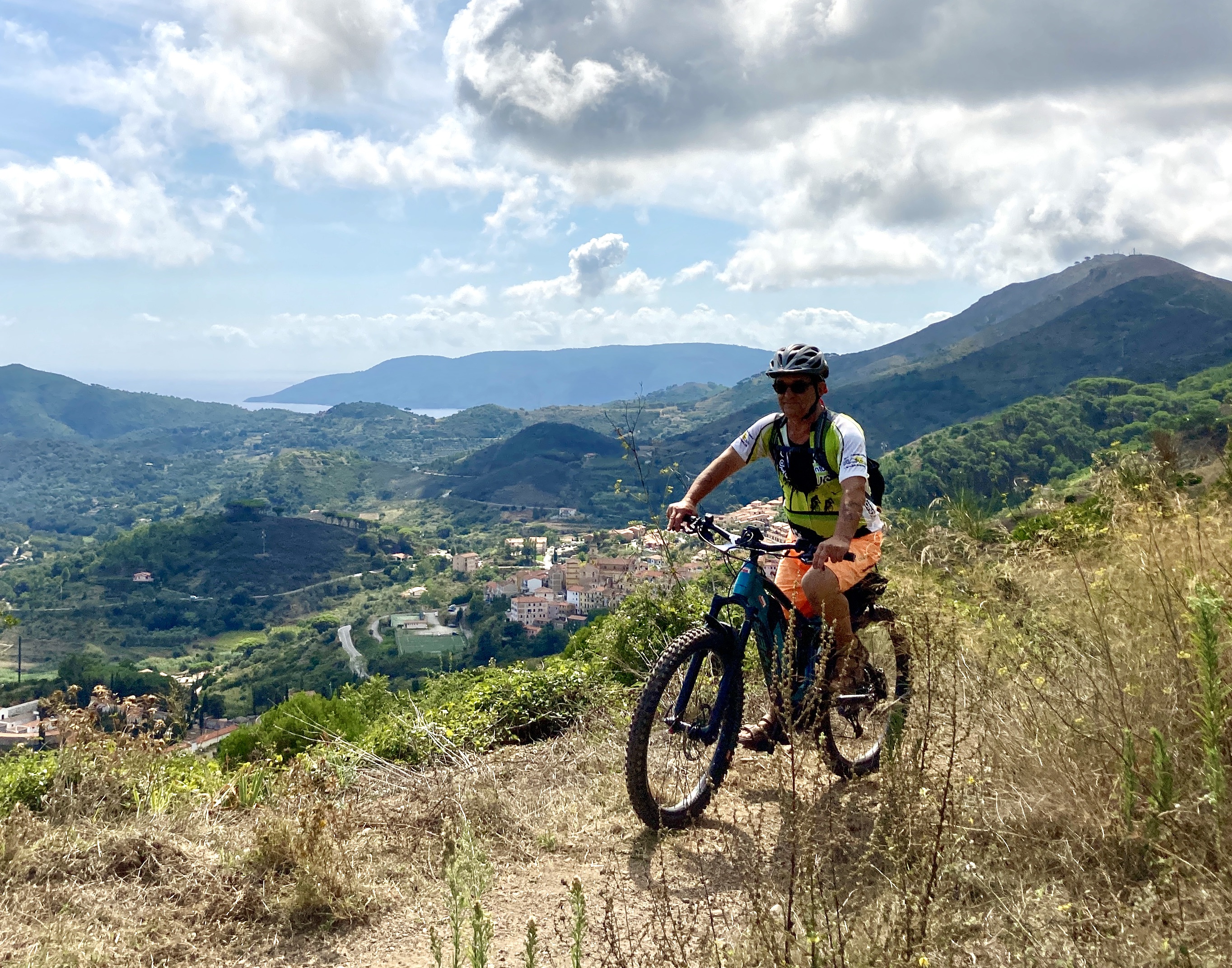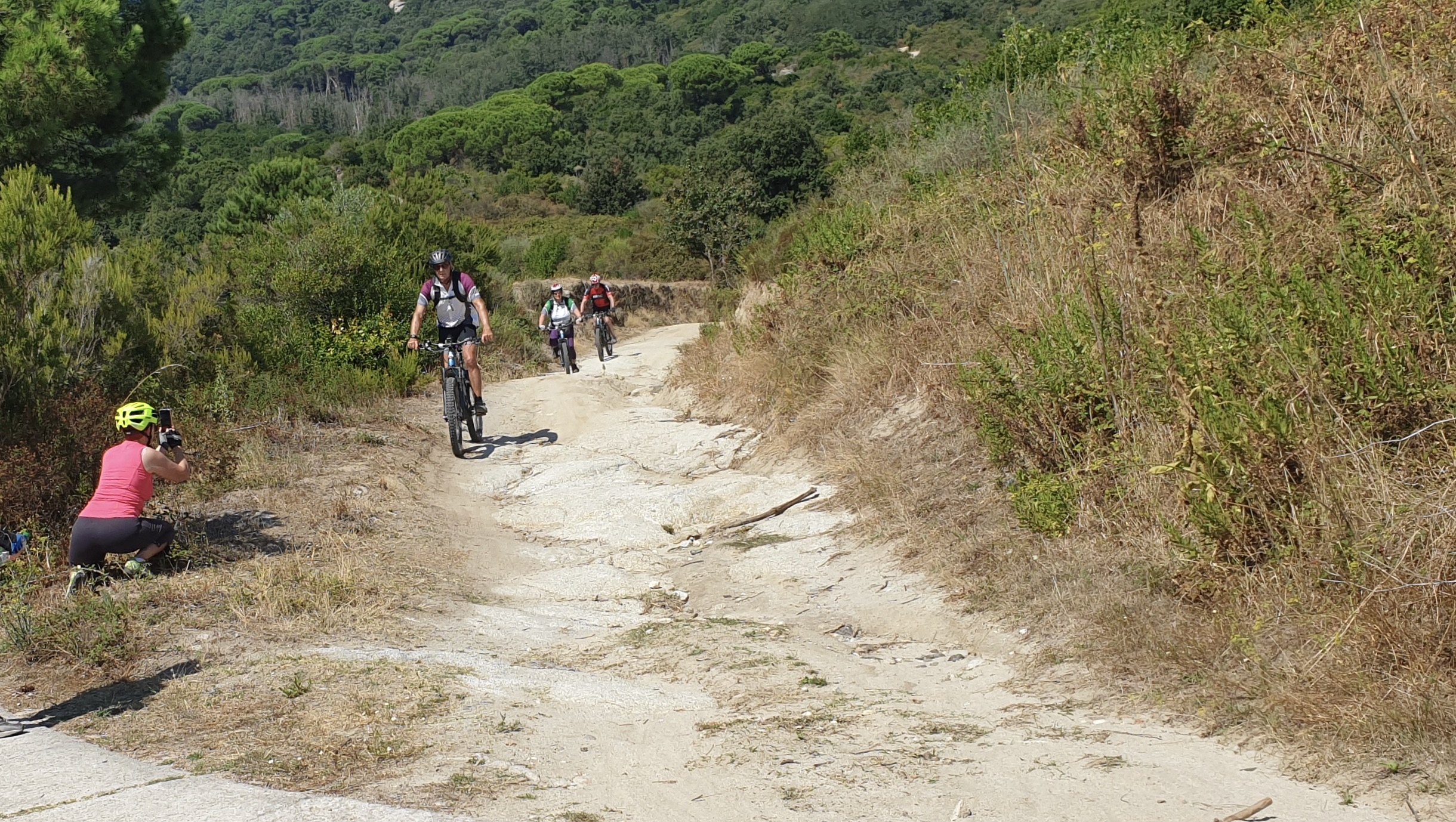 Die heutige Tour starten wir in Capoliveri und umrunden resp. überqueren den Monte Calamita im Südosten der Insel. Mehrheitlich können wir ganz angenehm auf Naturstrassen fahren, Steigungen und Abfahrten meistern wir nun schon etwas lockerer. Übung macht den Meister! Am Schluss fahren wir auf der Küstenstrasse mit wunderbarem Blick aufs glitzernde Wasser. Unsere Mittagspause verbringen wir mit Blick auf das Tyrrhenische Meer und gönnen uns im hübschen Strand-Restaurant in Straccoligno ein «kleines» Mittagessen mit deutschsprechender Bedienung. Den einen Streckenabschnitt, den wir am Vormittag aufwärts geschafft haben, können wir nun auch noch abwärts testen – alles läuft glatt.