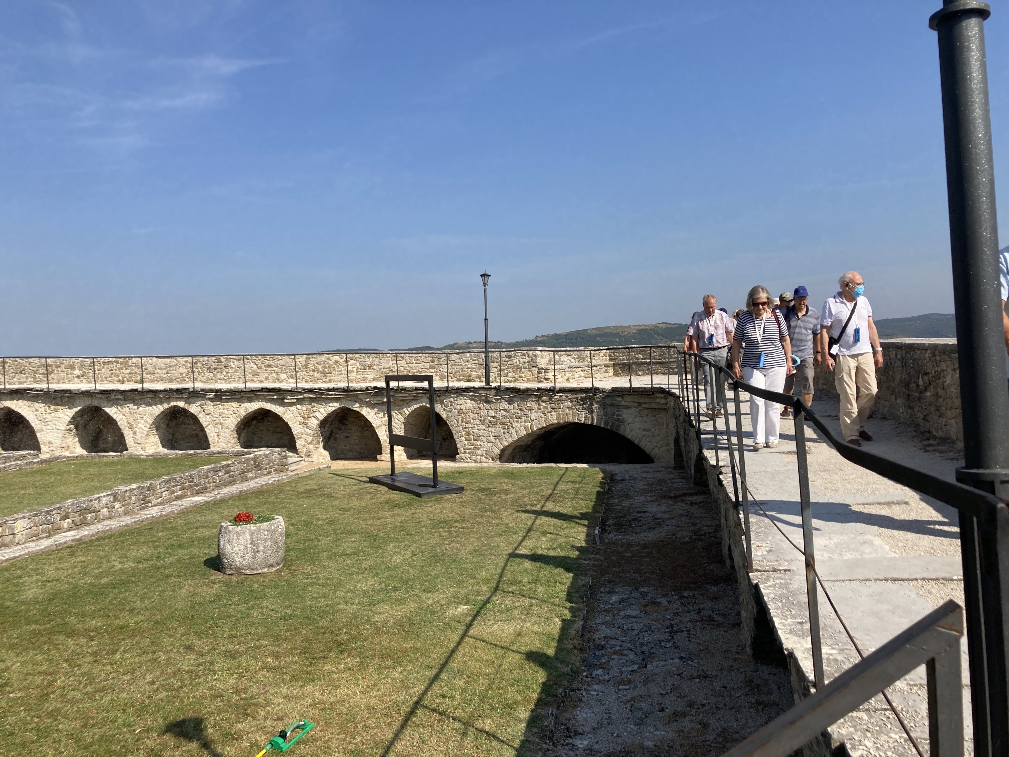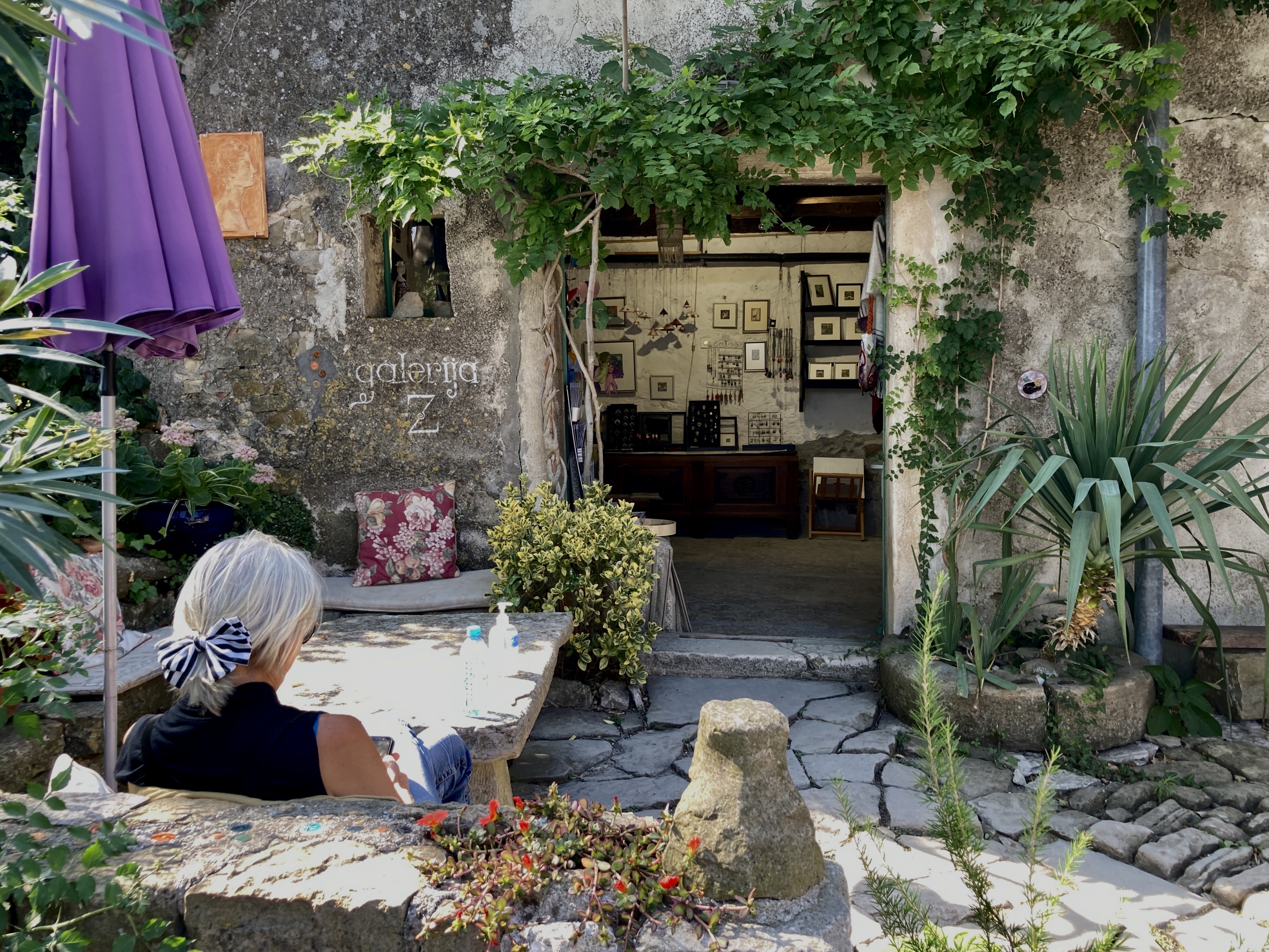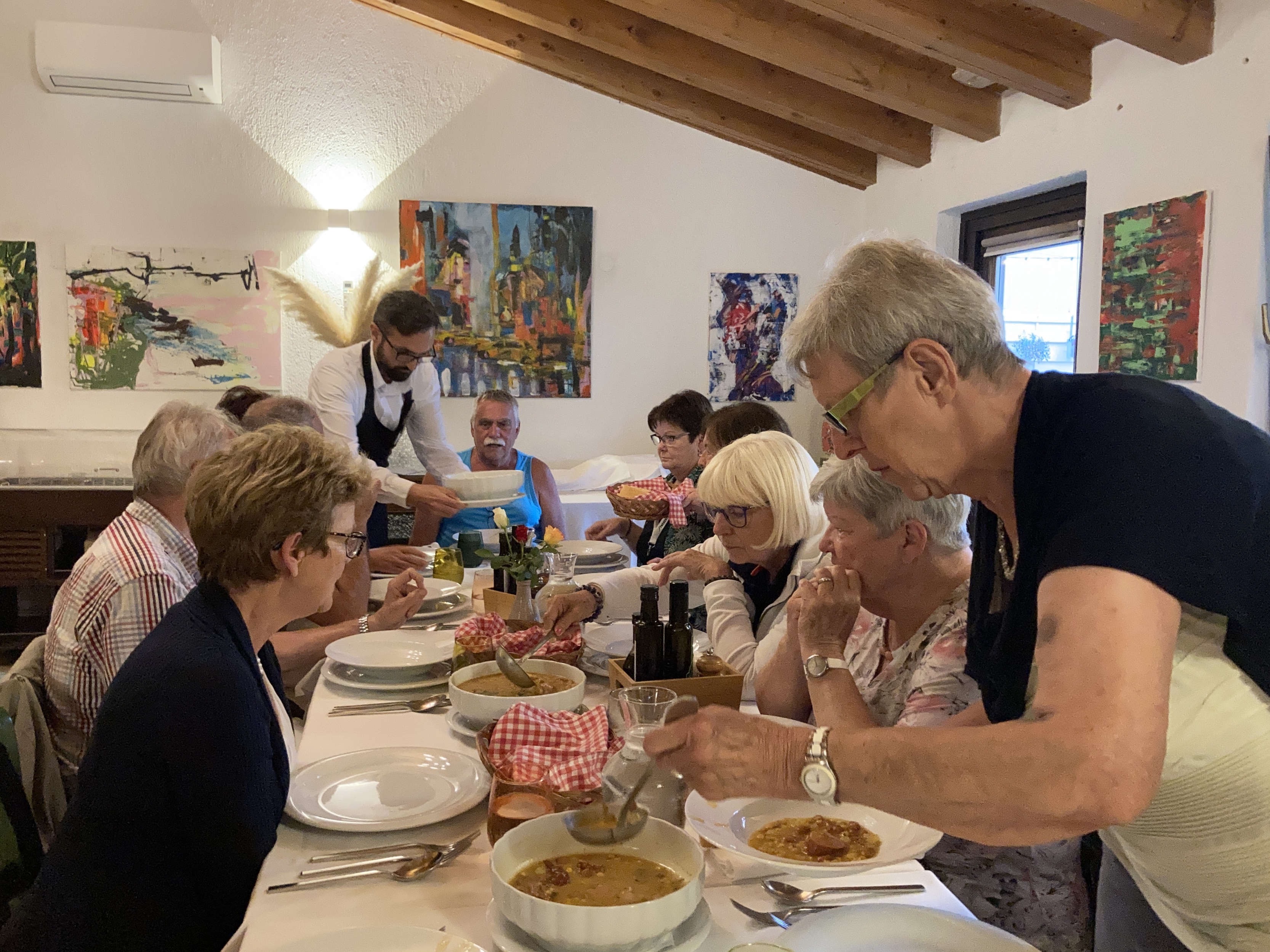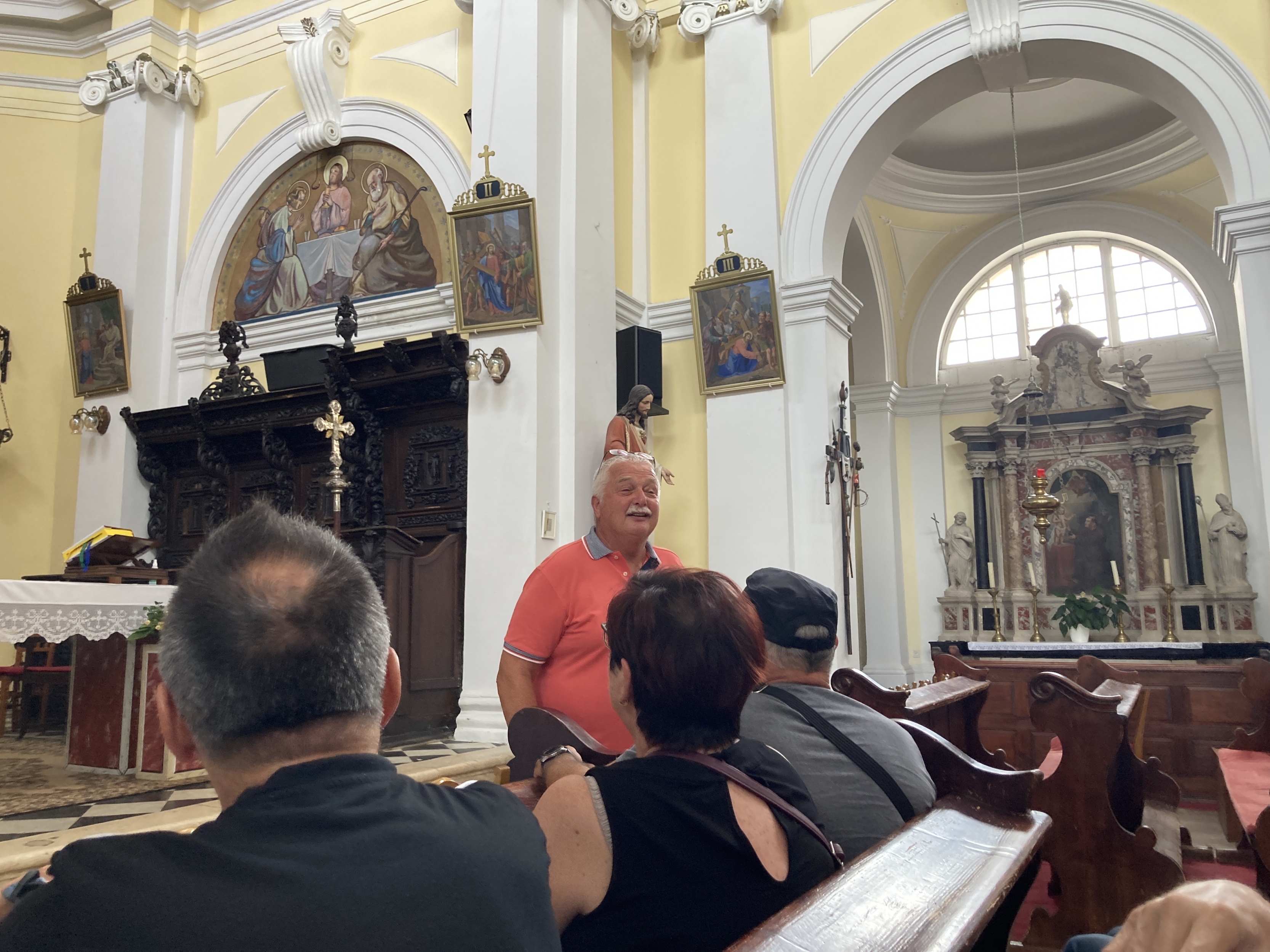 Flink führt uns Bürgermeister Dusan durch das kleine Dorf mit seinen knapp 130 Einwohnern. Seine Geschichten sind gespickt mit lustigen Anekdoten. Manchmal nicht ganz jugendfreie Bemerkungen und Sticheleien ans weibliche Geschlecht nehmen wir mit Humor. In der Kirche des Heiligen Apostels Andreas stimmt er plötzlich «Grosser Gott, wir loben dich ...» an und auch die nicht so fleissigen Kirchgänger summen mit. Im Keller mit der stillgelegten Ölpresse offeriert er uns einen Grappa – oder war es eher ein Likör? Auf jeden Fall wird auch dort nochmals zum Gesang eingeladen. Ja, Dusan unterhält uns mit Tempo und viel persönlichem Engagement. Er begleitet uns zu seiner Frau Kornelia, eine gebürtige Deutsche aus dem Baden-Würtembergischen. In ihrem Spezialitätenladen bedient uns vor allem ihr redegewandte Gatte und preist das beste (was denn sonst!) Olivenöl an; aber auch Honig und Liköre hübsch verpackt, werden gerne für die Liebsten zu Hause eingekauft. Welch’ ein Erlebnis!