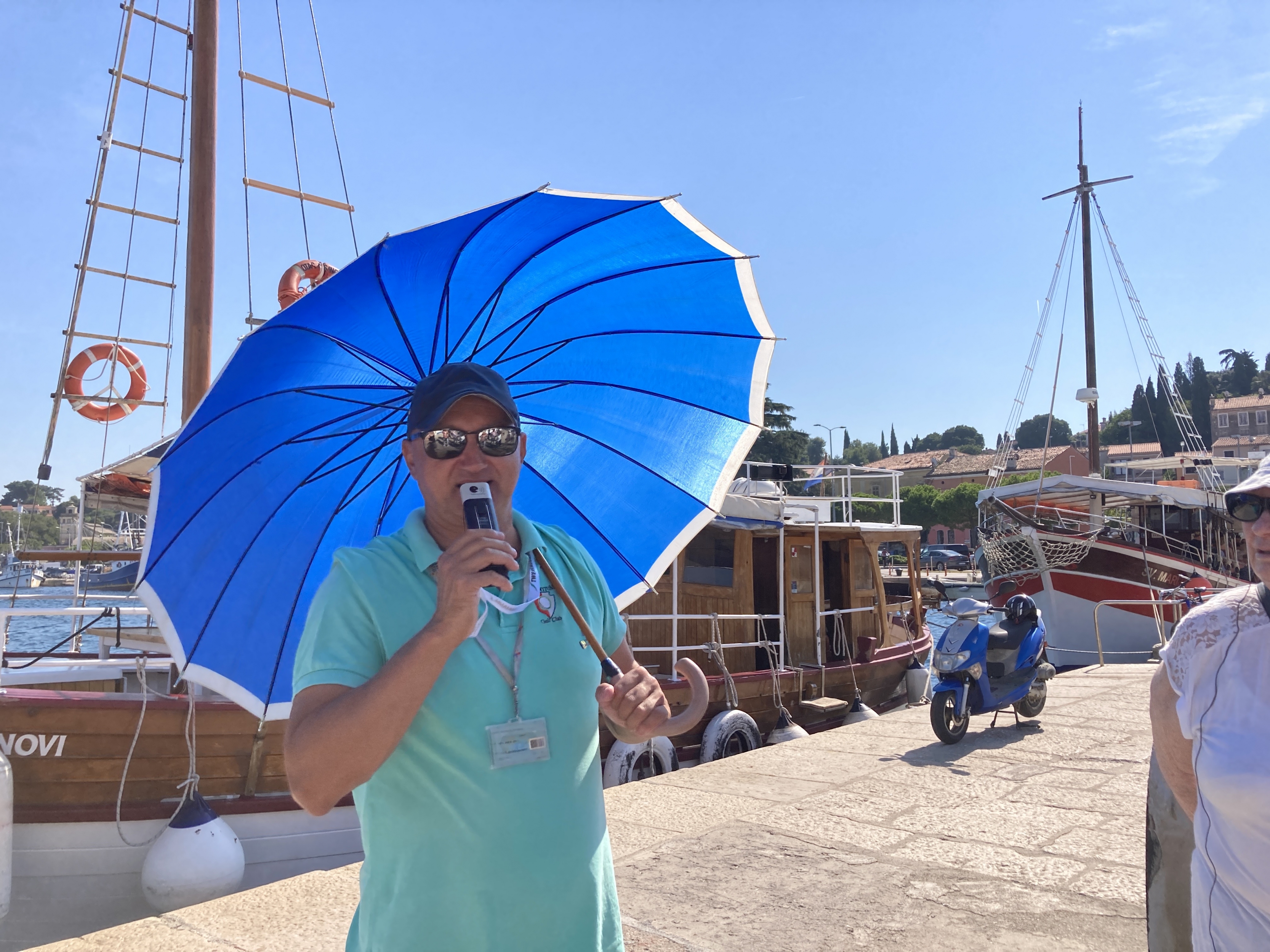 Bei sonnigem Wetter besuchen wir heute die zwei hübschen Städtchen an der Westküste Istriens, direkt an der Adria. Neu in unserer Reisegruppe ist Zoran. Er ist der einheimische Fremdenführer und wird uns in den kommenden vier Tagen seine Heimat vorstellen. Nach einer rund halbstündigen Fahrt mit dem Bus kommen wir in Poreć an. Von dort geht es weiter mit einem kleinen Schiff entlang der grünen Lagune ins südlich gelegene Rovinj. Bereits vom Schiff aus erkennt man, welch schmuckes Städtchen uns da erwartet. Malerische Gassen, kleine Boutiquen und einladende Restaurants und Bars machen unseren geführten Rundgang zum Erlebnis. Zoran kann zu jedem Gebäude etwas berichten. Über der Altstadt thront die Kirche der heiligen Euphemia; der Glockenturm gleicht demjenigen in Venedig. Die kupferne Statue an der Spitze der Pyramide ist so gestellt, dass sie sich in der Windrichtung um Ihre Achse dreht. Die freie Zeit nutzen wir gerne, um in den romantischen Gassen zu spazieren oder um in einem der unzähligen Restaurants einzukehren – es ist schliesslich Mittagspause.