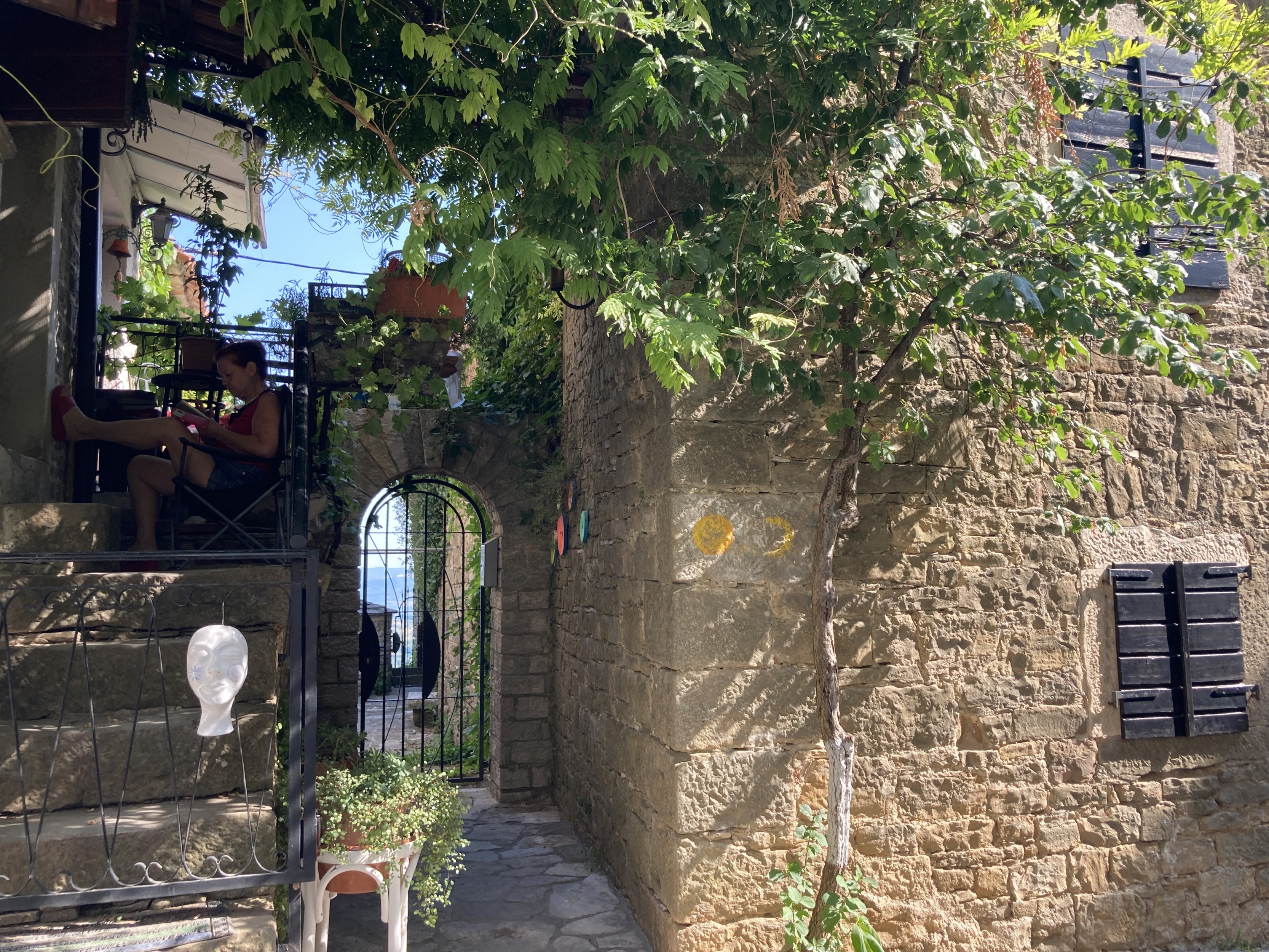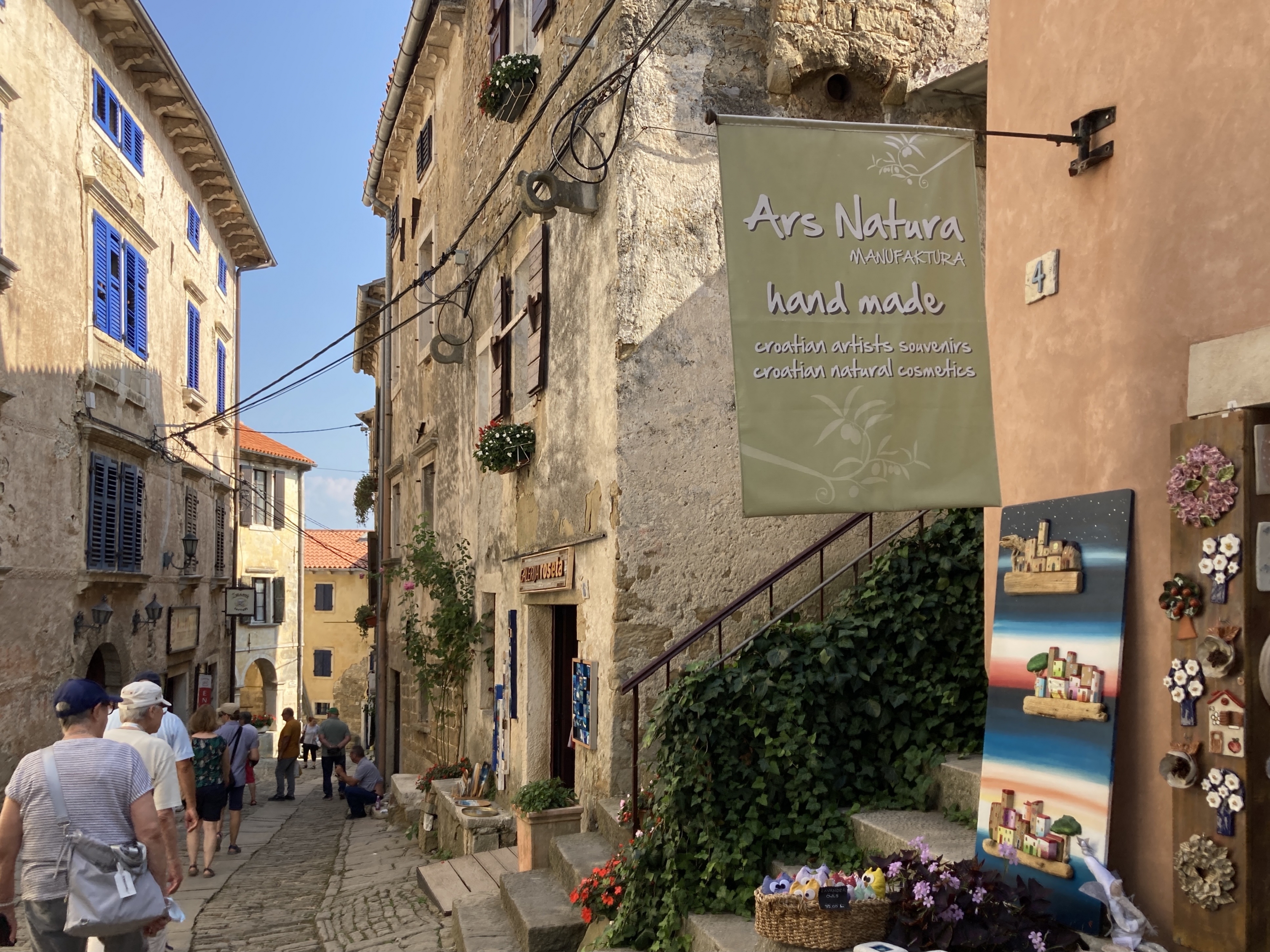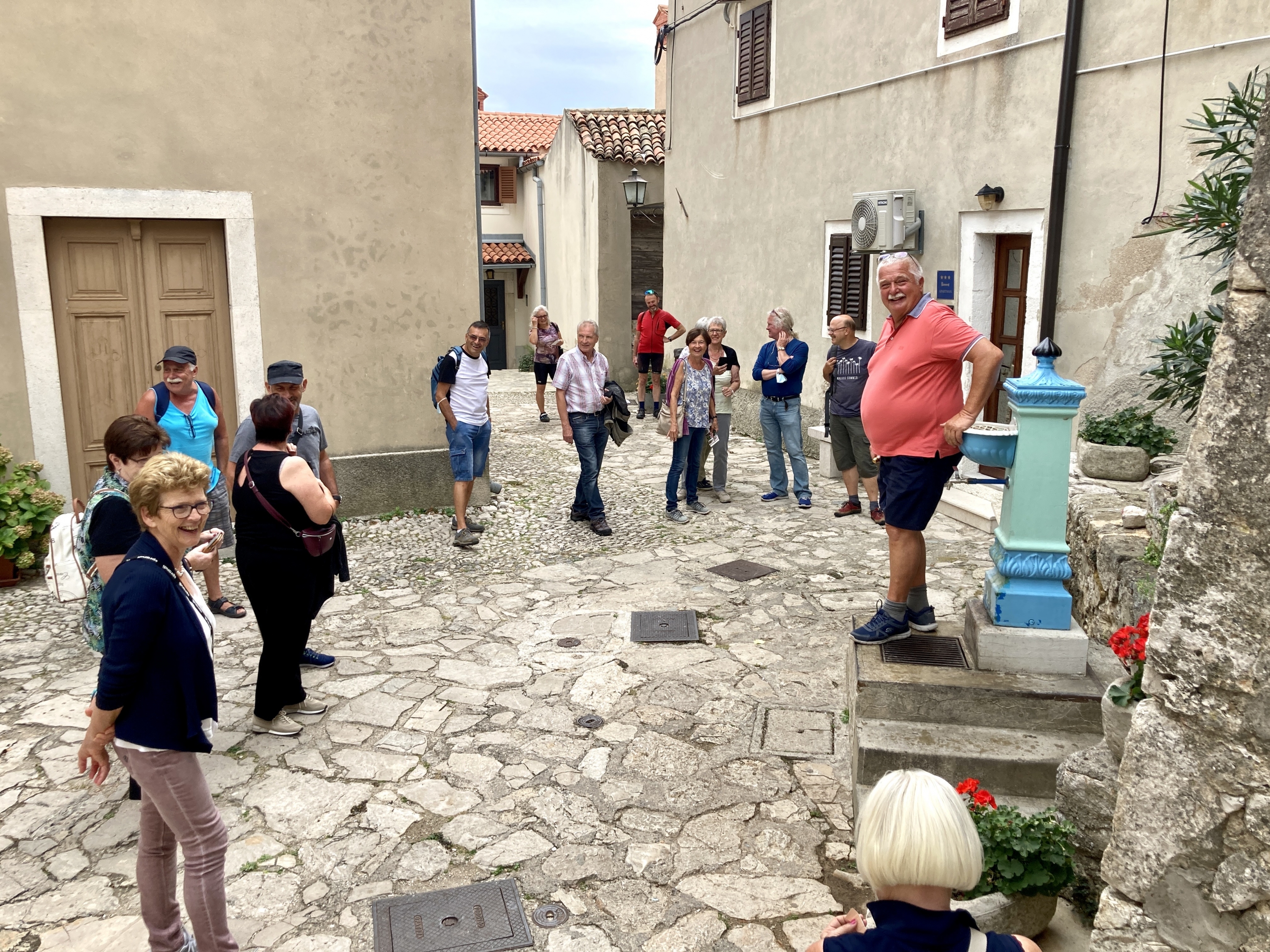 Nach dieser wirklich gemütlichen, fröhlichen Runde im Weingut lehnen wir uns im Bus nur allzu gerne etwas zurück. Mein Kopf ist ungewöhnlich schwer geworden ... knapp eine Stunde später, auf unserem Nachhauseweg sozusagen, geht es bergauf. Die lieblichen Hügel, prägnanten Zypressen und ausladenden Pinien erinnern uns an die Toskana. Wunderschön! In Grožnjan erwartet uns ein winziges originelles Dörfchen, das vor allem bei Künstlern bekannt und beliebt ist. In den engen Gassen haben Kunstschaffende ihre Ateliers und Verkaufsläden. Eine äusserst charmante Atmosphäre herrscht hier; zwischen den alten Häusern und Bäumen findet jeder ein schattiges Plätzchen zum Verweilen. Frühzeitig sind wir heute im Hotel zurück und können den fantastischen Hotelstrand etwas geniessen.