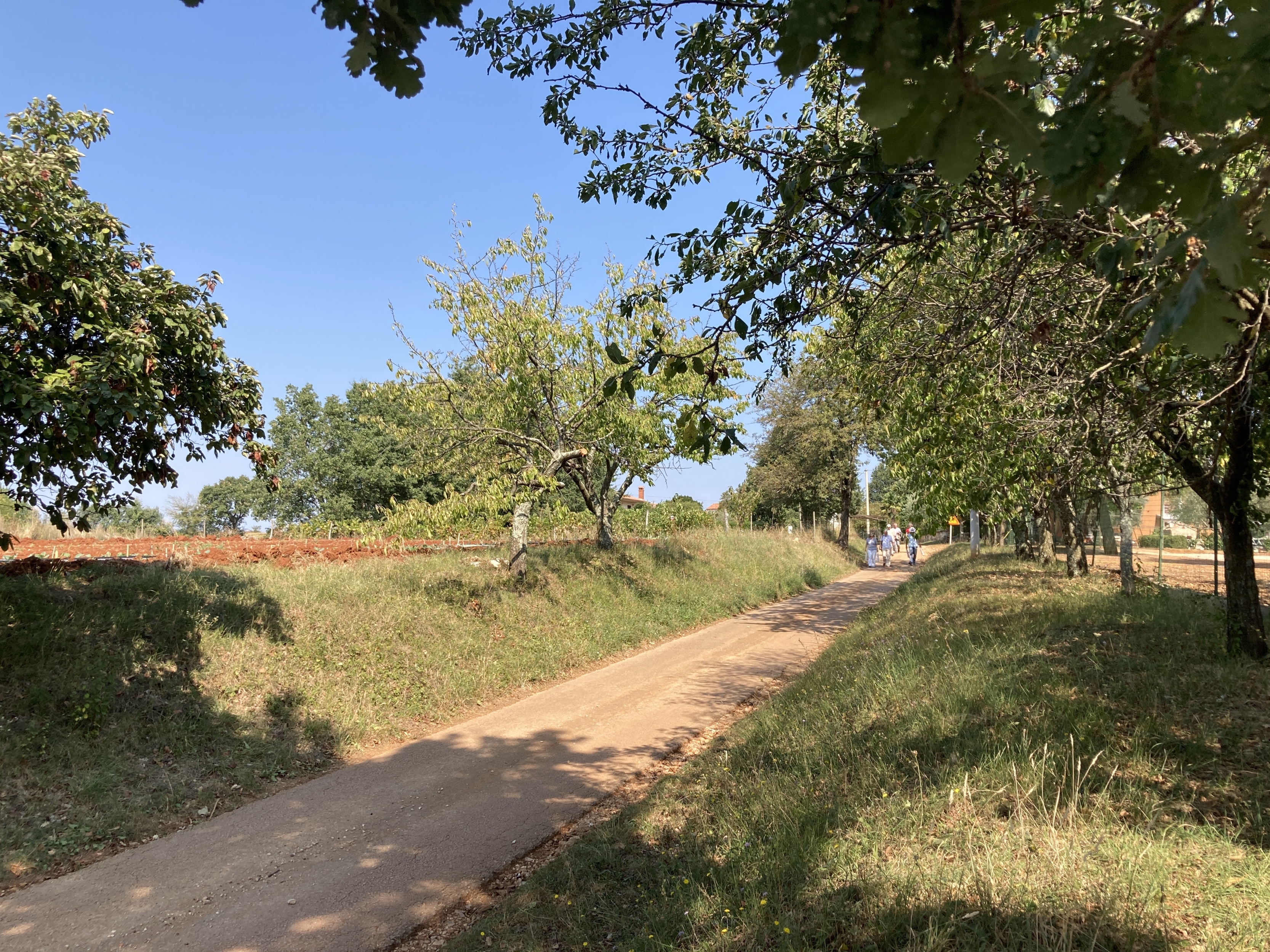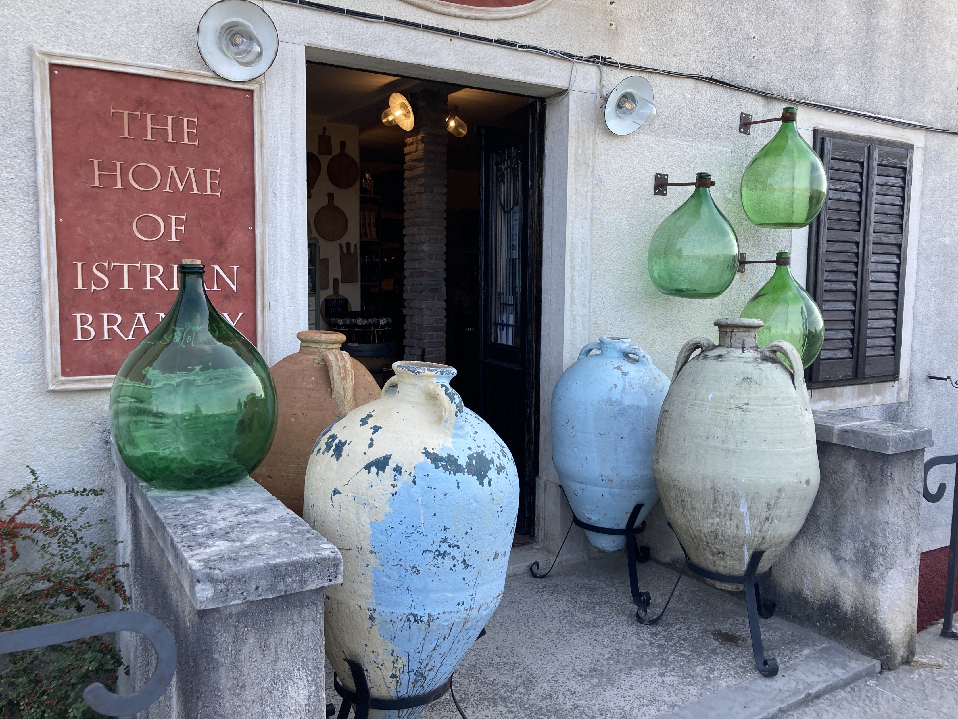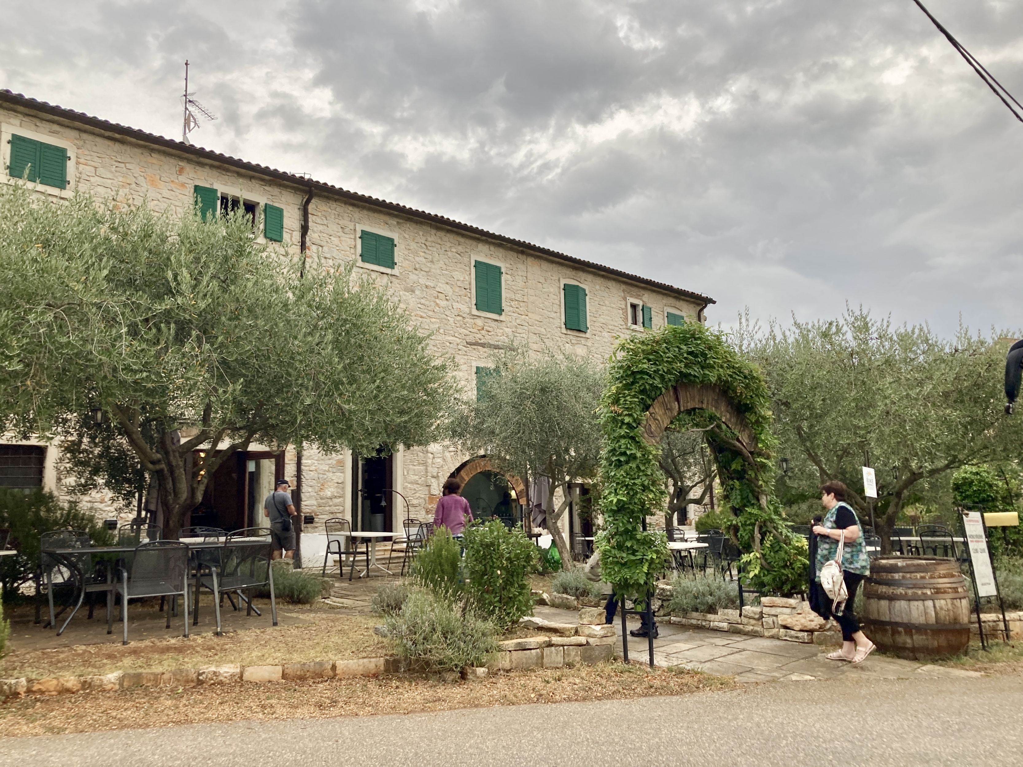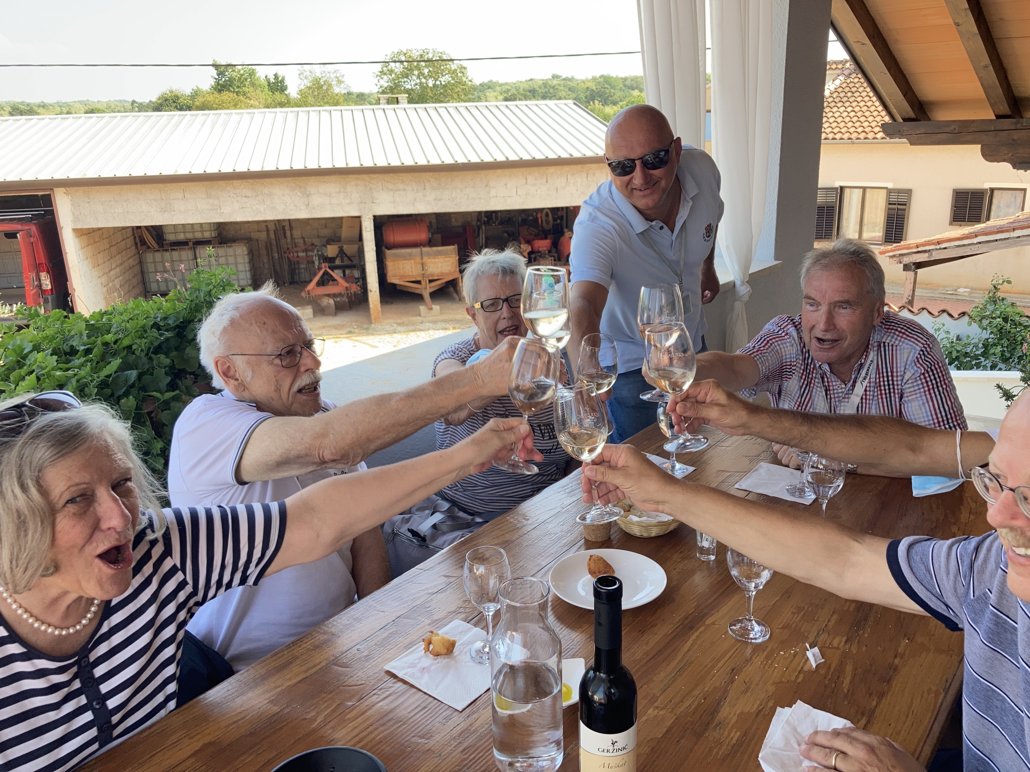 Wir schlendern durch Rebberge und Olivenhaine zum Weingut der Familie Geržinić. Der Chef persönlich heisst uns freundlich und bescheiden willkommen. Er führt uns auf die Terrasse hinauf und stellt uns die verschiedenen Weine vor, die wir heute degustieren dürfen: der weisse Malavazija, der rote Teran und den Dessertwein Muskat. Serviert mit passenden Beilagen, wie Brot, Olivenöl oder Schinken. Zum «Muskat» geniessen wir die süssen Fritule (süsse frittierte Teigbällchen). Als Abschluss gibt es einen einheimischen Grappa, dieser wird aber vorsorglich erst unten im Erdgeschoss angeboten: «Živjeli!» (Prost)