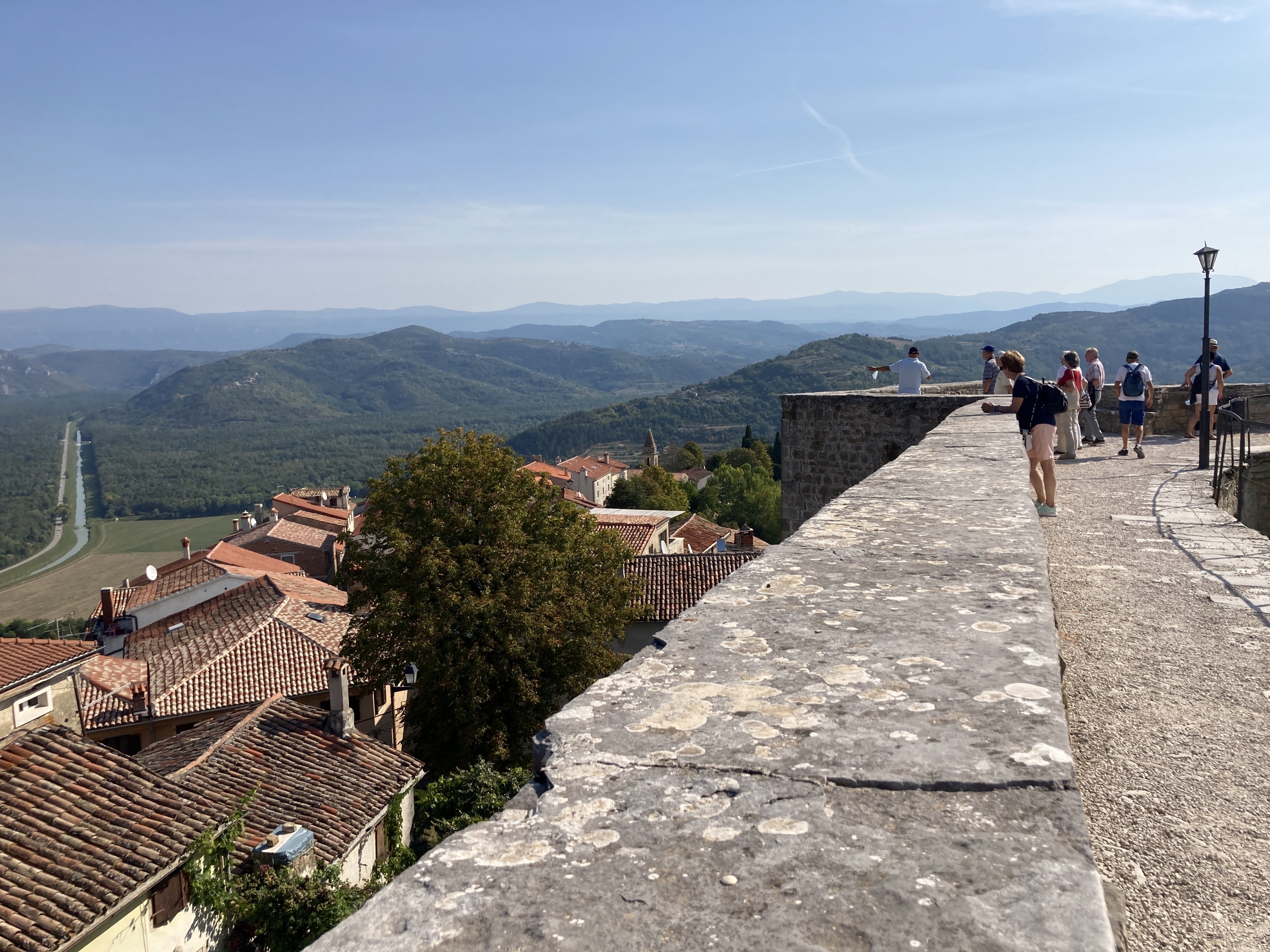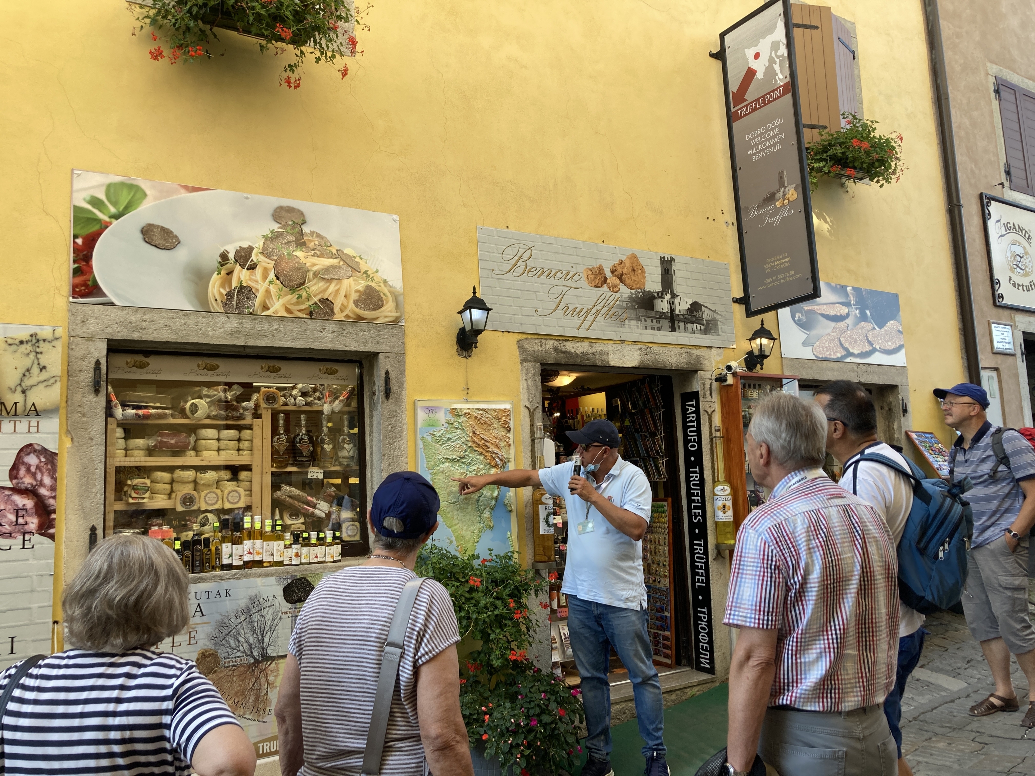 Nur gerade 15 Gäste nutzen die heutige Rundfahrt, um das Landesinnere zu entdecken. Die anderen Reiseteilnehmenden wollen die letzten sonnigen, heissen Tag für das Strandleben nutzen. «Dobro jutro, liebe Gäste!», begrüsst Zoran gut gelaunt die reiselustige Truppe vor dem Hotel. Nach rund einer Stunde kommen wir in Motovun an, das hoch über dem Mirnatal liegt. Bereits auf dem Weg hierhin erzählt uns Zoran von den, in diesem Flusstal wachsenden, Trüffel-Pilzen. Im Dorf Motovun wird schnell klar, ohne Trüffel geht hier gar nichts: Es gibt diesen köstlichen Pilz verarbeitet ihn allen möglichen Formen – sogar als Chips wird er angeboten. In einem Delikatessengeschäft dürfen wir verschiedene Häppchen probieren. Da es sich um ein kostbares Gut handelt, muss der Einkauf von «Mitbringseln» gut überlegt sein. Nach einem Spaziergang auf der Stadtmauer geht die Fahrt weiter nach Ohnići/Vižinada.