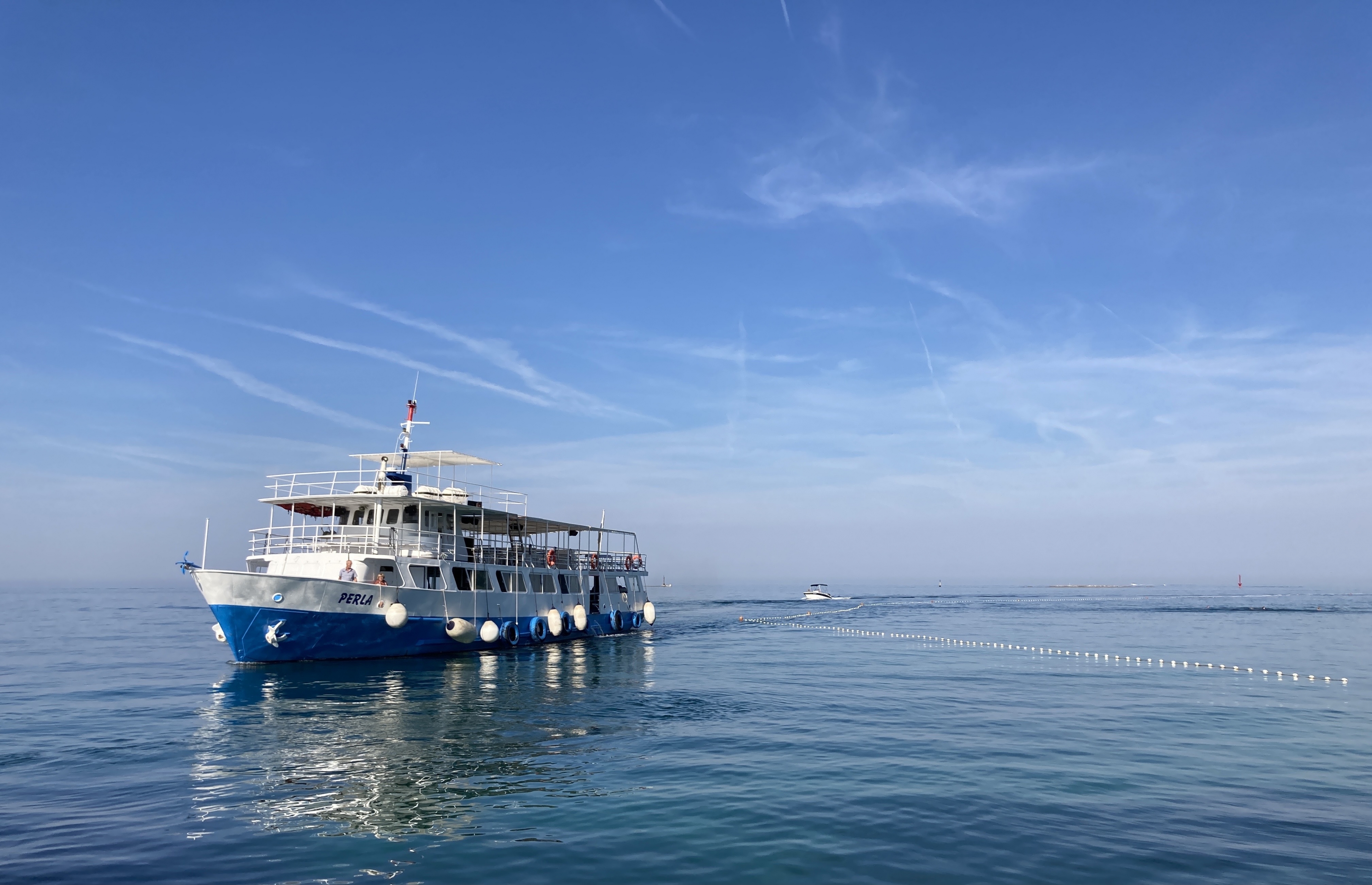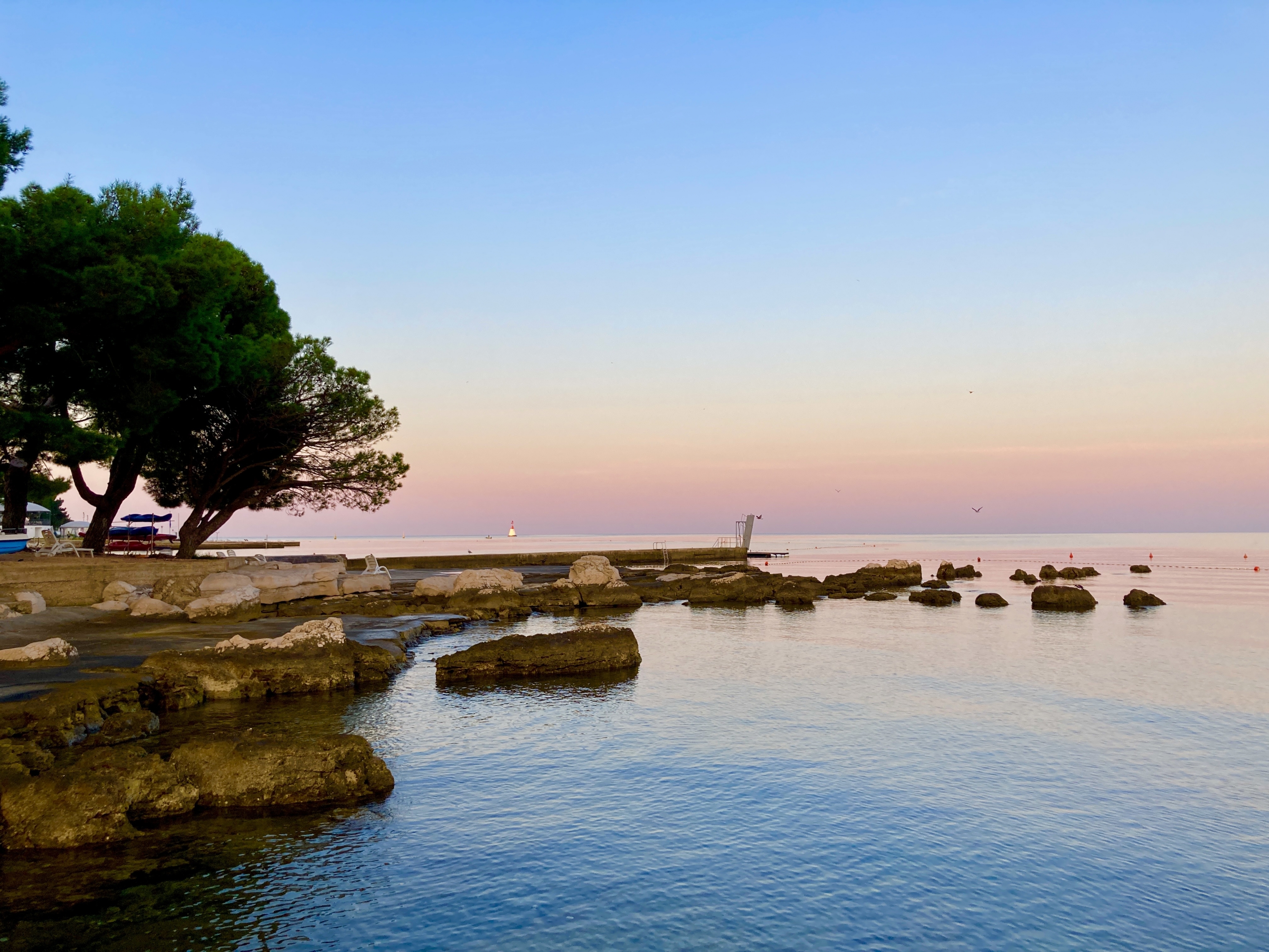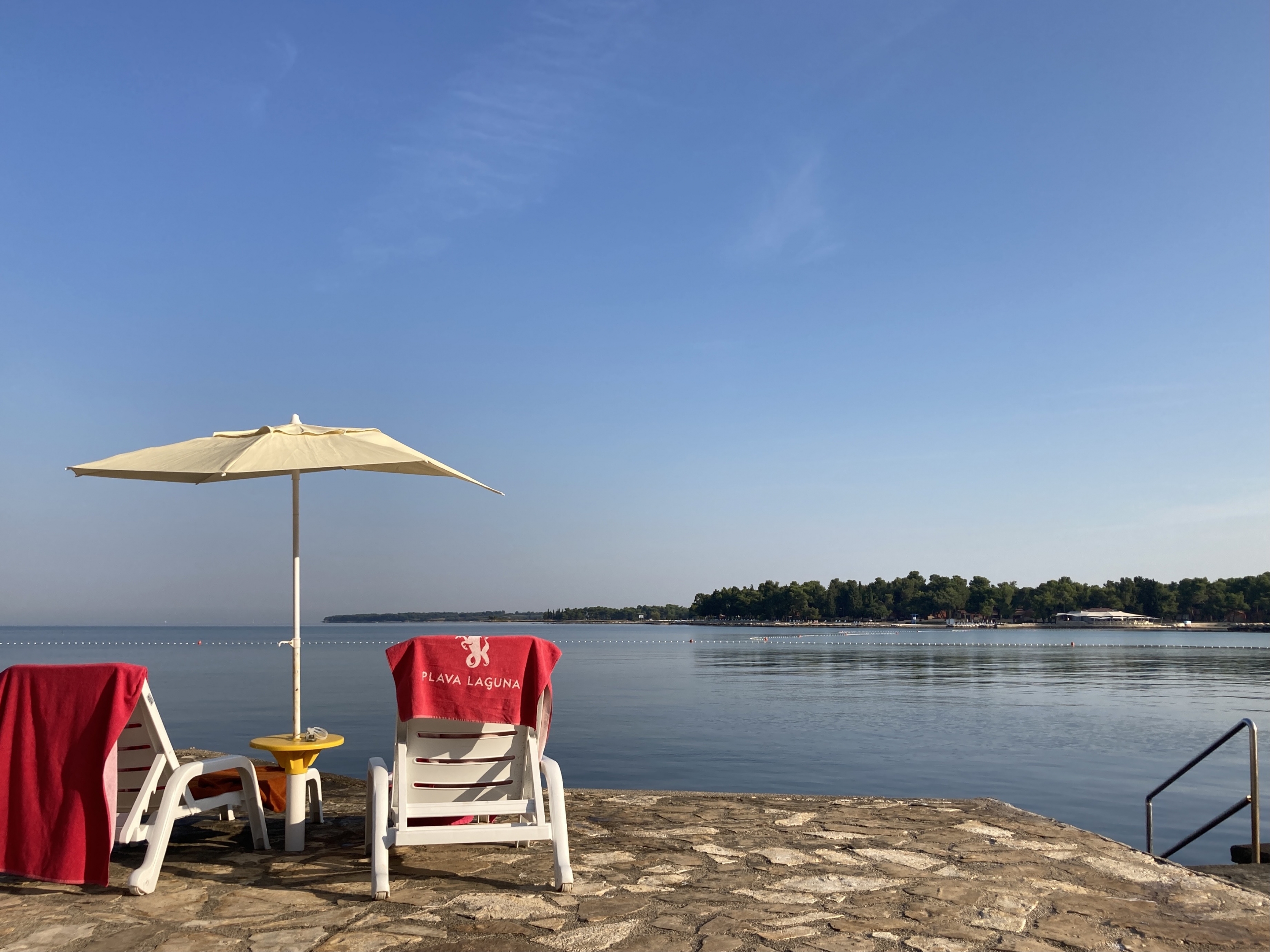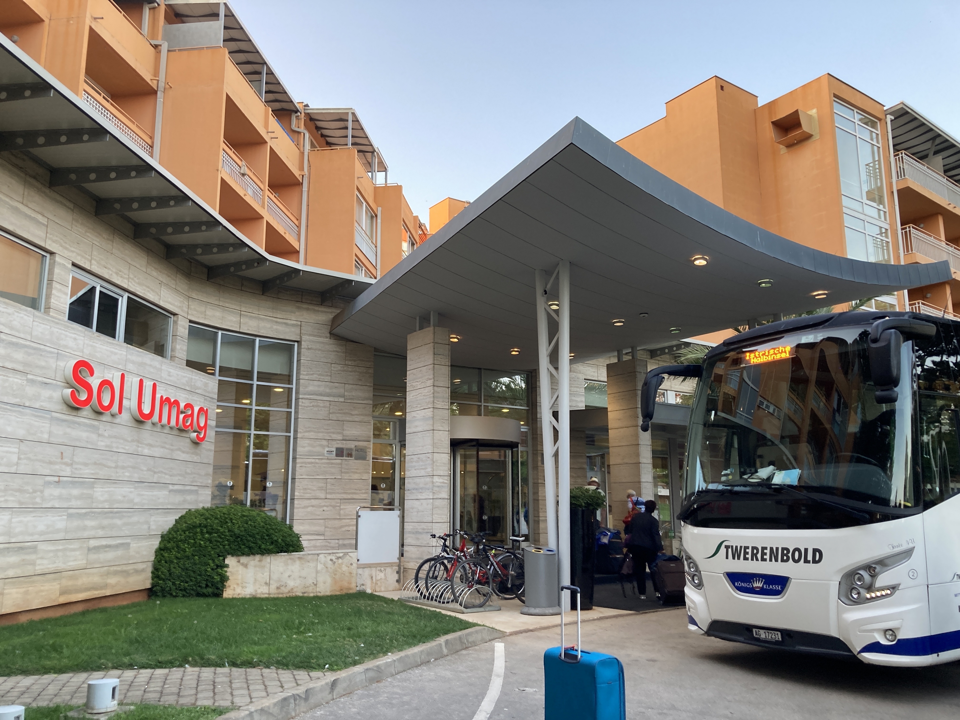 Die Reise verzögert sich etwas, da wir noch auf einen Gast in Arth Goldau warten müssen. Zum Glück verläuft die Weiterfahrt durch den Gotthard-Tunnel reibungslos. Hingegen stauen sich die Autos beim Grenzübergang in Chiasso. Chauffeur Peter ermahnt uns, dringend die Masken aufzusetzen und die nötigen Dokumente, wie ID oder Pass plus Covid-Zertifikat bereit zu halten. Aber wir werden nicht aufgehalten und so verläuft die weitere Fahrt Richtung Verona und Triest unaufgeregt. Wir passieren die slowenische und kroatische Grenze – alles verläuft wunderbar – und wir kommen noch bei Tageslicht in Umag an. Das moderne Hotel direkt am Meer ist für die nächsten fünf Tage unser Zuhause. Nach einem Begrüssungsapéro in der Lobby dürfen wir uns am reichhaltigen Buffet bedienen.
