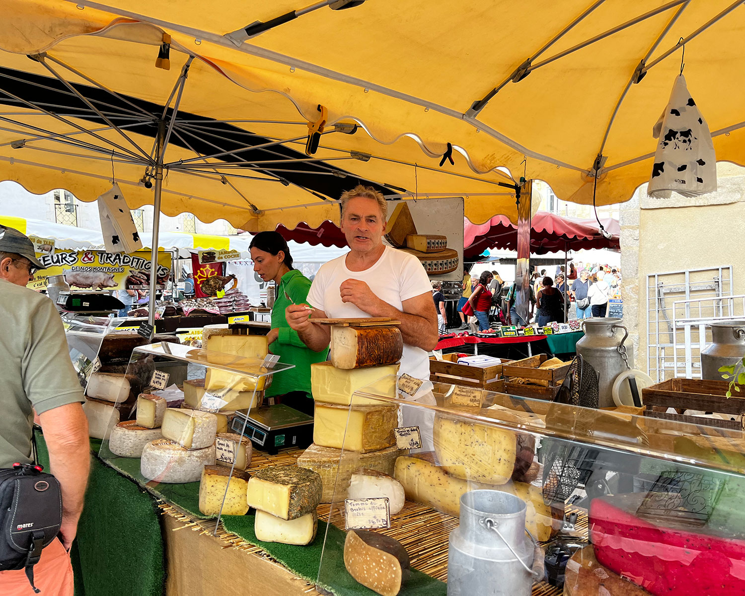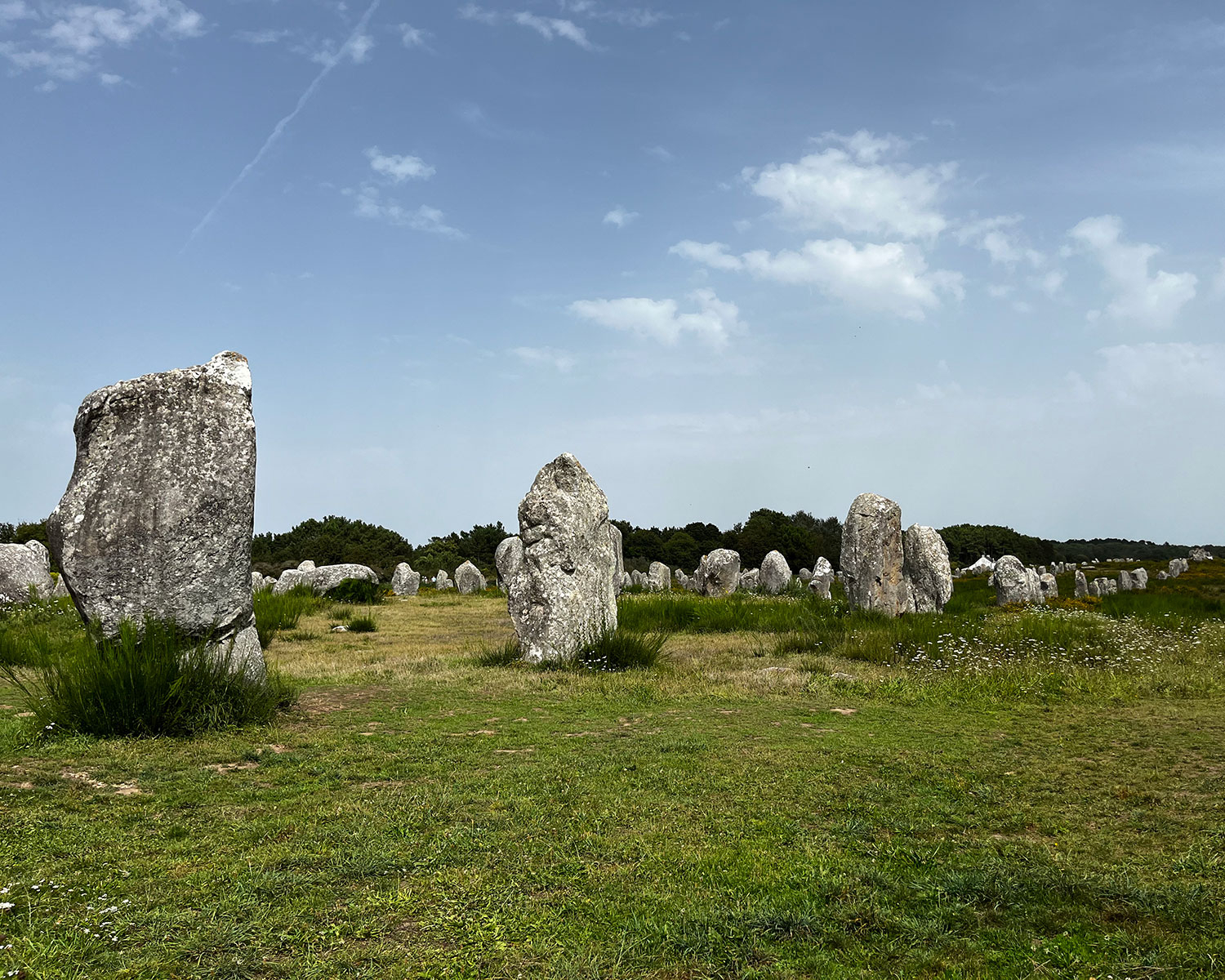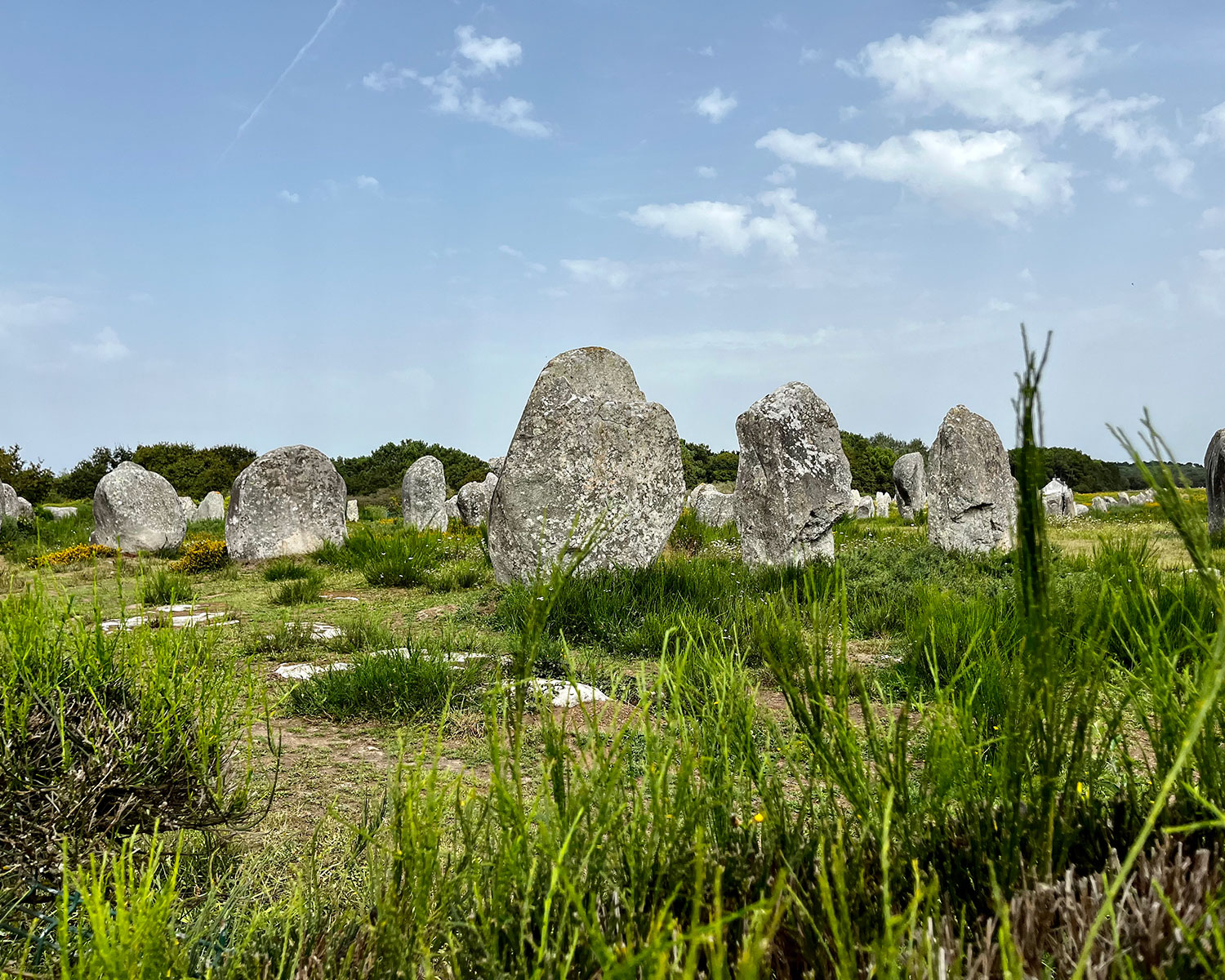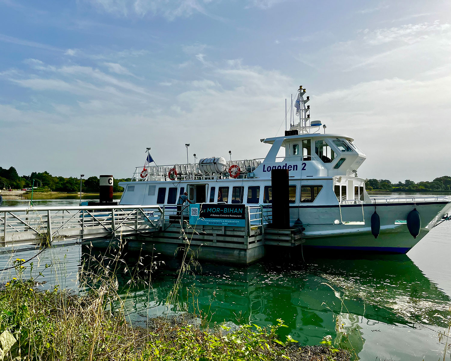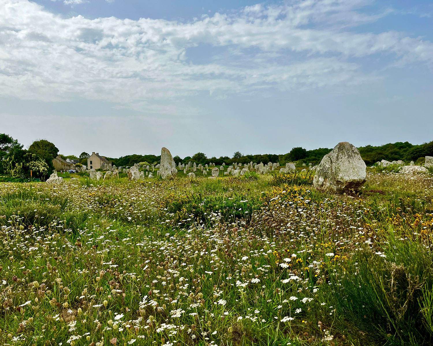 Heute findet der fakultative Ausflug statt – und alle nehmen am attraktiven Angebot teil! So fährt der Bus in gewohnter Besetzung in den Süden der Bretagne. Vorbei an Bocagen - den mit Hecken umzäunten Feldern - und an den Dörfern und Weilern. Nach zwei Stunden erreichen wir Vannes, wo uns Katharina beim Hafen aussteigen lässt. Wir haben Glück: heute ist Markt in der mit Kopfstein gepflasterten Altstadt und wir nutzen die freie Zeit, um am emsigen Treiben teilzuhaben. Es ist wahrlich ein bezauberndes Städtchen mit den farbenfrohen Riegelbauten. In einem der schmucken Cafés setze ich mich an die Sonne und lass es mir einfach gut gehen. Die Menschen sind hier ja allerliebst und eins, zwei wird man in ein Gespräch verwickelt. Leider etwas einseitig, lassen meine Französischkenntnisse doch etwas zu wünschen übrig. Kurz vor 11 Uhr fährt uns Katharina zum Hafen, von wo eine Schifffahrt geplant ist. So tuckern wir bei strahlendem Sonnenschein im Golf von Morbihan herum. Im Binnenmeer, das durch einen Kanal mit dem Atlantik verbunden ist, liegen 42 grosse und kleine Inseln verstreut – die einen sind privat, dürfen aber nicht bebaut werden. Im Westen bei Locmariaquer verlassen wir das Schiff, wo stets eine willkommene Brise geweht hatte.