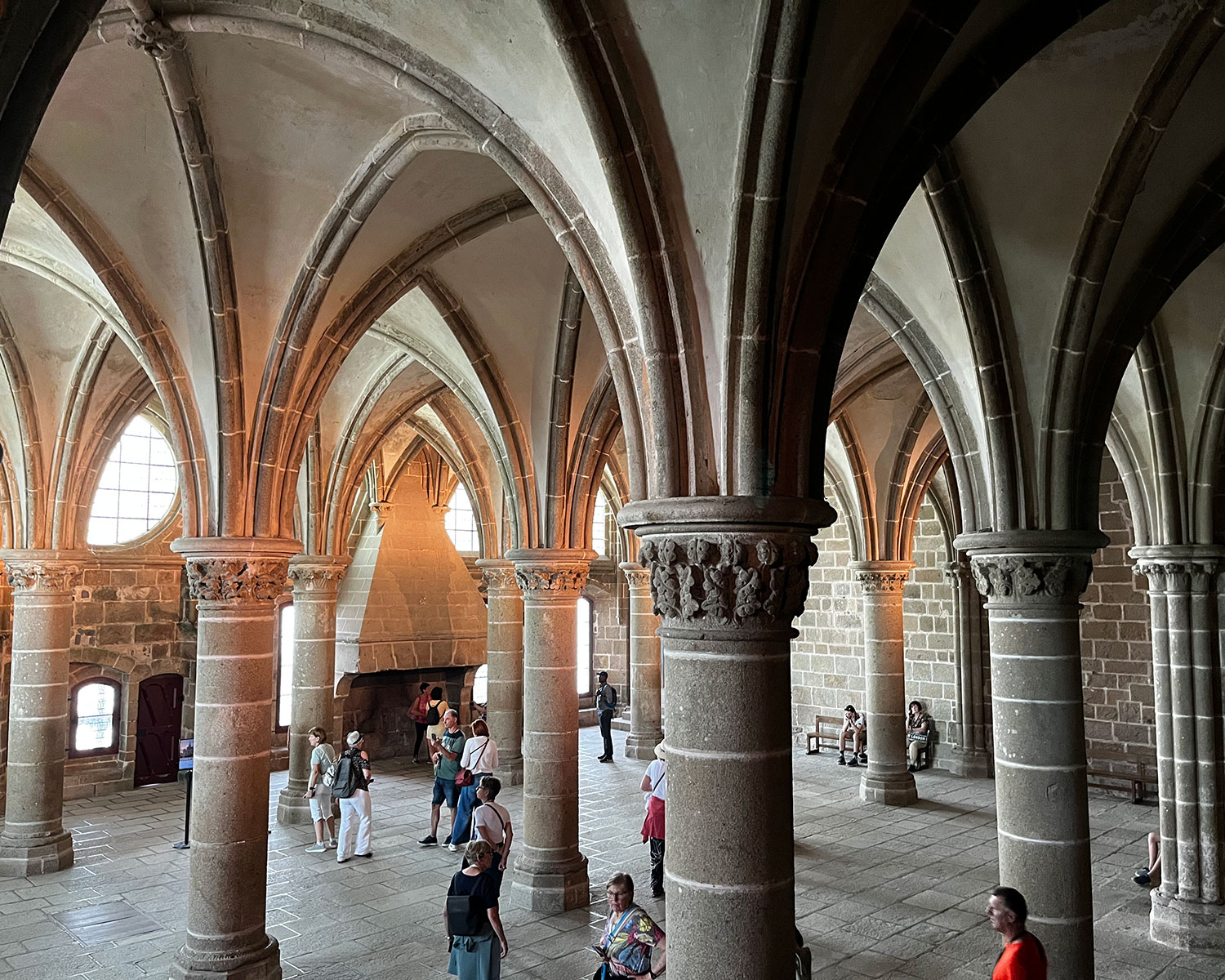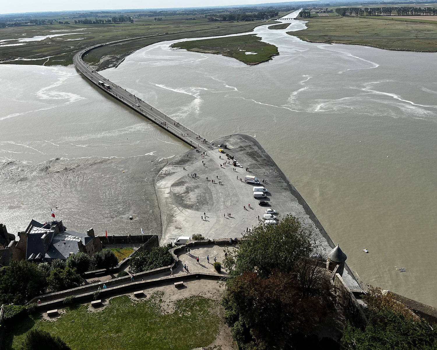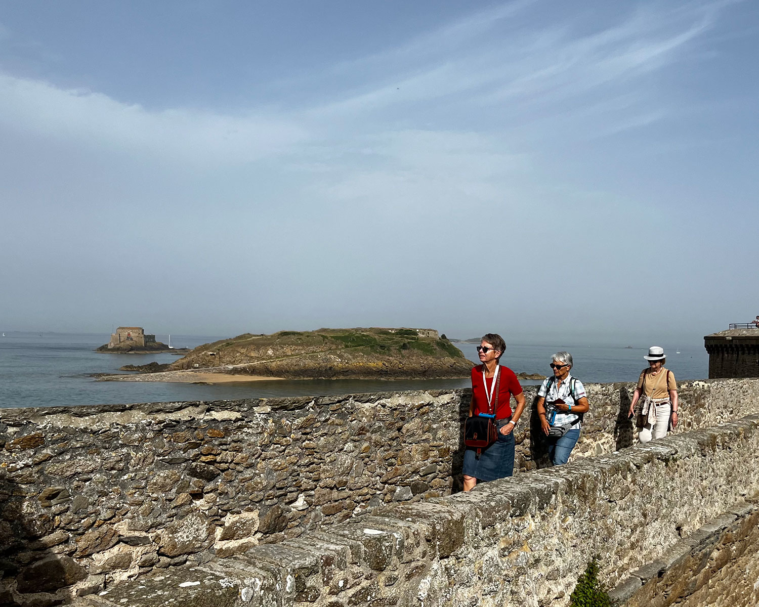 Der Programmhöhepunkt heute: Le Mont-Saint-Michel auf dem Klosterberg mit seiner Bucht, die die stärksten Gezeiten Europas hat. Schon von Weitem ist das beeindruckende Bauwerk sichtbar. Natalie ist unsere Reiseleiterin vor Ort. Sie erwartet uns in Beauvoir beim Parkplatz, um von dort mit einem Shuttlebus zur Insel zu gelangen. Wir sind zeitig unterwegs und deshalb hält sich der Ansturm zum weltbekannten Touristenmagnet in Grenzen. Nach der zehnminütigen Fahrt über die moderne Zufahrtsstrasse spazieren wir gemütlich durch malerische, schmale und sehr steile Gassen. Die Abtei mit ihren Türmen, Toren und Arkaden ist während einer Bauzeit von über 400 Jahren errichtet worden. Von der Westterrasse aus haben wir eine fantastische Weitsicht auf die Bucht mit den faszinierenden Farben des Meeres, Sandbänken und die Polder (Landschaft, das dem Meer durch Deichbau abgewonnen wurde). Der Abstieg erfolgt durch ummauerte Gärten mit duftenden Blumen und Sträuchern. Nach rund zwei Stunden Führung verabschiedet sich Natalie; sie wird uns morgen wieder begleiten. So besorgt sich nun jeder etwas fürs leibliche Wohl, bevor es zurück zum Parkplatz auf dem Festland geht. Wegen der heissen Temperaturen mit 34 Grad nutzen die meisten den Shuttlebus, der fleissig hin und her pendelt. Ich selbst nehme die zwei Kilometer zu Fuss in Angriff – die Hitze macht mir nichts aus. Eine Reisekollegin sorgt sich um mich und gibt mir ihren Hut mit auf den Weg, was sich als sehr klug erweist.