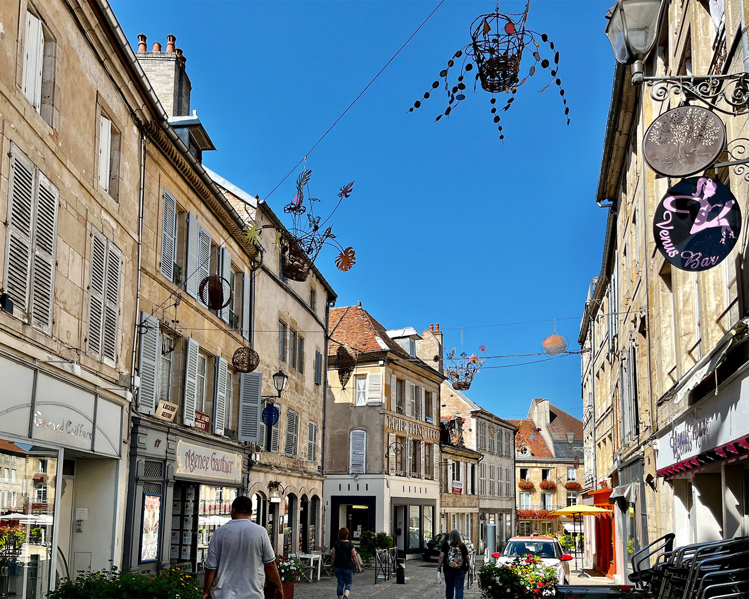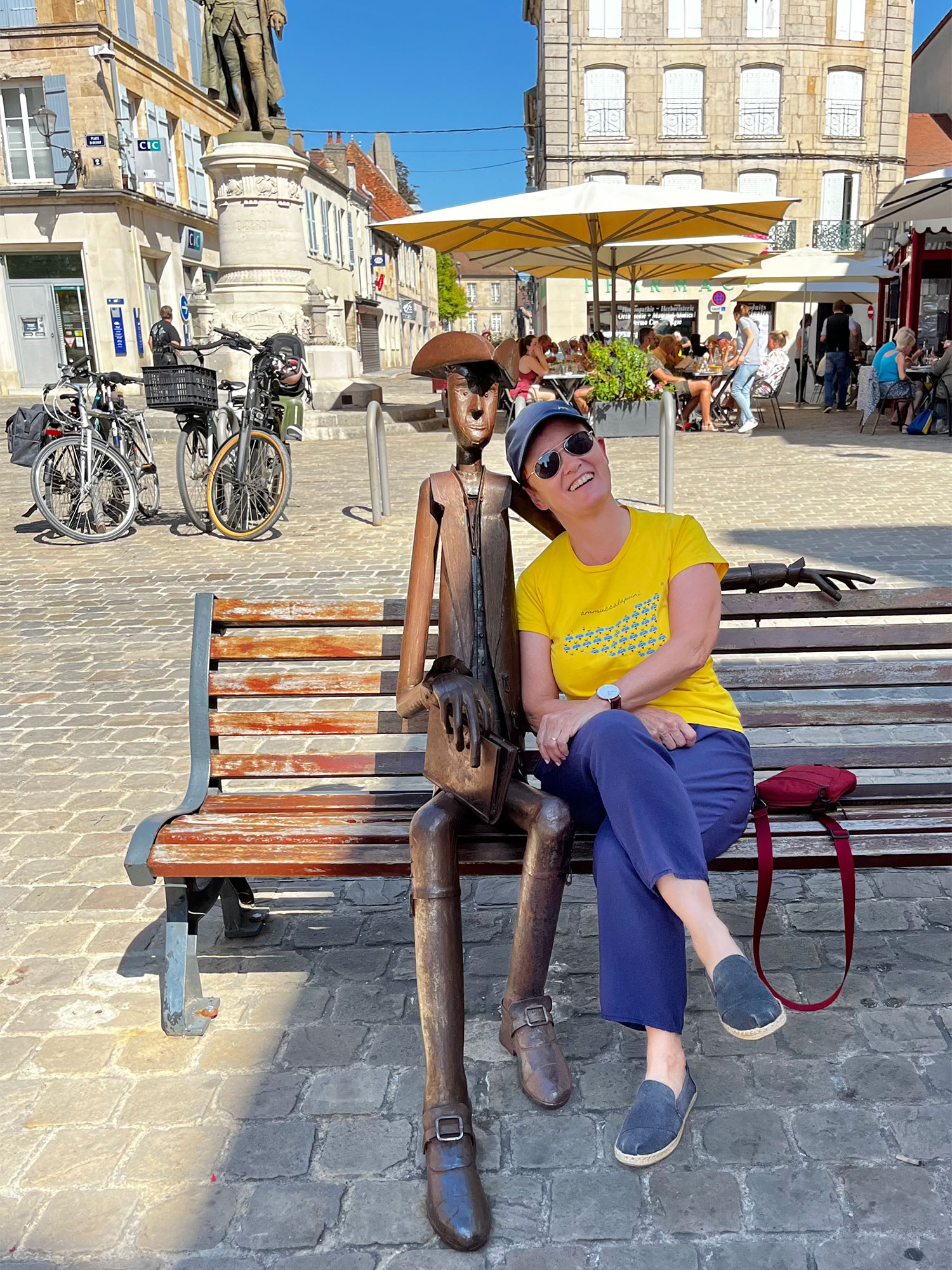 Rund 650 km liegen vor uns – ein weiter Weg. Katharina wählt die Route über Troyes nach Langres, wo wir dann die Mittagspause verbringen. Selbstverständlich hat sie über Troyes Spannendes zu berichten. Über den französischen Tennisspieler René Lacoste mit den weltberühmten Poloshirts, die auch heute noch in Troyes produziert werden und über die immer wechselnde Landschaft von flach zu hügelig; vorbei an Rebbergen der südlichen Champagne. Als wir in der Nähe von Colombay sind, erfahren wir, welch populärer Mann hier seine letzten Jahre verbracht hatte: Charles de Gaulle. Auch zu ihm, zu seiner politischen Karriere und seiner Familie, hat unsere Chauffeuse Erstaunliches zu erzählen.