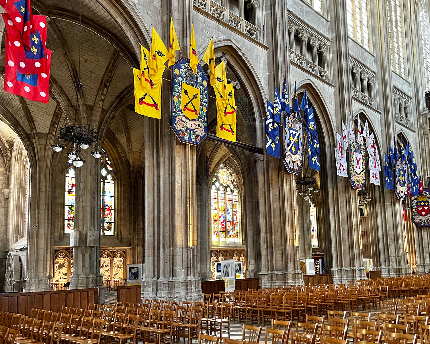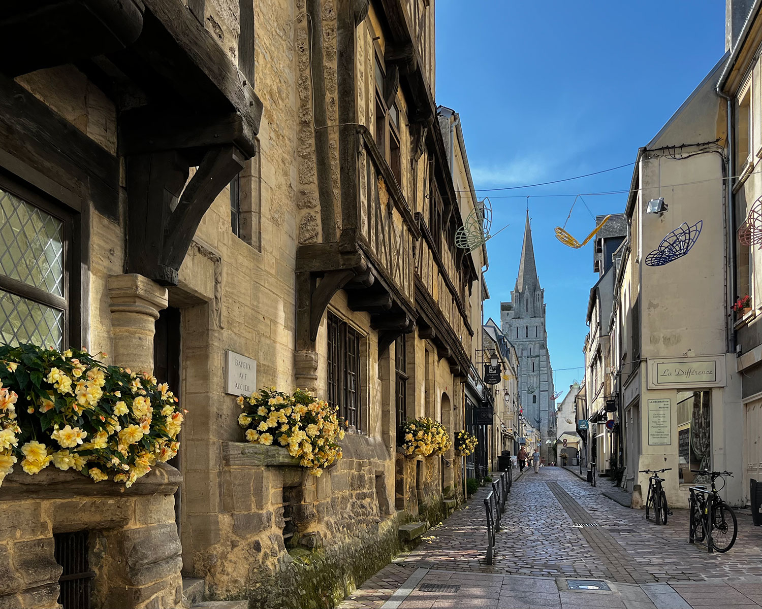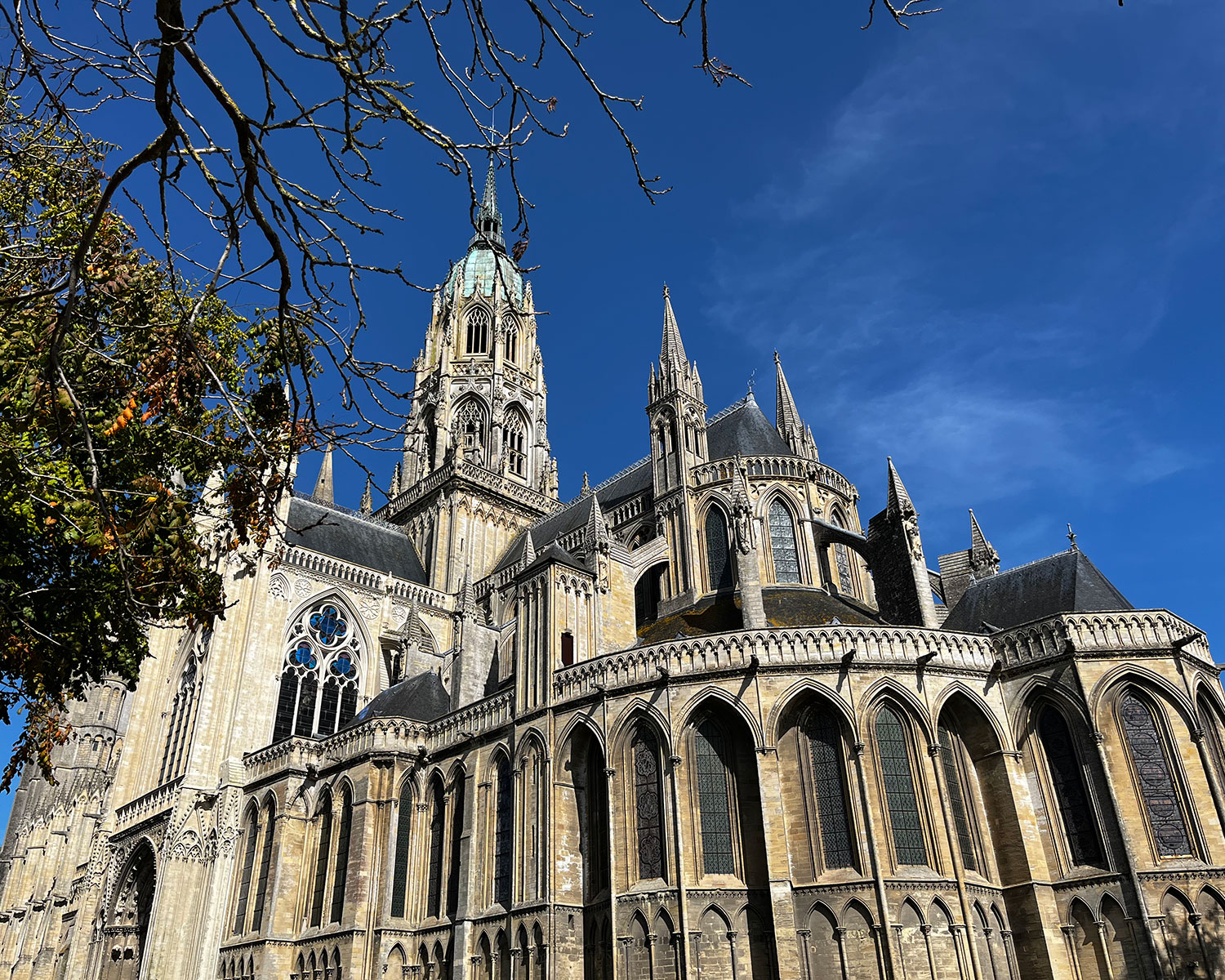 Bereits um 8 Uhr in der «Früh» sitzen wir im Bus und fahren 300 km Richtung Caen. Unterwegs besuchen wir das hübsche Städtchen Bayeux mit seinen malerischen Gassen und der prächtigen Kathedrale im Zentrum. Von dort ist man mit wenigen Schritten auch beim Musée de la Tapisserie, wo der legendäre Wandteppich von Bayeux von fast 70m Länge besichtigt werden kann. Eigentlich ist es kein Teppich, sondern eine Stickarbeit aus dem 11. Jahrhundert. In der pittoresken Altstadt verbringen wir auch die Mittagspause und wer Glück hat, ergattert einen der wenigen Schattenplätze draussen – mit einem «Croque Monsieur» sitze ich an eben einem solch begehrten Plätzchen und werde sehr charmant bedient.