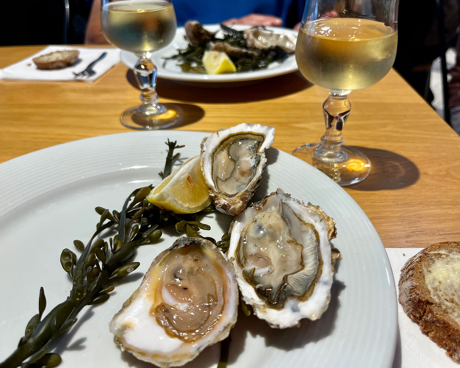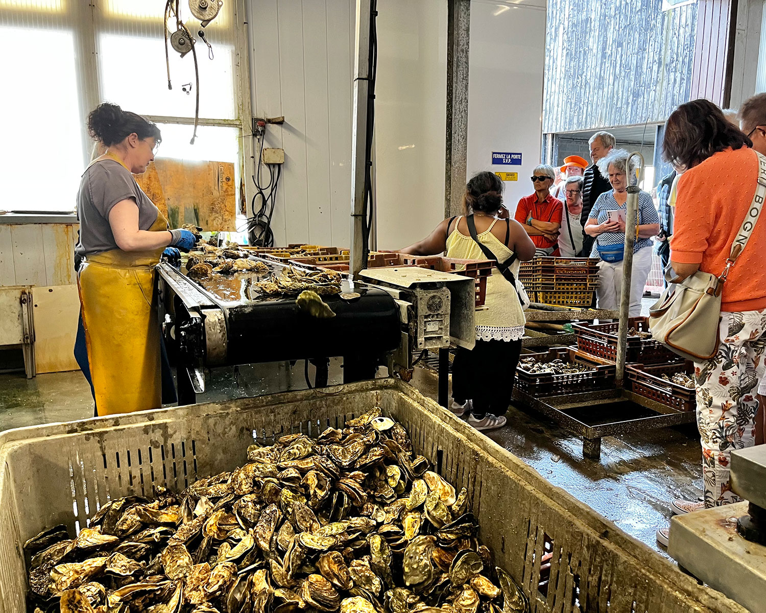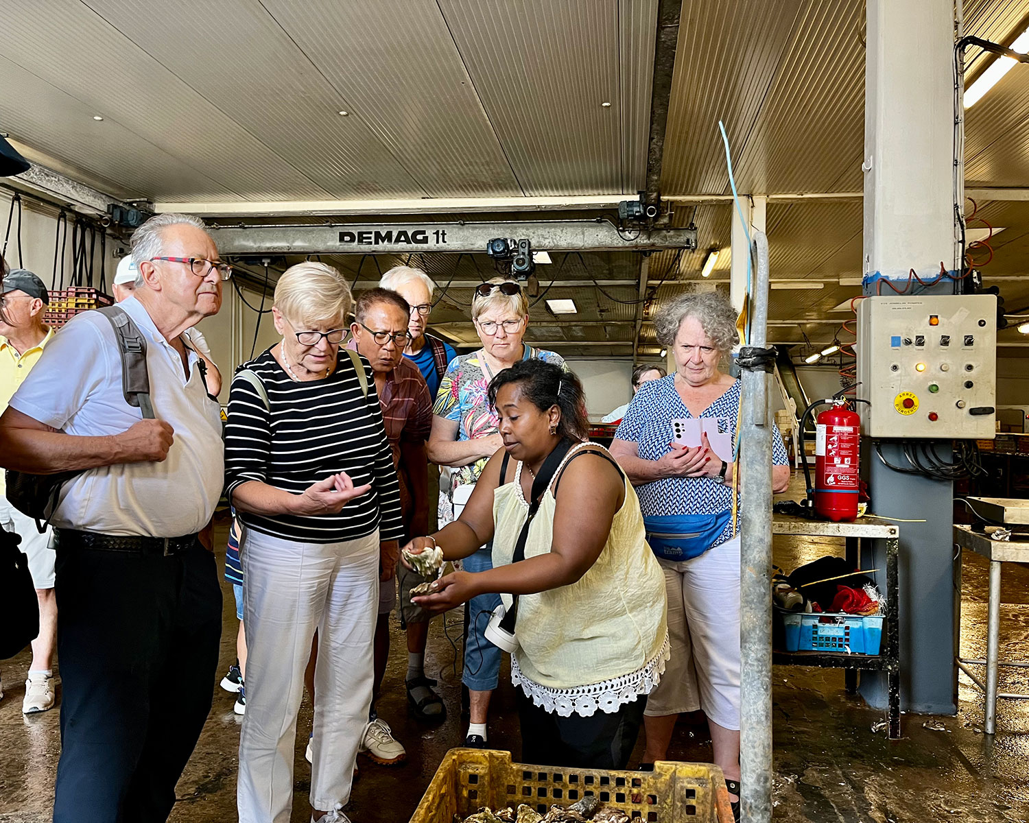 Gemeinsam fahren wir nun ins bretonische Cancale, wo wir eine Austernzucht besuchen. Eine aussergewöhnlich lustige Führerin vermittelt uns mit ihrer Singsangstimme so viel Spannendes. Wir staunen wie arbeitsintensiv diese Zucht ist und wieviel Herzblut und Fingerspitzengefühl der Mitarbeitenden dazugehört. Zum Abschluss probieren wir diese Köstlichkeiten im Degustationsraum: Austern und Weisswein – mit Wonne lassen wir uns hier nieder!