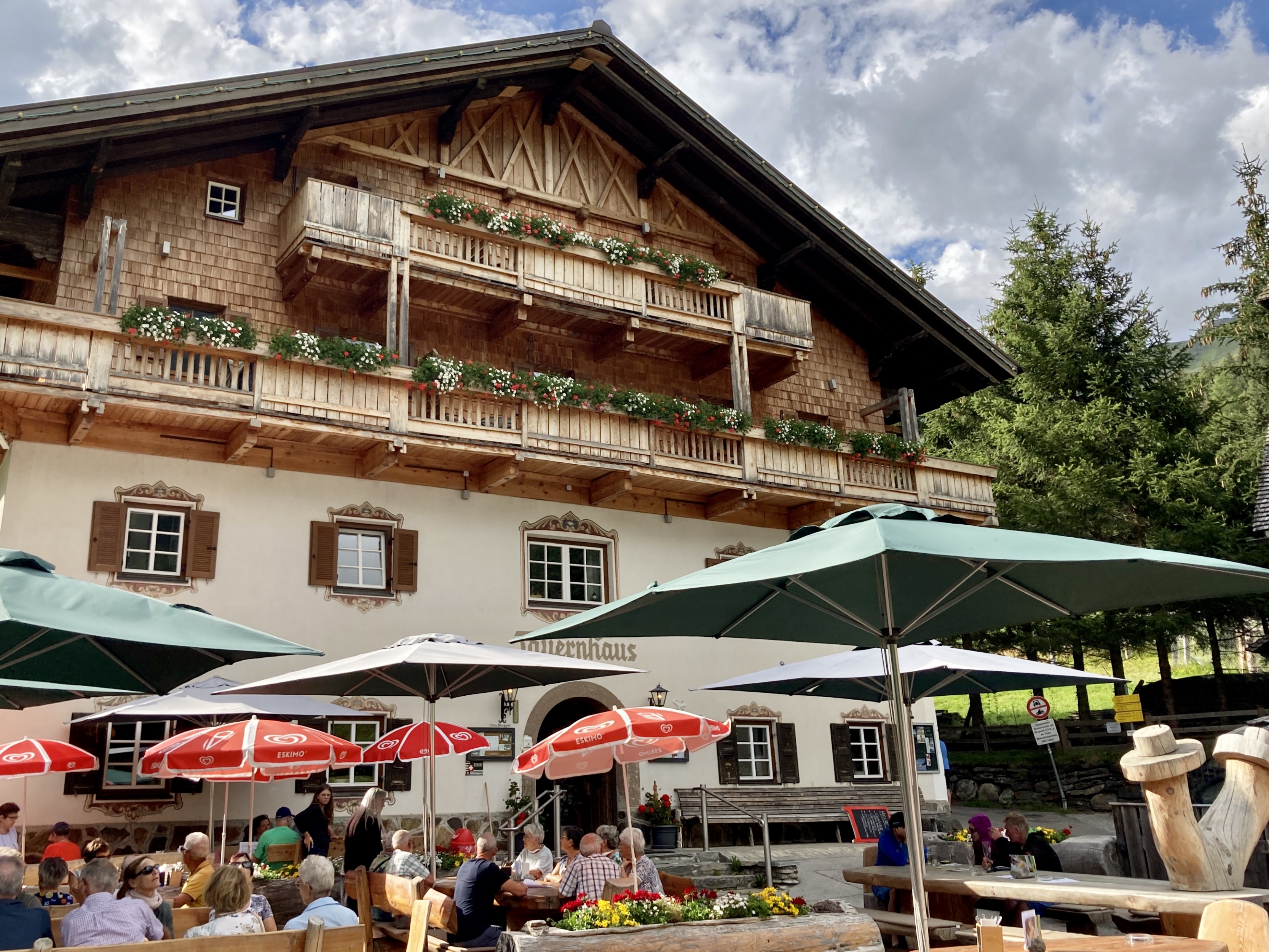 Bei Diepoldsau verlassen wir die Schweiz und fahren bei sonnigem Wetter durch Vorarlberg. In Hohenems gibt es eine erste Kaffeepause und man sieht hier auch einmal alle Fahrgäste. Da ich erst in Wiesendangen zugestiegen bin, konnte ich die Gesichter hinter den Schutzmasken noch nicht erkennen. Gross ist deshalb die Freude, ein paar ehemalige Mitreisende der Velotour in Sardinien zu entdecken. Es ergeben sich immer wieder solche Begegnungen, denn Twerenbold hat eine überaus treue Kundschaft. Über kurvenreiche Strassen, vorbei an unzähligen bekannten Orten wie St. Anton, dem Pitztal und Ötztal geht’s Richtung Innsbruck. Lothar macht mit uns eine kurze Stadtrundfahrt und hat auch hier unzählige Informationen für uns bereit. Eine halbe Stunde später, bereits im Tirol, haben wir unsere Mittagsrast beim «Bucherwirt». Zack, zack und schon hat jeder sein Mittagsmenu auf dem Tisch. Die Portionen sind riesig und vor lauter Nichtstun sind einige von uns fast etwas überfordert.
