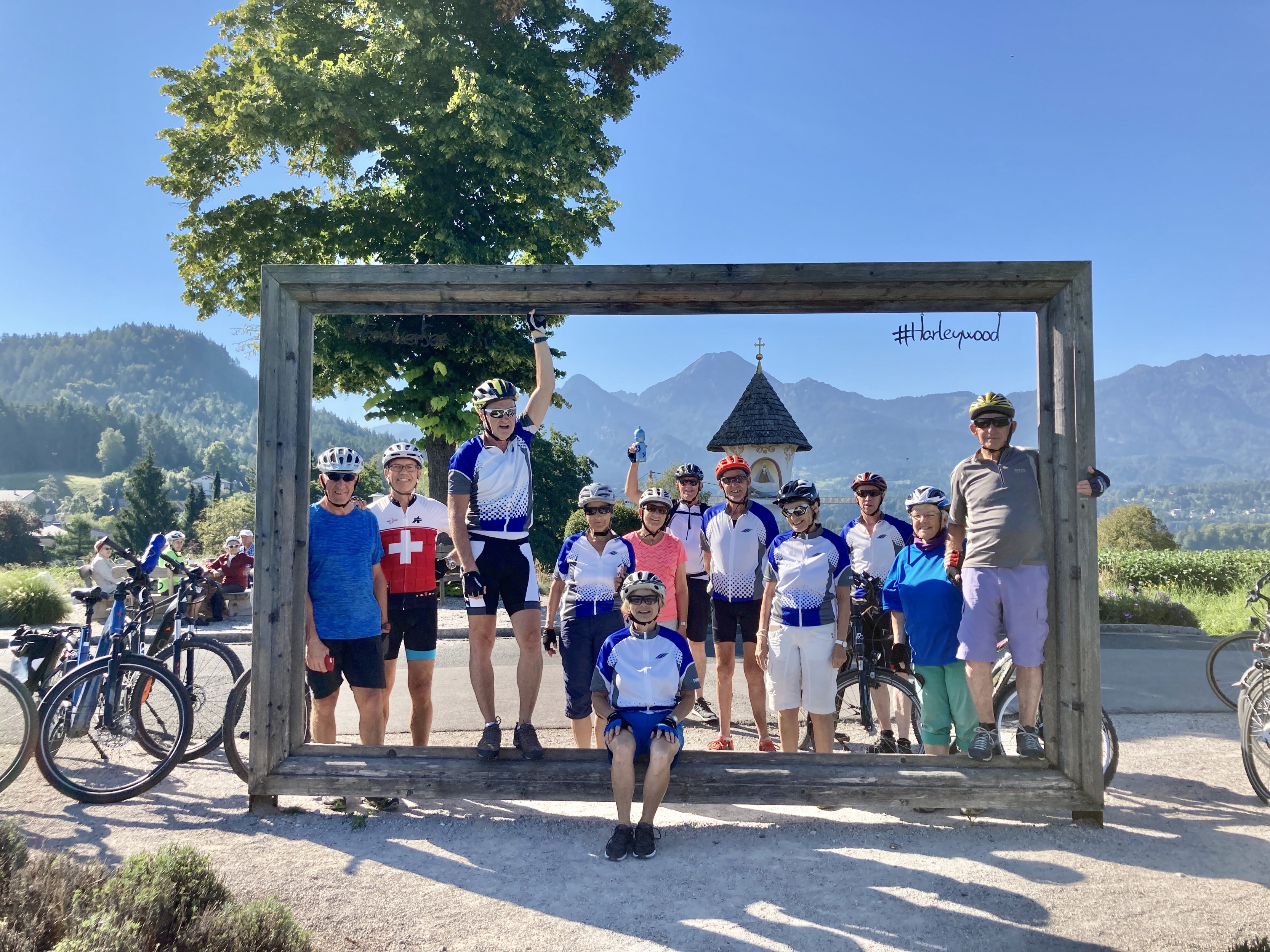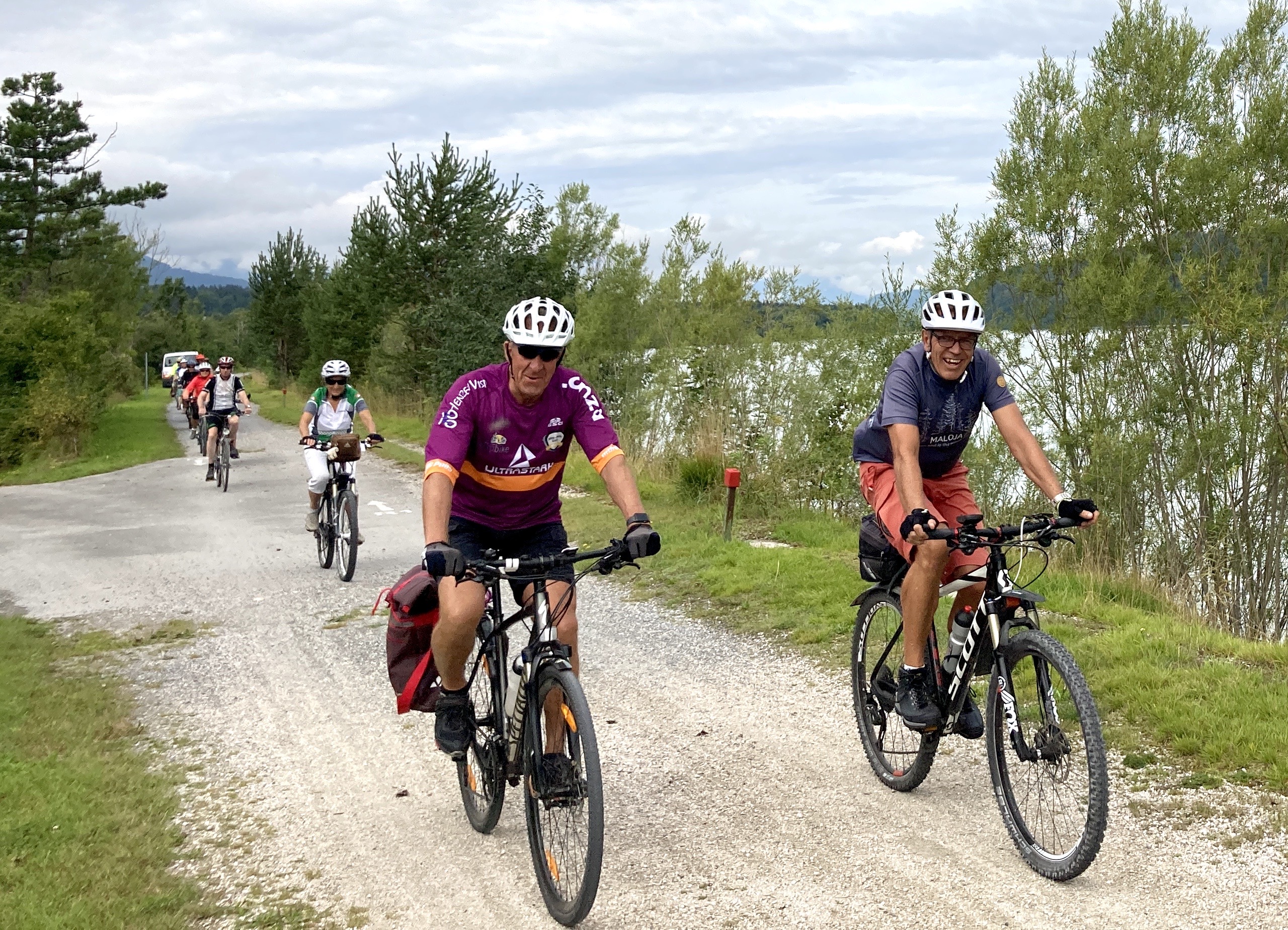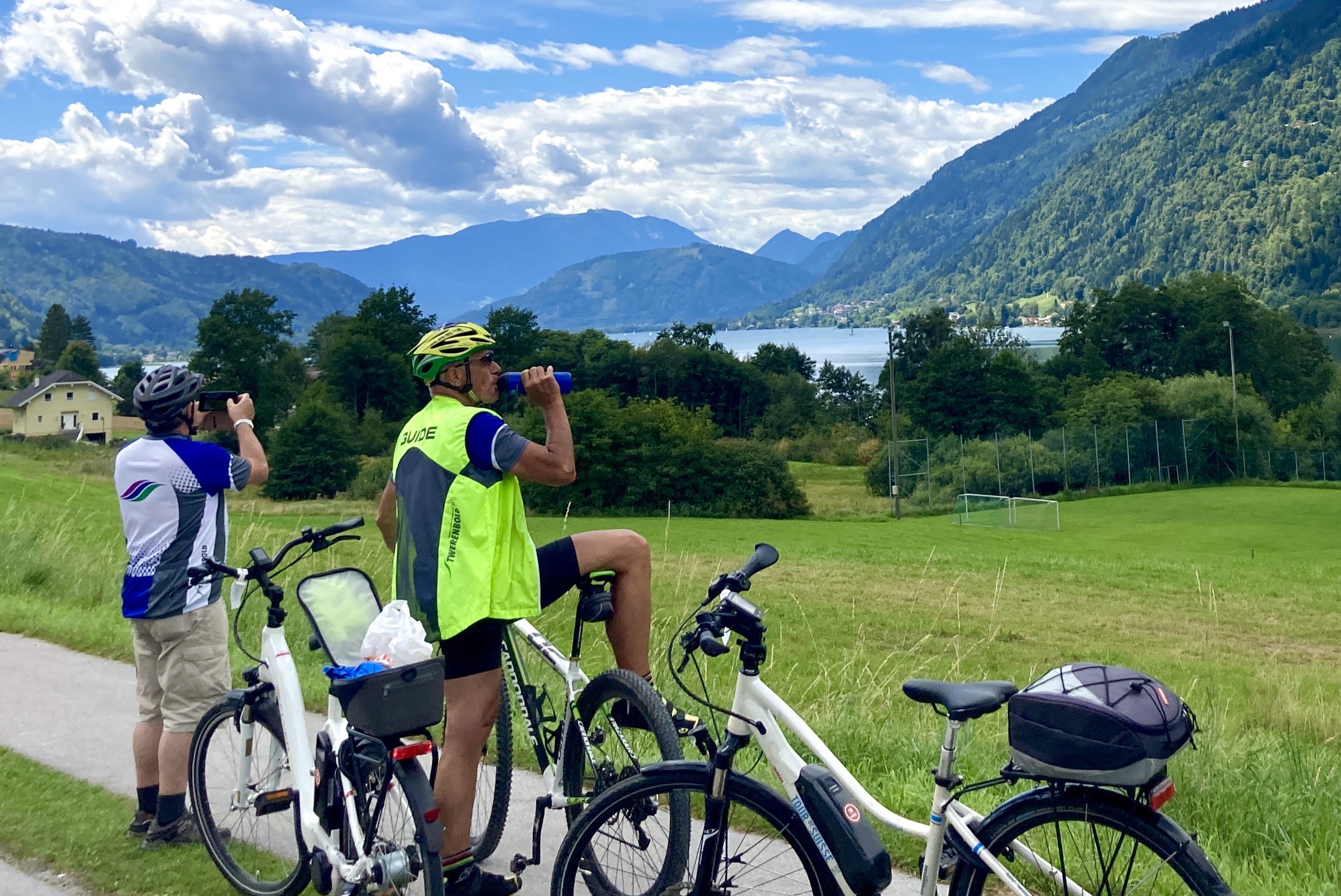 Unser tolles Frühstück können wir mit Blick auf Berg und See geniessen – fantastisch! So radeln wir gestärkt vom Hotel aus Richtung St. Jakob im Rosental. Am Feistritzer Stausee machen wir eine Kaffeepause auf der sonnigen Terrasse und fahren weiter der Drau entlang – ab und zu eine kleine Steigung inbegriffen – nach Klagenfurt. Durch das Industriegebiet gelangen wir alle irgendwann in die Altstadt, wo jeder individuell seine Mittagspause verbringen kann. Etwas kritisch scheint uns das Wetter und so entscheiden die einen Gäste, mit unserem Bus zurück zum Hotel zu fahren. Die Regenwolken kommen immer näher. Aber was soll’s. Wir fahren optimistisch los. Schon nach wenigen hundert Metern werden wir zünftig verregnet. Schnell unterstehen und Regenkleidung montieren. Aber alles nur halb so schlimm – bald drückt wieder die Sonne durch. Im sehr hübschen Ort Velden fahren wir durch die sehr gepflegte Innenstadt direkt zum Bus, der uns beim Sportplatz erwartet. Joe fährt mit einer kleinen Gruppe auch noch die letzten zehn Kilometer mit dem Velo zum Hotel. So ist das heutige Velopensum fast 100 km, natürlich die meisten mit «E»-Unterstützung.