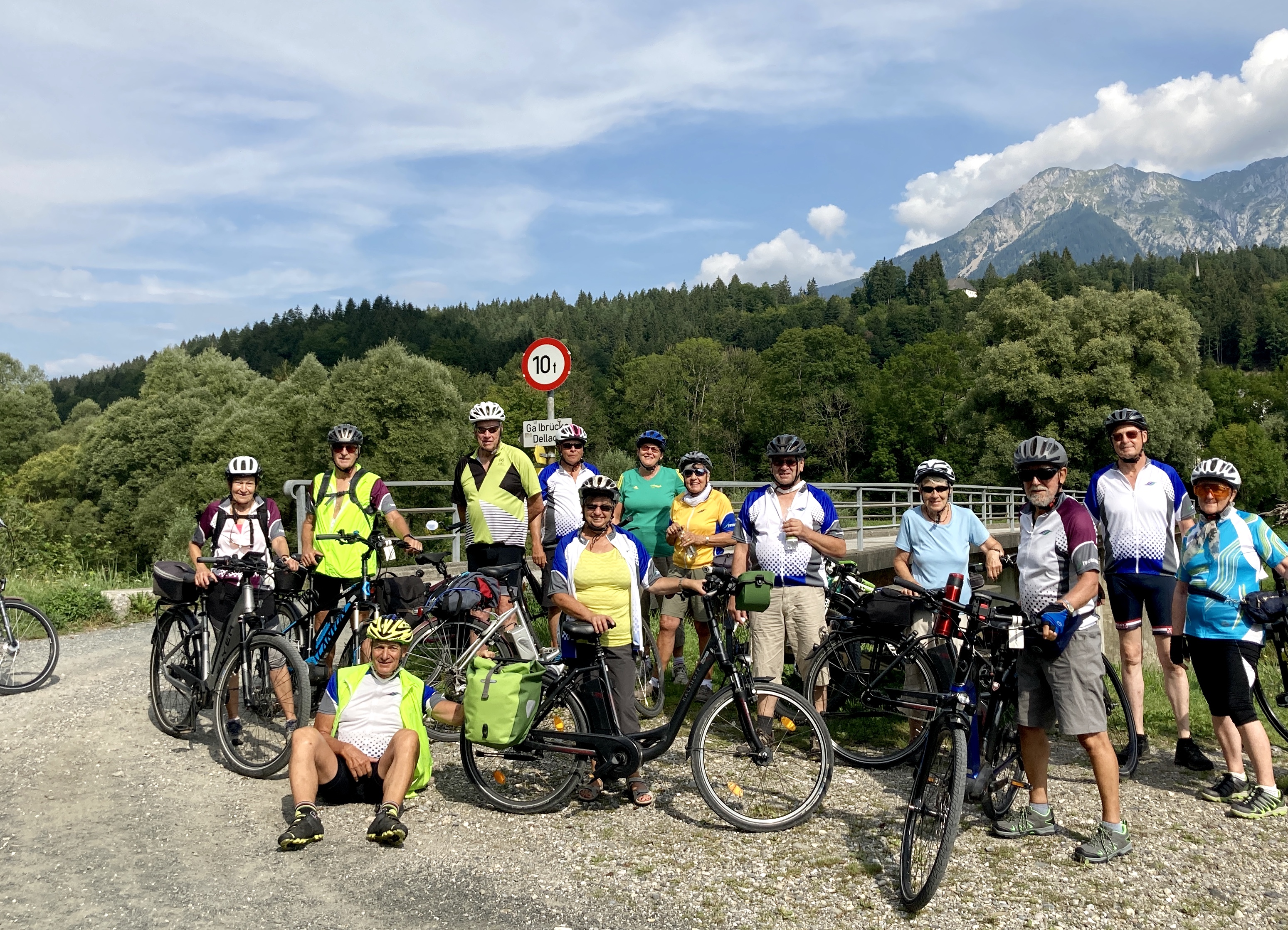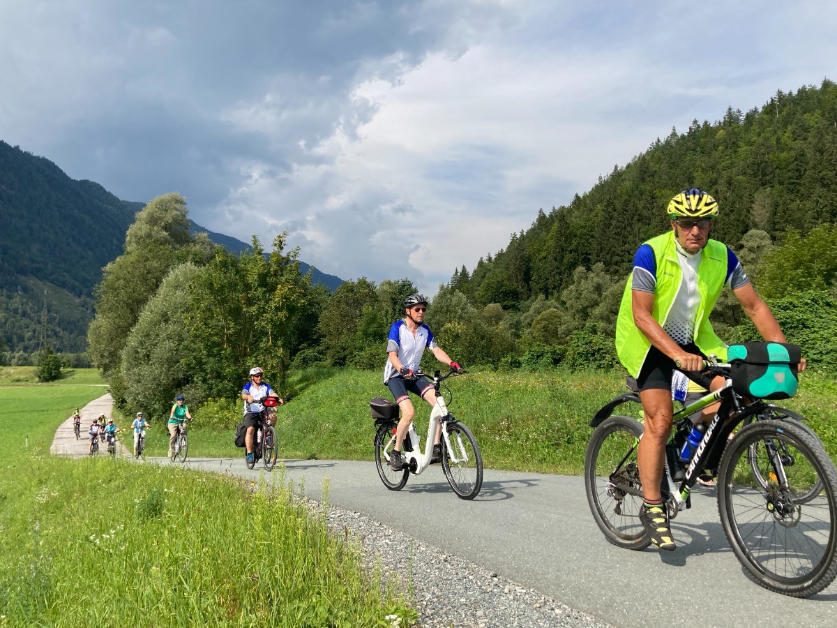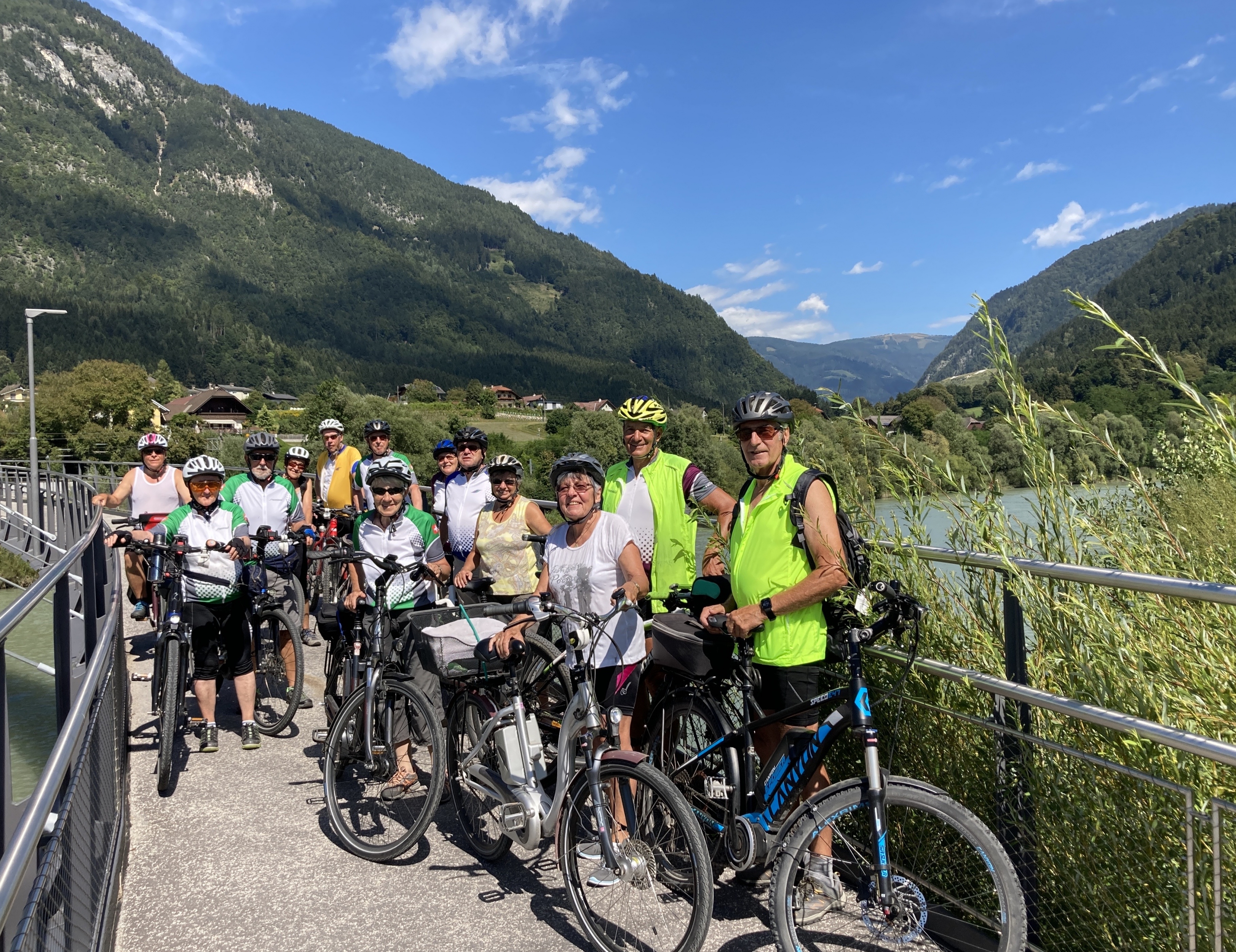 Pünktlich um 8.30 Uhr führt uns Lothar nach Hermagor, wo wir auf unser Bike steigen. Die meisten Gäste hatten ihr eigenes Velo mitgenommen. So muss nicht viel Zeit fürs Einstellen aufgewendet werden und es geht alsbald dem Fluss «Gail» entlang durch das gleichnamige Tal. Über meist flache, schattige Waldwege ist es sehr angenehm zum Radeln. Plötzlich ziehen dunkle Wolken auf und schwupps fängt es an zu regnen. Joe, der Leiter der gemütlichen Gruppe radelt zügig weiter, denn er weiss, nur wenige Minuten später sind wir schon beim Naturbad Vorderberg, wo wir einkehren können. Dort verweilen wir etwas länger und tatsächlich, der Regen geht, wie er gekommen ist – Glück gehabt! Der Regenschutz kann also schon wieder ungebraucht verstaut werden. Im gemässigten Tempo, sehr bequem mit E-Bikes, fahren wir zum Mittagessen nach Arnoldstein, wo wir in einer Gartenwirtschaft etwas «Kleines» essen wollen. Das junge Personal serviert spritzig und charmant. Noch ein letztes Stück der «Gail» entlang und dann biegen wir ab Richtung Faaker See. Hier ist Schluss mit Ruhe und Gemütlichkeit. Rund um den See herrscht Hochbetrieb – von Corona-Schutzmassnahmen keine Spur ... Gerne kehren wir in einer der Bars direkt am See ein – Ferienstimmung pur! Nur noch rund 4 Kilometer trennen uns bis zum Hotel Melcher. Ein kleiner letzter Aufstieg und einer wohlverdienten Dusche steht nichts mehr im Wege. Ziemlich genau 65 km haben wir heute geschafft. Bevor es zum wohlverdienten Nachtessen geht, stossen wir mit einem Apéro auf die bevorstehende Woche an.