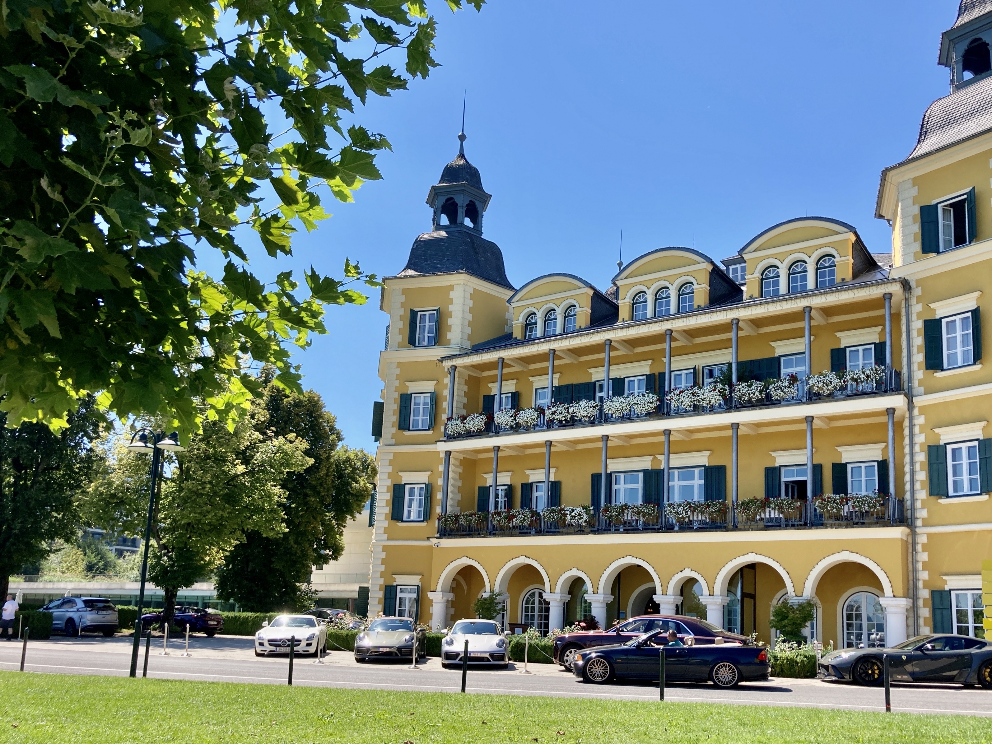 Alle Velos werden nun in den Bus verladen, denn wir verbringen den restlichen Tag relaxed am und auf dem Wörthersee. Die Mittagspause in Velden gestaltet jeder individuell in kleinen Gruppen. Pünktlich um 13.45 Uhr sollen wir uns beim neu enthüllten Roy Black-Denkmal treffen. Ohne Frage – wir sind enttäuscht, denn wir sehen absolut keine Ähnlichkeit zum Schlagersänger, der vor 20 Jahren verstorben ist. Schräg gegenüber steht das weltberühmte Schlosshotel, vor dem ausschliesslich Luxuskarossen geparkt sind. Die prominent besetzte Promenade am Wörthersee wird von Gästen auch gerne liebevoll die Karawanken-Côte d’Azur genannt. Denn schon Romy Schneider, Gunter Sachs und Sophia Loren tummelten sich am Kärntner Sommer-Hotspot, wo sich vor allem in den letzten Jahrzehnten etliche Milliardäre in Luxus-Villen niedergelassen haben.