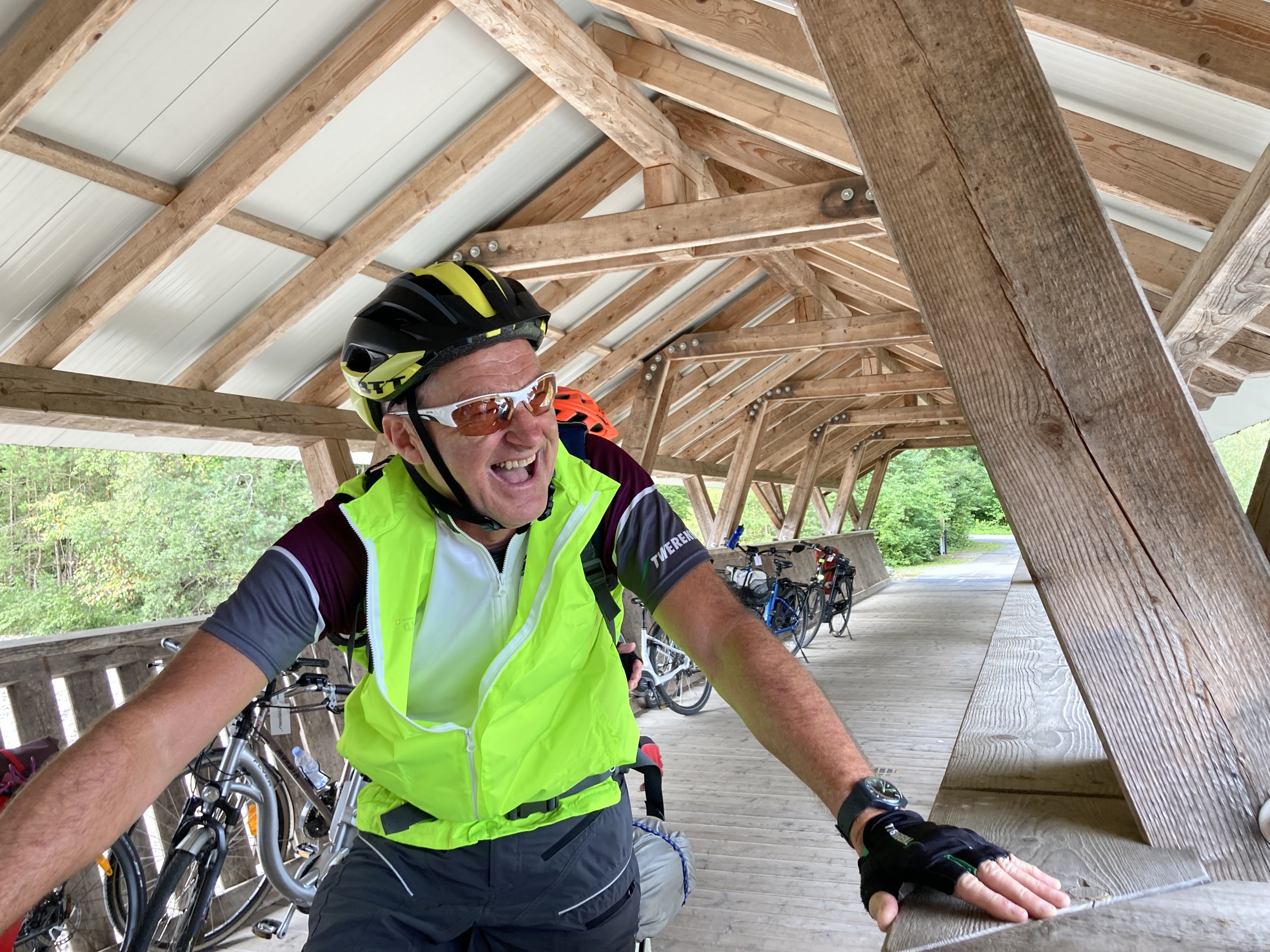 Wie glücklich war ich am Sonntagmorgen, als ich nach dem grossen Lockdown endlich wieder einmal in einem Twerenbold Bus sitzen durfte – und in was für einem: dem goldenen Jubiläumsbus. Auf den Velotouren konnte man aus zwei Stärkeklassen wählen: gemütlich und vital oder anders ausgedrückt: kurz oder lang. Da ausser drei Gästen alle mit E-Bikes fuhren, war kaum ein Unterschied spürbar vom Tempo her. Ich wechselte täglich von Gruppe Joe zu Gruppe Roberto und hatte so einen Einblick in beide Gruppen.